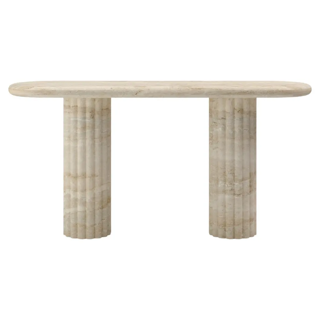 OUR MOST COVETED COLLECTION AND MODERN TWIST ON AN ANCIENT ROMAN CLASSIC. RECENTLY REFRESHED WITH A MORE PLAYFUL AND ROBUST PROFILE.DIMENSIONS:48”L x 16”W x 30”H: - 2.25" THICK TABLE TOP- 10"Ø FLUTED BASE(S) WITH 2" FLUTES- 6.25"Ø CUTOUT IN TABLE TOP WITH 6"Ø INTERLOCK ON BASECONSTRUCTION:TABLE TOP: - 3/4”x 3 SLABS WITH FULL BULLNOSE- HOLE IN TABLE TOP INTERLOCKS WITH BASE OF TABLEBASE:- HOLLOW CONSTRUCTION USING 3/4” STONE SLAB- FELT LINING TO BOTTOM OF BASE FOR FLOOR PROTECTION- STONE FINISH TO TOP OF BASEWEIGHT:48”L x 16”W x 30”H: - GROSS WEIGHT INCLUDING WOOD CRATE 474LBS