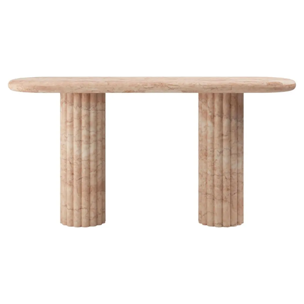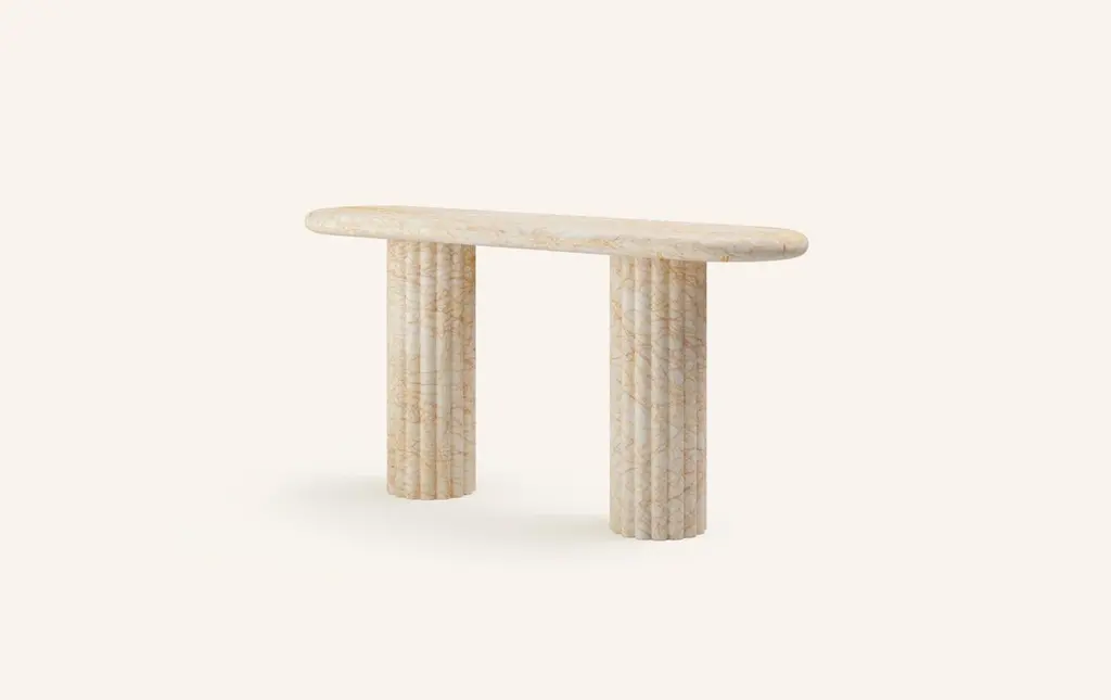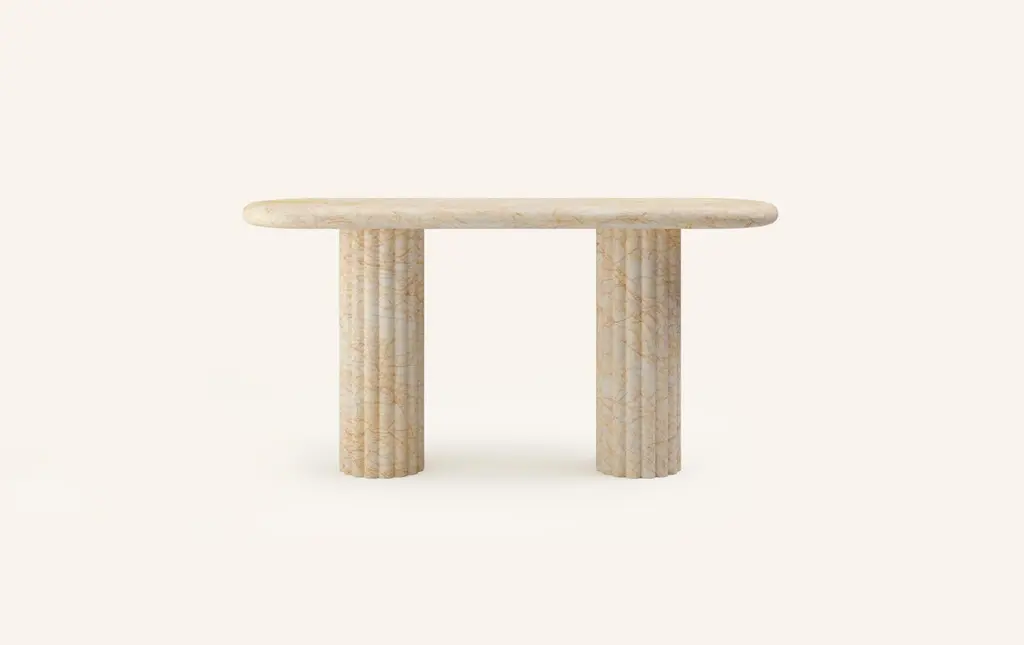 OUR MOST COVETED COLLECTION AND MODERN TWIST ON AN ANCIENT ROMAN CLASSIC. RECENTLY REFRESHED WITH A MORE PLAYFUL AND ROBUST PROFILE.DIMENSIONS:60”L x 16”W x 30”H: - 2.25" THICK TABLE TOP- 10"Ø FLUTED BASE(S) WITH 2" FLUTES- 6.25"Ø CUTOUT IN TABLE TOP WITH 6"Ø INTERLOCK ON BASECONSTRUCTION:TABLE TOP: - 3/4”x 3 SLABS WITH FULL BULLNOSE- HOLE IN TABLE TOP INTERLOCKS WITH BASE OF TABLEBASE:- HOLLOW CONSTRUCTION USING 3/4” STONE SLAB- FELT LINING TO BOTTOM OF BASE FOR FLOOR PROTECTION- STONE FINISH TO TOP OF BASEWEIGHT:60”L x 16”W x 30”H:- GROSS WEIGHT INCLUDING WOOD CRATE 510LBS