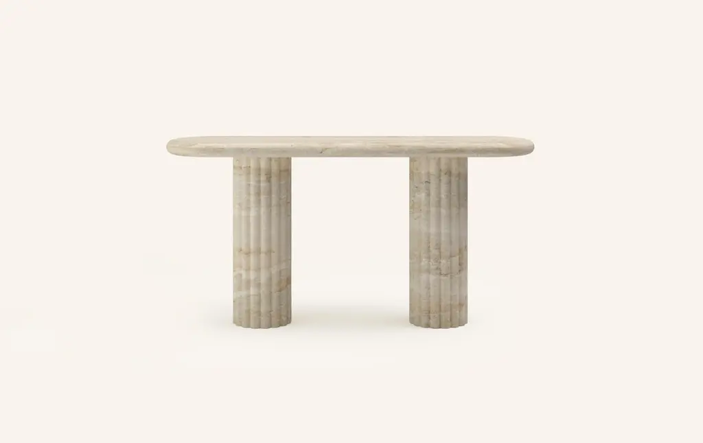 OUR MOST COVETED COLLECTION AND MODERN TWIST ON AN ANCIENT ROMAN CLASSIC. RECENTLY REFRESHED WITH A MORE PLAYFUL AND ROBUST PROFILE.DIMENSIONS:60”L x 16”W x 30”H: - 2.25" THICK TABLE TOP- 10"Ø FLUTED BASE(S) WITH 2" FLUTES- 6.25"Ø CUTOUT IN TABLE TOP WITH 6"Ø INTERLOCK ON BASECONSTRUCTION:TABLE TOP: - 3/4”x 3 SLABS WITH FULL BULLNOSE- HOLE IN TABLE TOP INTERLOCKS WITH BASE OF TABLEBASE:- HOLLOW CONSTRUCTION USING 3/4” STONE SLAB- FELT LINING TO BOTTOM OF BASE FOR FLOOR PROTECTION- STONE FINISH TO TOP OF BASEWEIGHT:60”L x 16”W x 30”H:- GROSS WEIGHT INCLUDING WOOD CRATE 510LBS