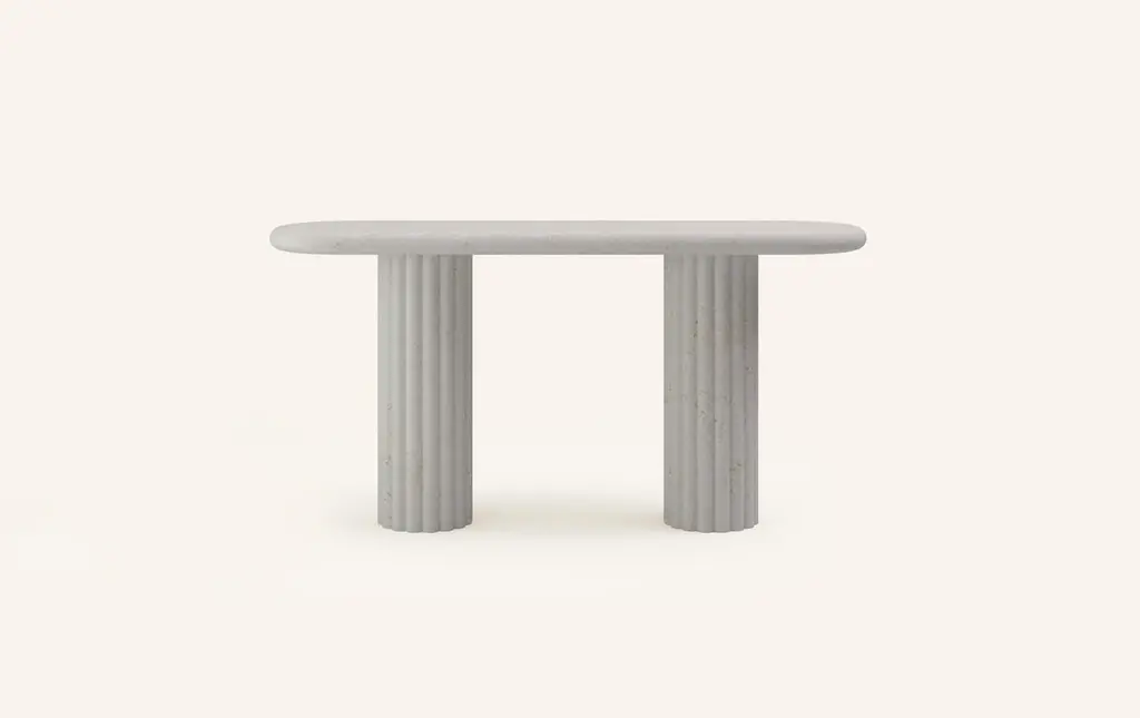OUR MOST COVETED COLLECTION AND MODERN TWIST ON AN ANCIENT ROMAN CLASSIC. RECENTLY REFRESHED WITH A MORE PLAYFUL AND ROBUST PROFILE.DIMENSIONS:72”L x 16”W x 30”H: - 2.25" THICK TABLE TOP- 10"Ø FLUTED BASE(S) WITH 2" FLUTES- 6.25"Ø CUTOUT IN TABLE TOP WITH 6"Ø INTERLOCK ON BASECONSTRUCTION:TABLE TOP: - 3/4”x 3 SLABS WITH FULL BULLNOSE- HOLE IN TABLE TOP INTERLOCKS WITH BASE OF TABLEBASE:- HOLLOW CONSTRUCTION USING 3/4” STONE SLAB- FELT LINING TO BOTTOM OF BASE FOR FLOOR PROTECTION- STONE FINISH TO TOP OF BASEWEIGHT:72”L x 16”W x 30”H:- GROSS WEIGHT INCLUDING WOOD CRATE 600LBS