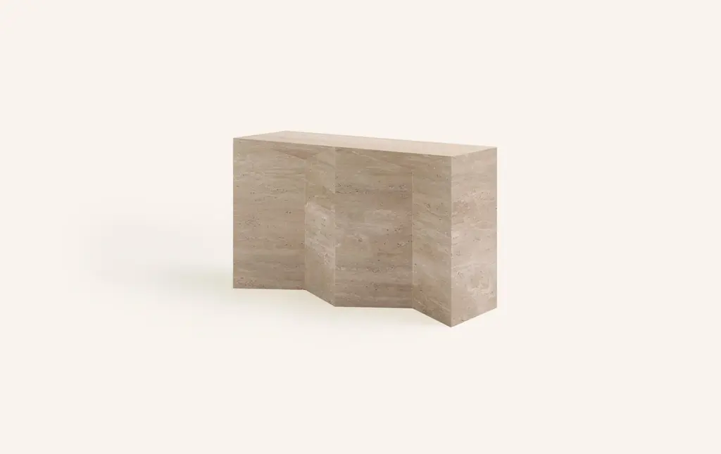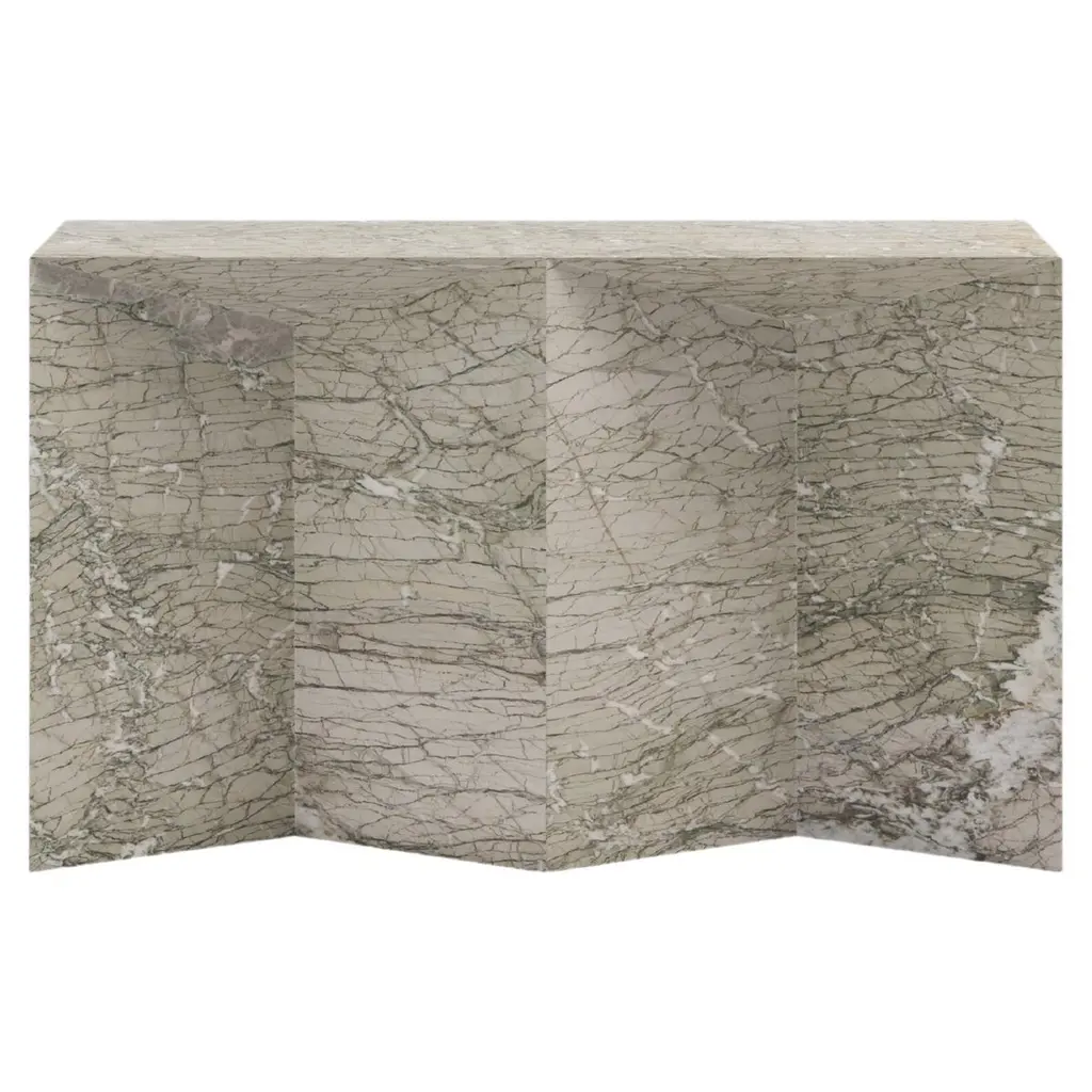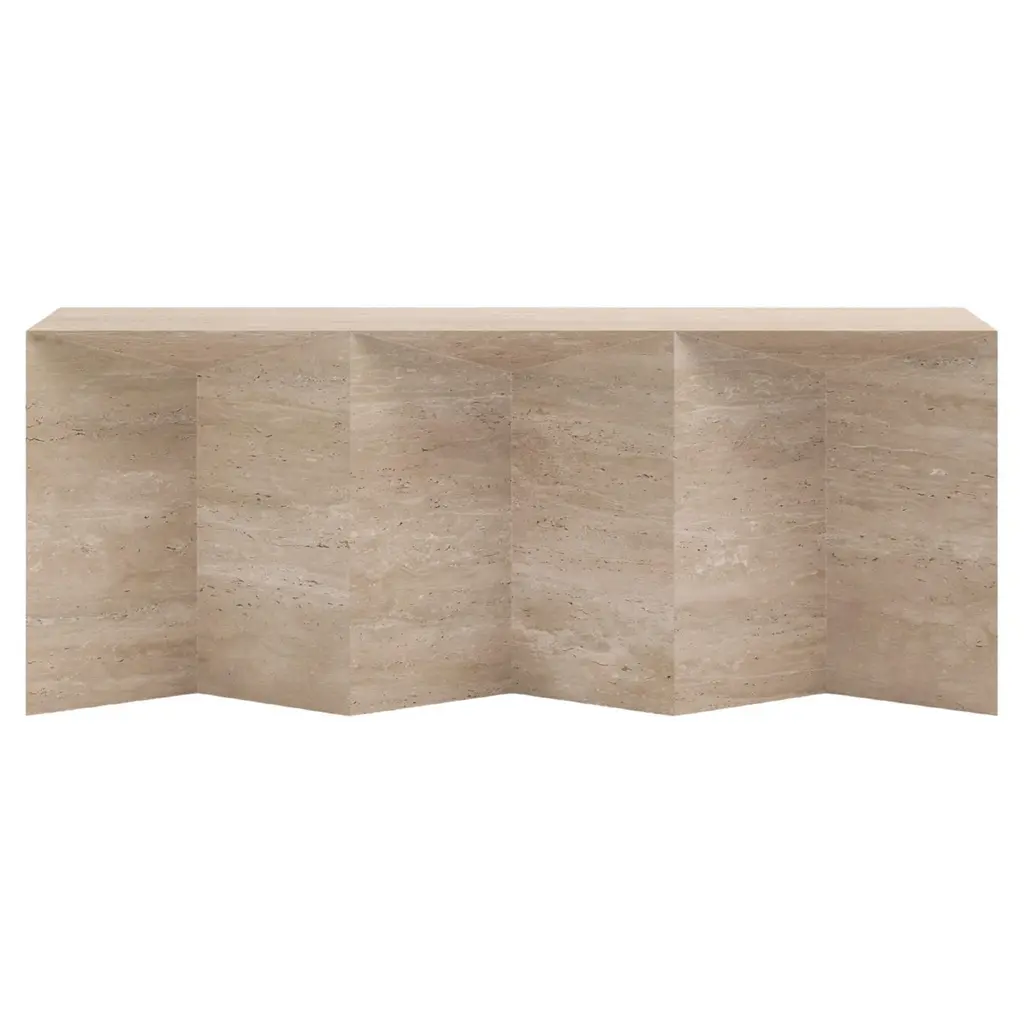 A BOLD AND EXPRESSIVE FORM WHERE GEOMETRY AND HARMONY COLLIDE. ITALIAN FOR WRINKLE, 'GRINZA'S ZIG-ZAG STRUCTURE' IS BOTH TIMELESS AND ELEGANT. DIMENSIONS:48”L x 16”W x 32”H: - WRINKLED BASE WITH 12" FOLDSCONSTRUCTION:- 3/4" THICK TOP & BASE- HOLLOW CONSTRUCTION USING 3/4” STONE SLAB- FELT LINING TO BOTTOM OF BASE AND BACK OF CONSOLE FOR FLOOR & WALL PROTECTIONWEIGHT:48”L x 16”W x 32”H: - GROSS WEIGHT INCLUDING WOOD CRATE 315LBS