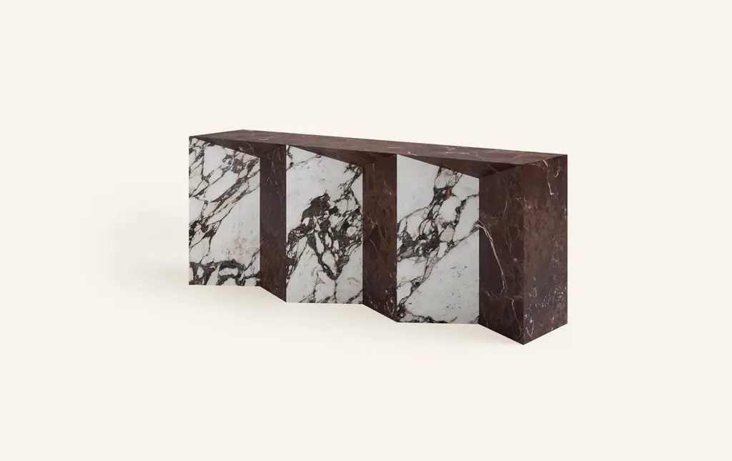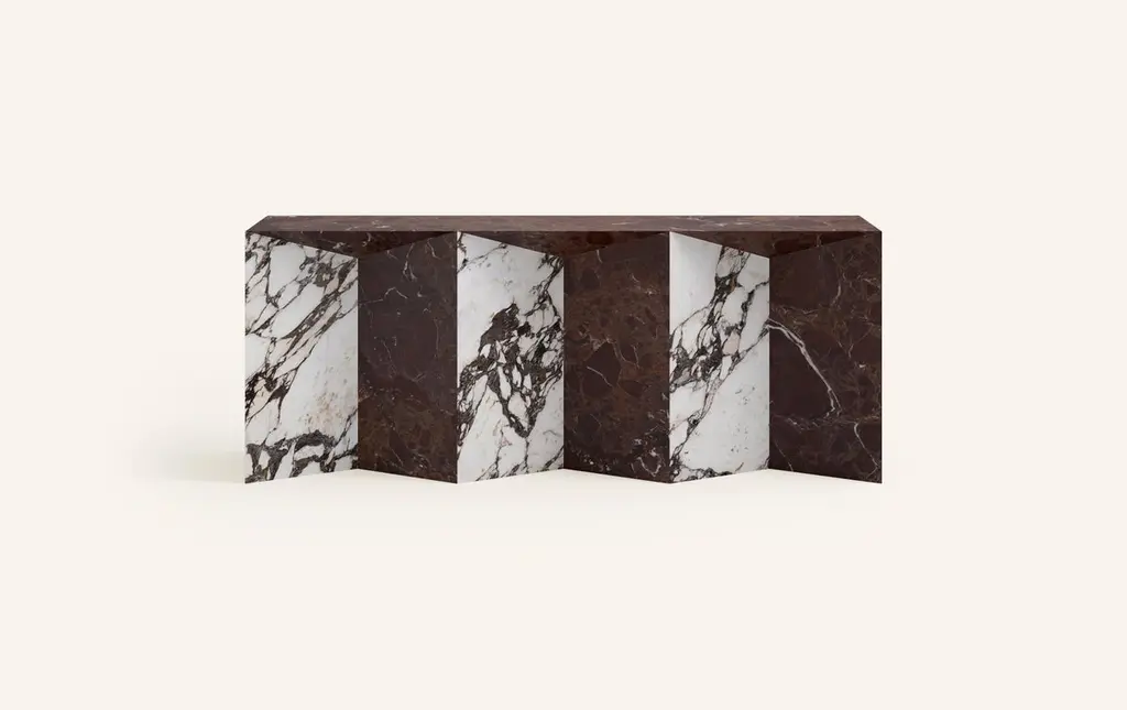 A BOLD AND EXPRESSIVE FORM WHERE GEOMETRY AND HARMONY COLLIDE. ITALIAN FOR WRINKLE, 'GRINZA'S ZIG-ZAG STRUCTURE' IS BOTH TIMELESS AND ELEGANT. DIMENSIONS:72”L x 16”W x 32”H: - WRINKLED BASE WITH 12" FOLDSCONSTRUCTION:- 3/4" THICK TOP & BASE- HOLLOW CONSTRUCTION USING 3/4” STONE SLAB- FELT LINING TO BOTTOM OF BASE AND BACK OF CONSOLE FOR FLOOR & WALL PROTECTIONWEIGHT:72”L x 16”W x 32”H: - GROSS WEIGHT INCLUDING WOOD CRATE 496LBS