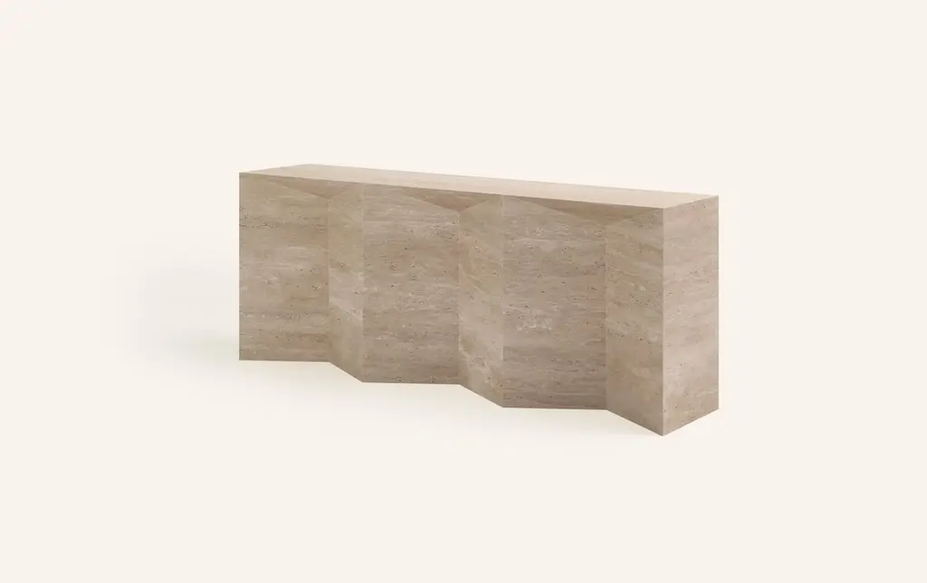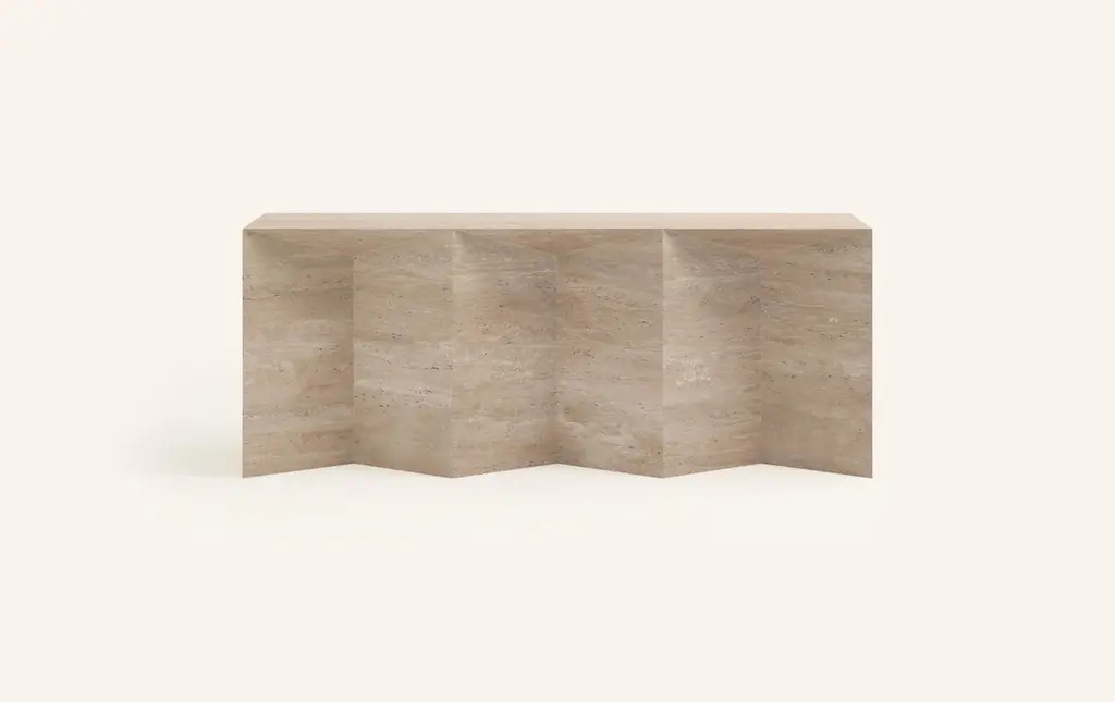A BOLD AND EXPRESSIVE FORM WHERE GEOMETRY AND HARMONY COLLIDE. ITALIAN FOR WRINKLE, 'GRINZA'S ZIG-ZAG STRUCTURE' IS BOTH TIMELESS AND ELEGANT. DIMENSIONS:72”L x 16”W x 32”H: - WRINKLED BASE WITH 12" FOLDSCONSTRUCTION:- 3/4" THICK TOP & BASE- HOLLOW CONSTRUCTION USING 3/4” STONE SLAB- FELT LINING TO BOTTOM OF BASE AND BACK OF CONSOLE FOR FLOOR & WALL PROTECTIONWEIGHT:72”L x 16”W x 32”H: - GROSS WEIGHT INCLUDING WOOD CRATE 496LBS