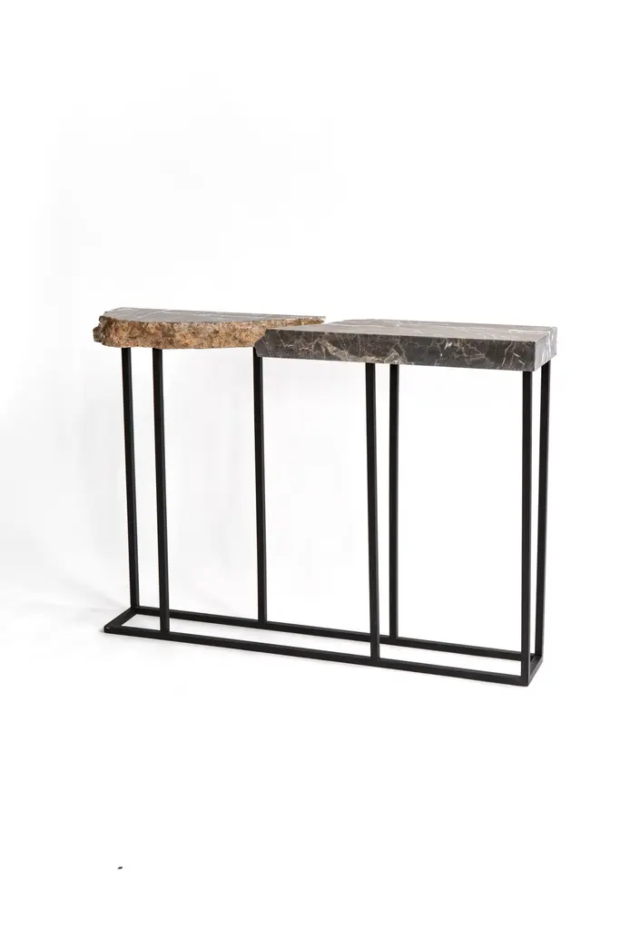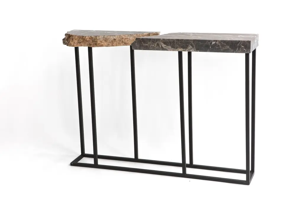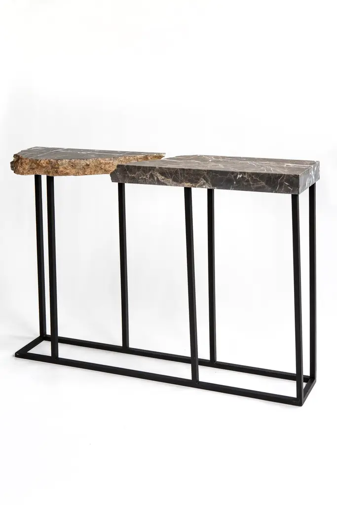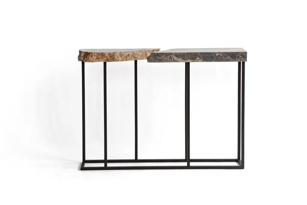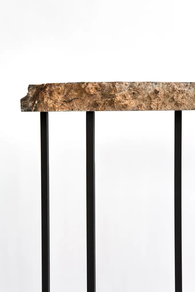 Found I console table No.1 by A SpaceDimensions: D 122 x W 20 x H 102 cmMaterials: Marble, steel.FOUND I collection centers around the power of the medium to dictate the final form that art objects take. Each piece of marble was hand-picked at a small family-owned quarry in the South of Turkey with an intention to work around its imperfections. This collection exposes the rough texture of natural stone, celebrating its beauty and reminding of the mountains that the stone came from.A S P A C E is a New York-based design & art studio, co-founded by Anna Aristova and Roza Gazarian in 2016. Their collaborative pieces are an attempt to bring in the timeless beauty of nature to contemporary lifestyle, whether it’s functional furniture or a decorative object. The essence of each of their creations is a sense of a vast open space, where ideas, thoughts or feelings spontaneously arise, evolve through experimentation and ultimately manifest as a functional art piece. Each object is a one-of-a-kind creation that beckons to look beyond mere form and material, and to connect to the primordial nature of the elements. Their work is a constant balance of opposites -- improvisation and thoughtful planning, intuition and knowledge, organic and geometric, timelessness and impermanence.