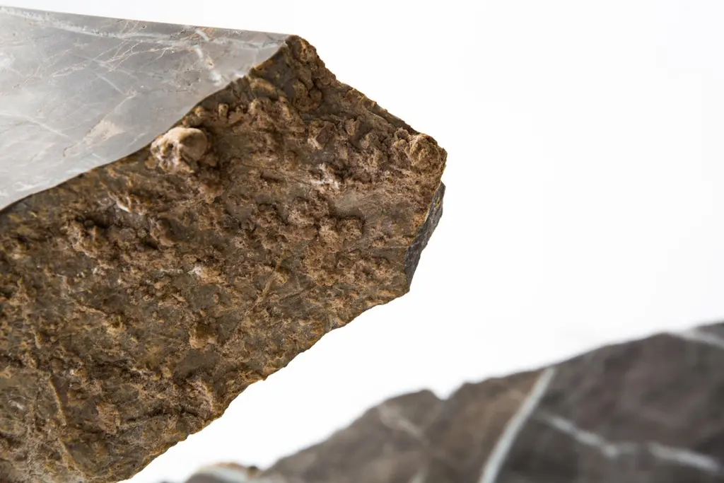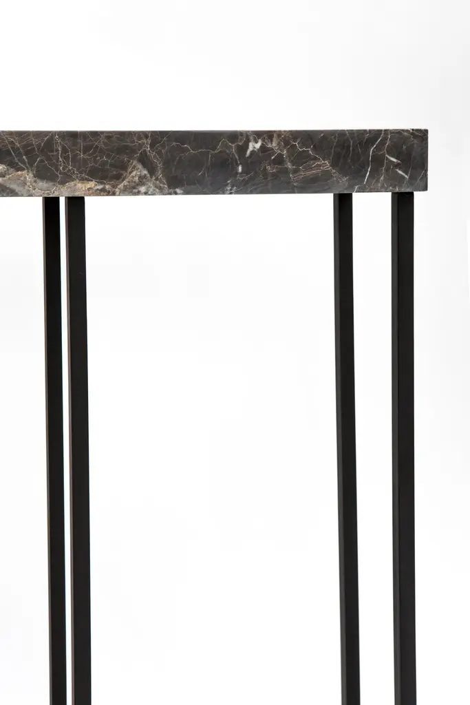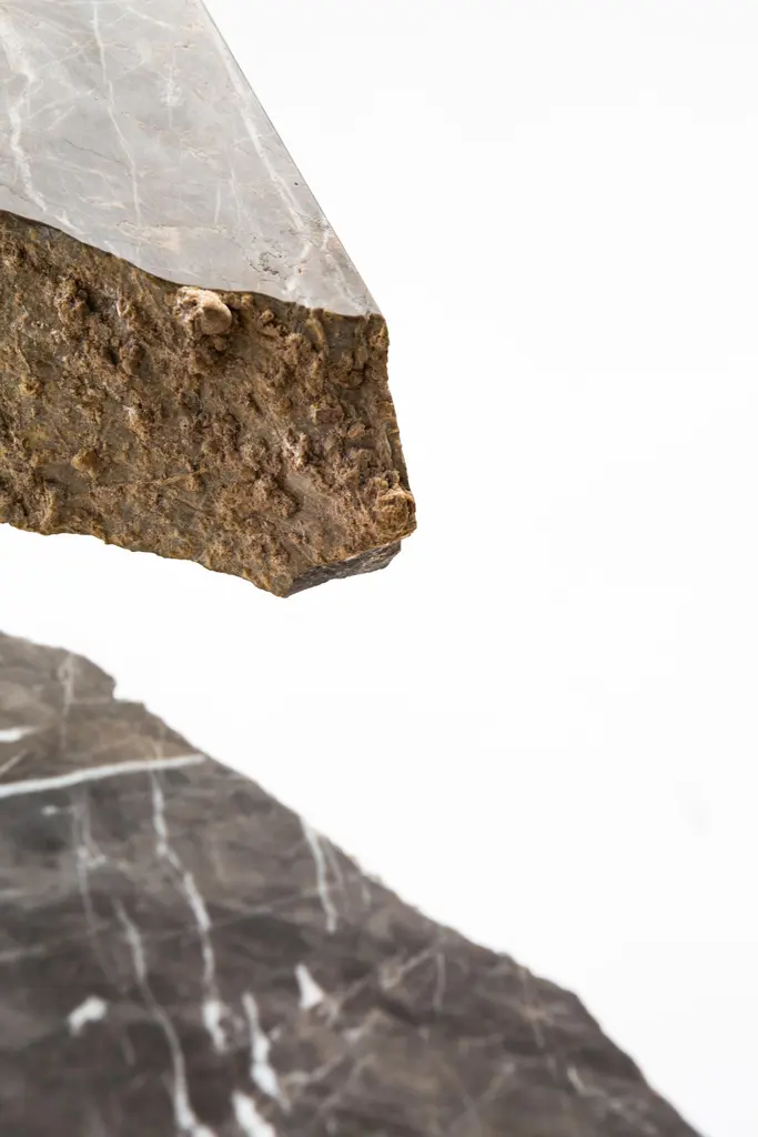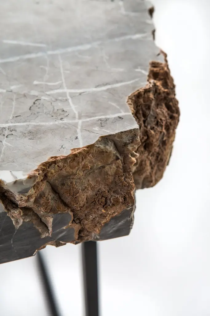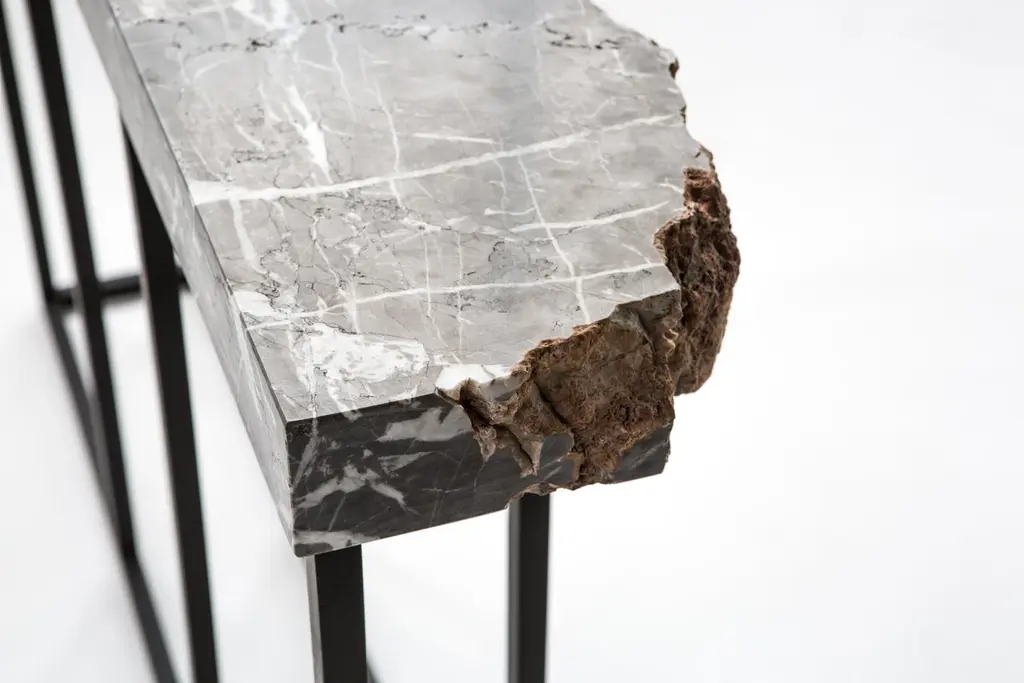 Found I console table No.1 by A SpaceDimensions: D 122 x W 20 x H 102 cmMaterials: Marble, steel.FOUND I collection centers around the power of the medium to dictate the final form that art objects take. Each piece of marble was hand-picked at a small family-owned quarry in the South of Turkey with an intention to work around its imperfections. This collection exposes the rough texture of natural stone, celebrating its beauty and reminding of the mountains that the stone came from.A S P A C E is a New York-based design & art studio, co-founded by Anna Aristova and Roza Gazarian in 2016. Their collaborative pieces are an attempt to bring in the timeless beauty of nature to contemporary lifestyle, whether it’s functional furniture or a decorative object. The essence of each of their creations is a sense of a vast open space, where ideas, thoughts or feelings spontaneously arise, evolve through experimentation and ultimately manifest as a functional art piece. Each object is a one-of-a-kind creation that beckons to look beyond mere form and material, and to connect to the primordial nature of the elements. Their work is a constant balance of opposites -- improvisation and thoughtful planning, intuition and knowledge, organic and geometric, timelessness and impermanence.