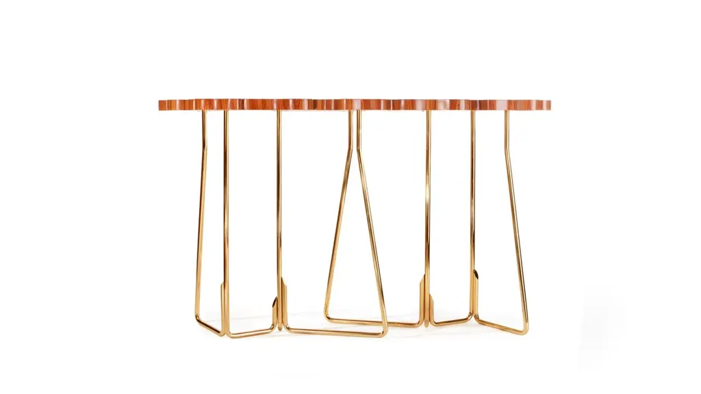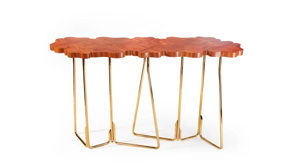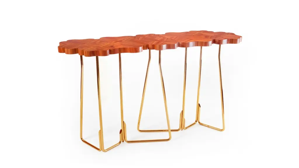 Four... For Luck Rosewood Console by InsidherLandDimensions: D 45 x W 150 x H 90 cm.Materials: marquetry work in rosewood veneer, solid polished brass.50 kg.Also available in ebony.Continuing the interpretation of the Legend of the four leaf clover materialized in the Four... for Luck center table, this console with the same name explores the meaning of Luck in these peculiar plants.On the top made with exquisite rosewood marquetry work, it is drawn an intentional chaos under which each four leaf clover is only revealed only with a careful look. The clovers seem to strive for a major role, overlapping imaginarily on a common plan. Purposely, none clover stands out and we find the beauty in this organic and anonymous set.Starting with the elegance of these plants removed from the land, their original proportion is emphasized with total freedom. The long stems in polished brass acquire enormous proportions that appear to invent a wavy dance that unites them, making them stronger parts of a whole.Unlike the lack of four-leaf clovers, this delicate console offers the viewer the experience of a reflection on the power of the meaning of the fourth leaf which is so abundant here. If one day we found a garden populated by such mystical amulets, the power of the fourth leaf would never again be a prize offered by chance and Luck would become an element of personal achievement obtained through the watchful eye of each one of us.Created by Architect Joana Santos Barbosa in 2012, InsidherLand is a Portuguese brand of exclusive design. Drawn with the signature of the creator, the impressive range of contemporary luxury furniture, lighting, upholstery and accessories are connected to her personal memories and have been highlighted for their innovative and soulful designs.Joana explores several influences from travels around the world to define her own Land as a place that allows her to translate her perceptions into objects of art.The essence of InsidherLand is presented by two inspiring collections. Beyond Memory Collection is deeply influenced by organic forms of nature, legends and traditional cultures, as for the Identity Collection is molded by forms of Architecture and Art. Both collections are designed as a dialog in which nature meets strong architectural lines to create relaxed and sophisticated interiors surrounded by natural materials and meaningful art pieces.Being positioned in strategic markets of high-end luxury decoration, InsidherLand team is proud of working with the best architects and interior design studios from all over the world who seek for handmade exclusive objects that arouse emotions and stand out in exquisite spaces.We are dedicated with love and enthusiasm into every creation to surprise a sensitive but demanding public. Using the expertise of traditional craft techniques, all creations are made by the hands of Portuguese master craftsmen and jewelers who wisely sculpt them in noble materials, finalizing every detail with elegance and perfection.