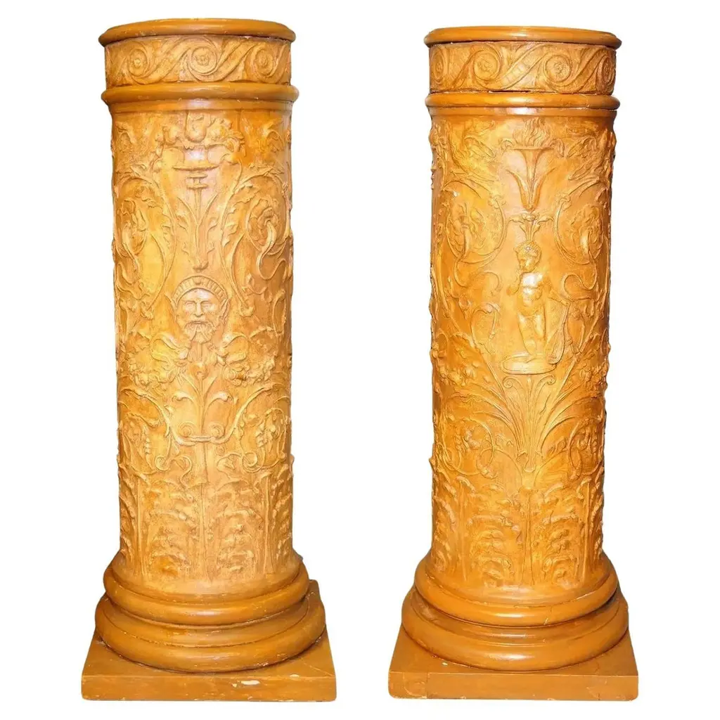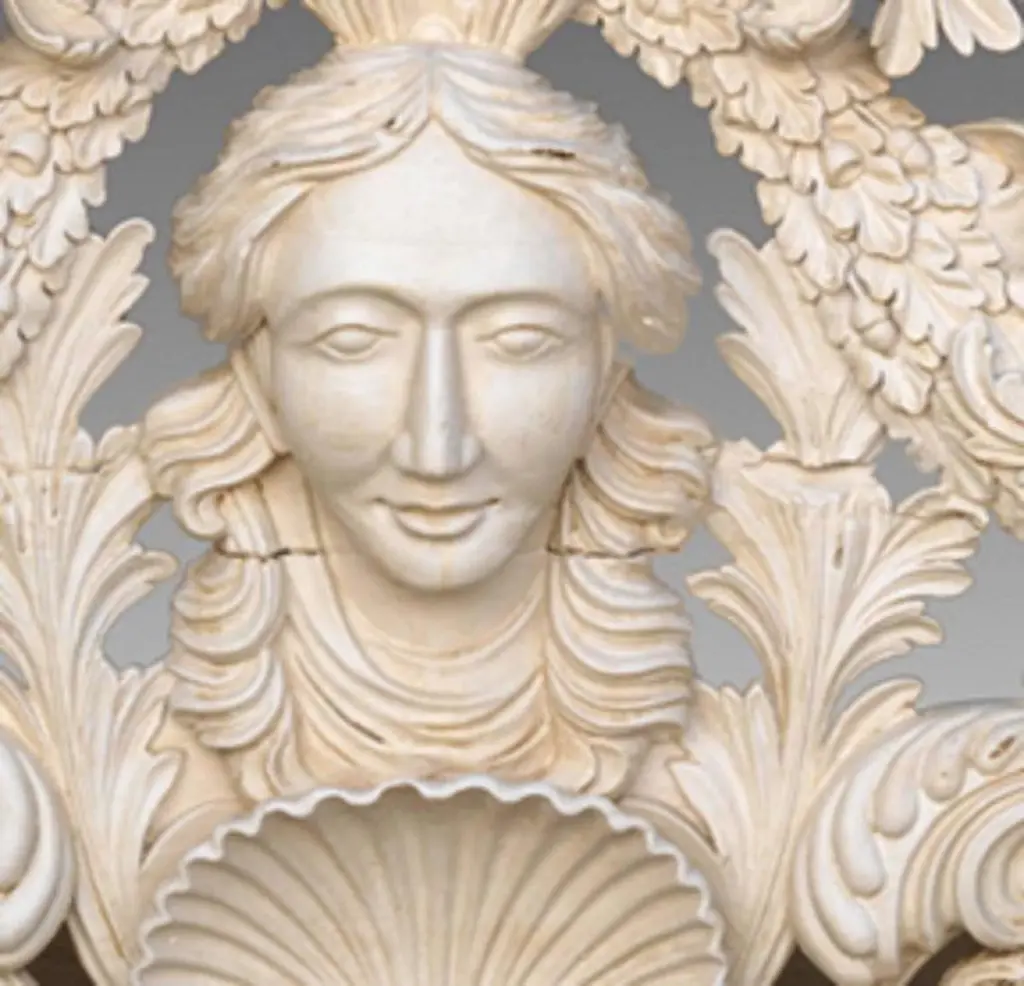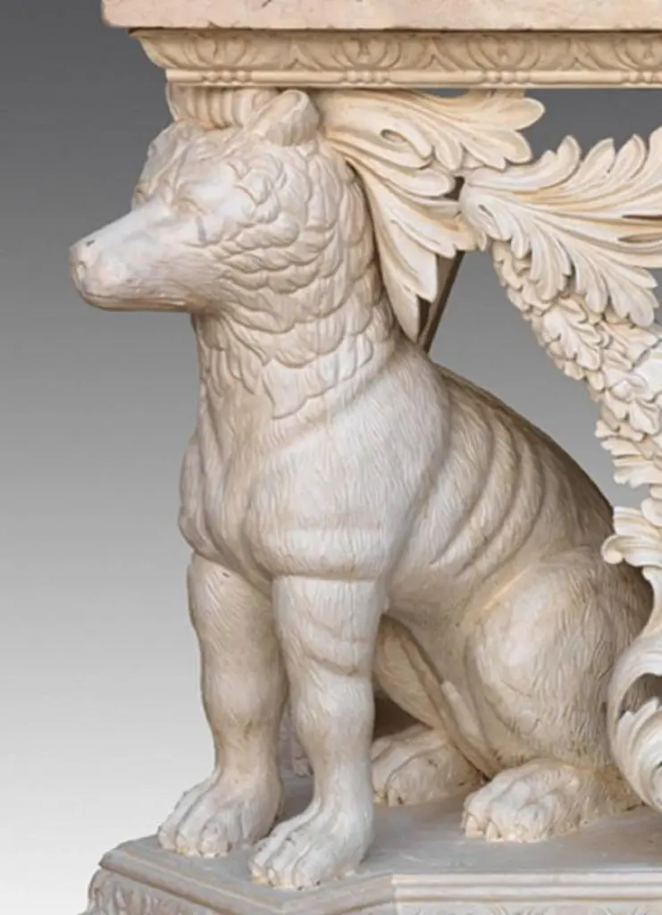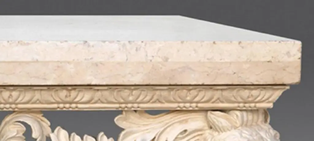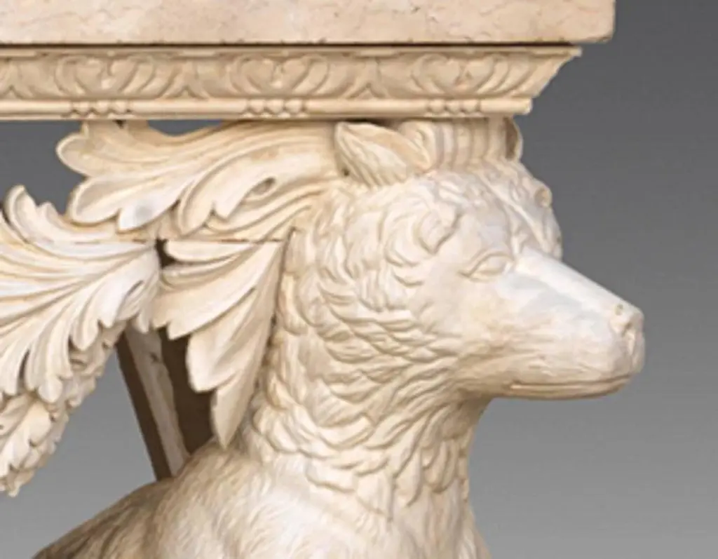 A pair of polished limestone tops supported by seated stylised foxes to each corner flanking scrolling acanthus and oak-leaf swags centered by female masks above scallop shells. These impressive console tables are an example by Benjamin Goodison, circa 1740.The tables are presented in a fully Country house aged Gesso and carved in old PineThe originals now reside in the Victoria and Albert Museum, see Christopher Wilk (ed) Western Furniture 1350 to the Present Day, Victoria and Albert Museum, 1995, p230.We are currently working to a 30-36 week lead time.
