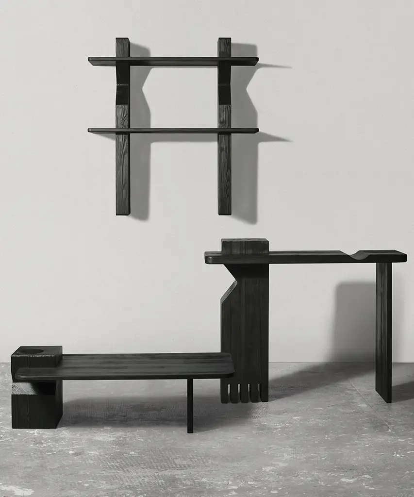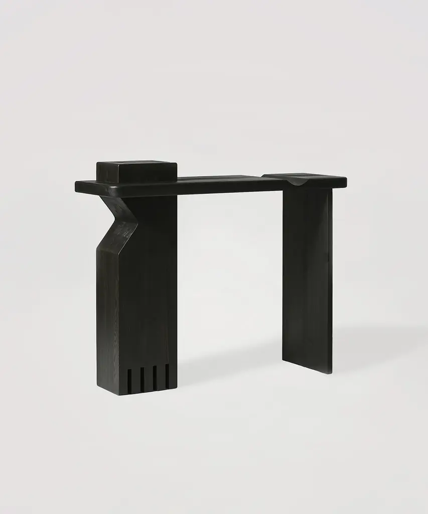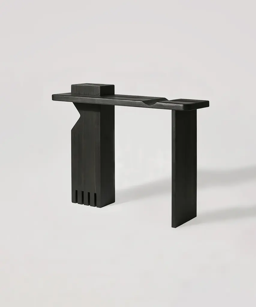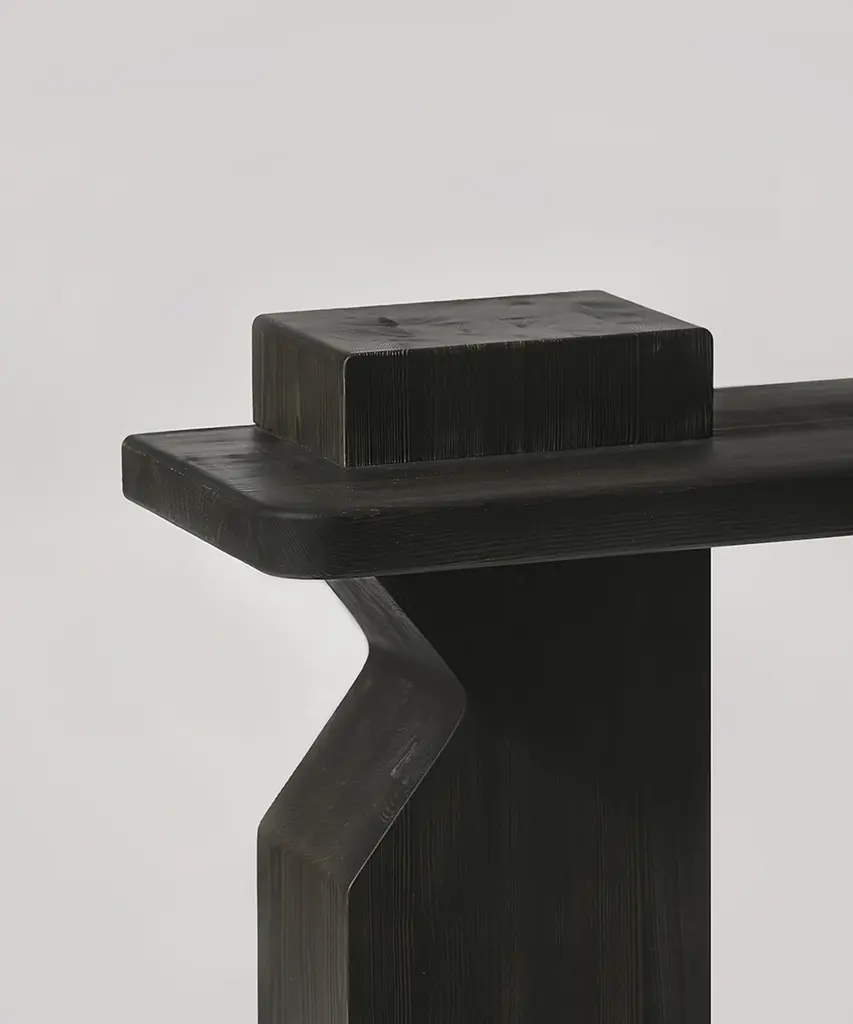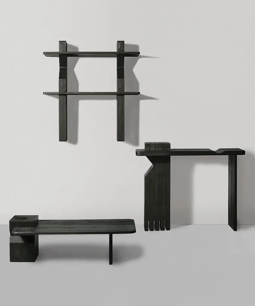 In a time when the Sardinian countryside is quieting down into soft rains that will nurture the next year’s harvest, Pretziada had the pleasure of hosting an extended residency with the newly formed Mimo Studio. Over three months, Raphaelle Lhuillier and Margaux Padrutt studied the fluctuating rhythms of the countryside and the stark beauty of the landscape. The result is the collection Fùrca, three pieces that refer directly to their lived experience on the island. Inspired by the natural extrusions of stone monoliths found throughout the forest and the geometric forms found in historic agricultural tools, Fùrca is a collection that plays with a visual language that combines both the rudimentary and the refined. The shapes that make up these objects are a contrast between natural and human-made shapes; they refer to spontaneous forms in nature and to the resolute architecture of rural places. The finish, a repetition of a slightly green and black stain, creates a variegated and smooth materiality. Designed by Mimo Studio and Pierpaolo Mandis for Sardinian-based design publisher, Pretziada.