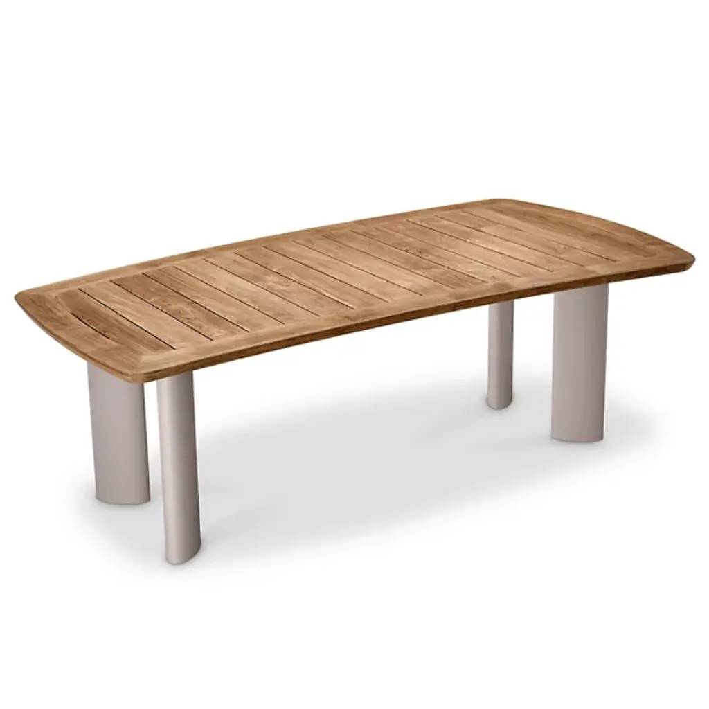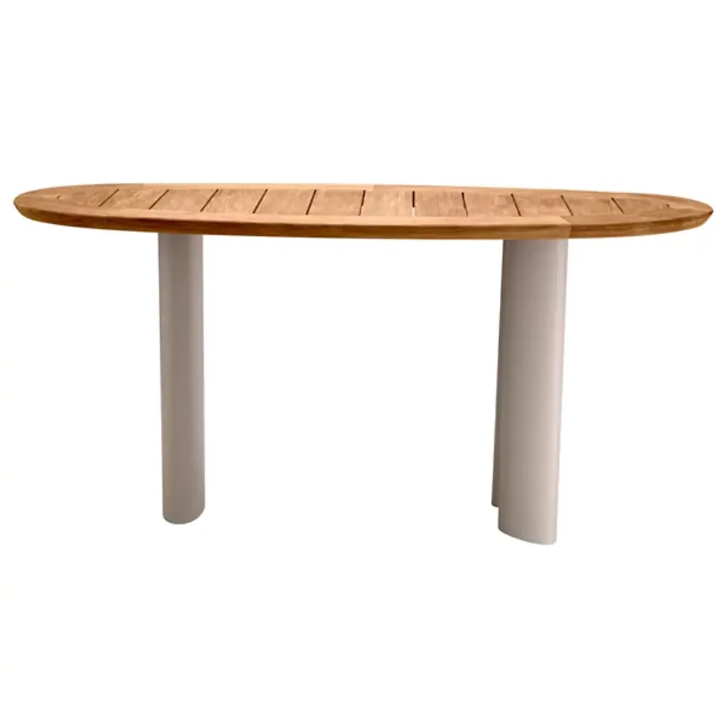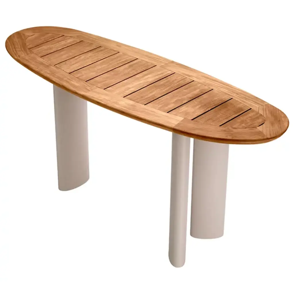 Add eco-friendly elegance to your spaces with the Free Form Outdoor Console Table from Eichholtz. Each table is handmade by skilled artisans, combining contemporary minimalism with rustic charm. Its top is free-form teak wood sourced from sustainably managed forests and pairs beautifully with three tall aluminum legs with an oval silhouette. Over time, the teak wood develops a rich silver patina, enhancing its natural elegance. This versatile table becomes the focal point of any outdoor space, matching natural materials with an open, modern design.