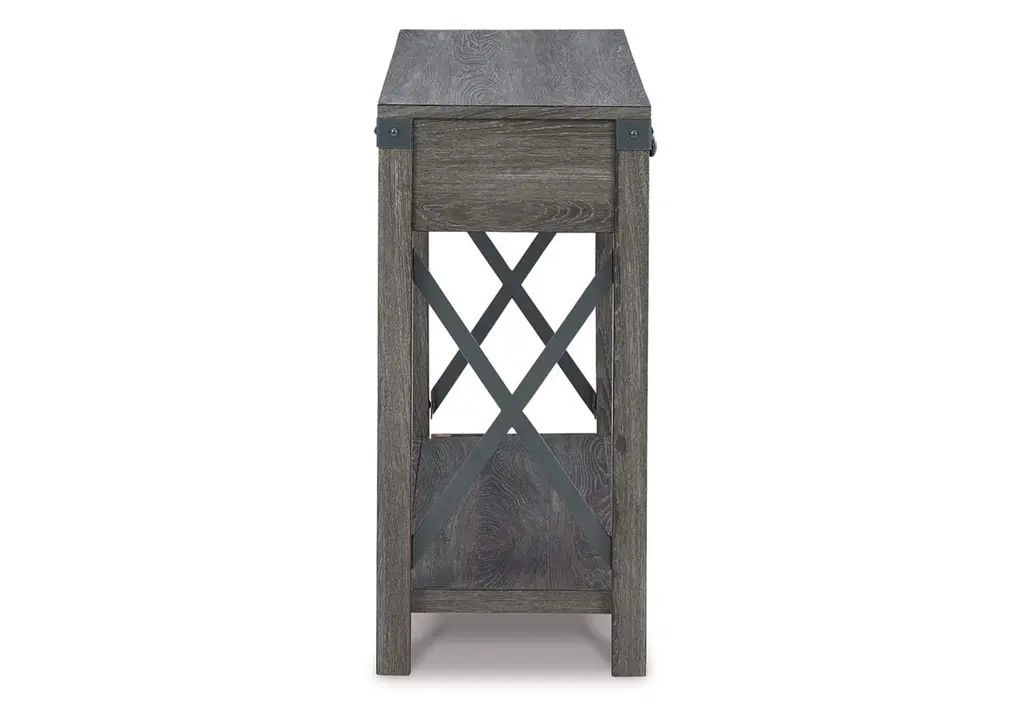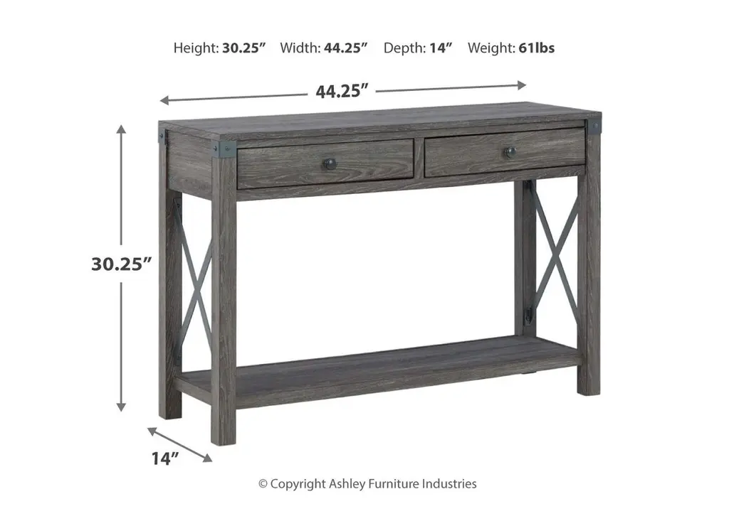 Open the door to modern farmhouse style with the Freedan console table. The beautiful woodgrain look and classic crossbuck metal accents are a cool touch, while the lower shelf provides surface space for fashionable home accessories. A pair of smooth-gliding drawers is the answer to the daily, where-are-my-keys question. Weight 63.000 lbs. (28.35kgs.)