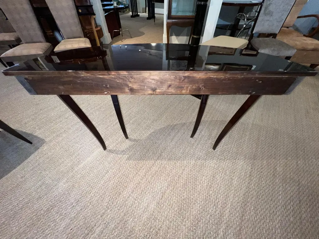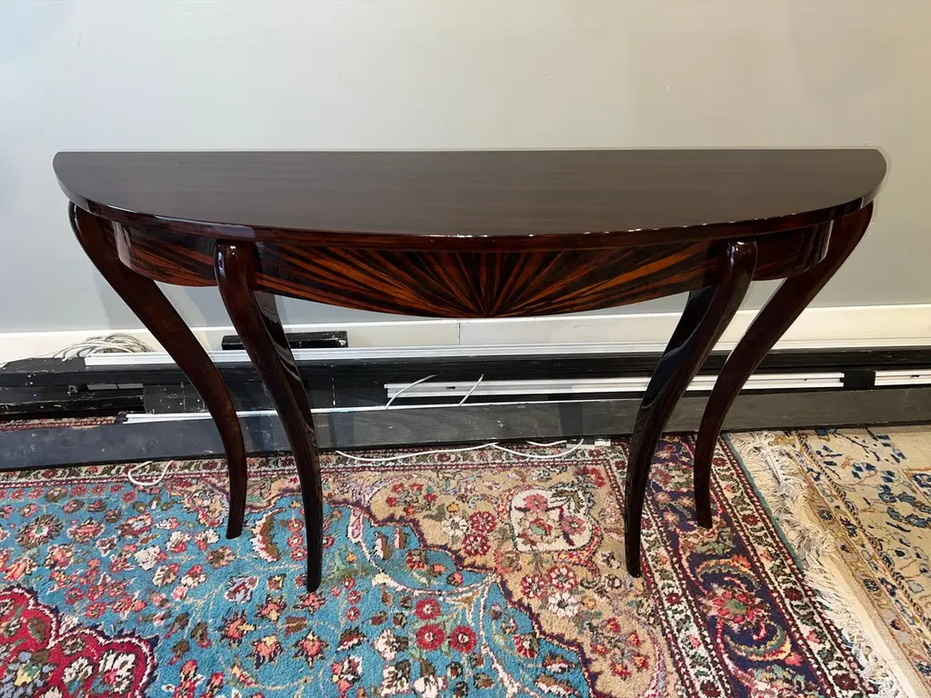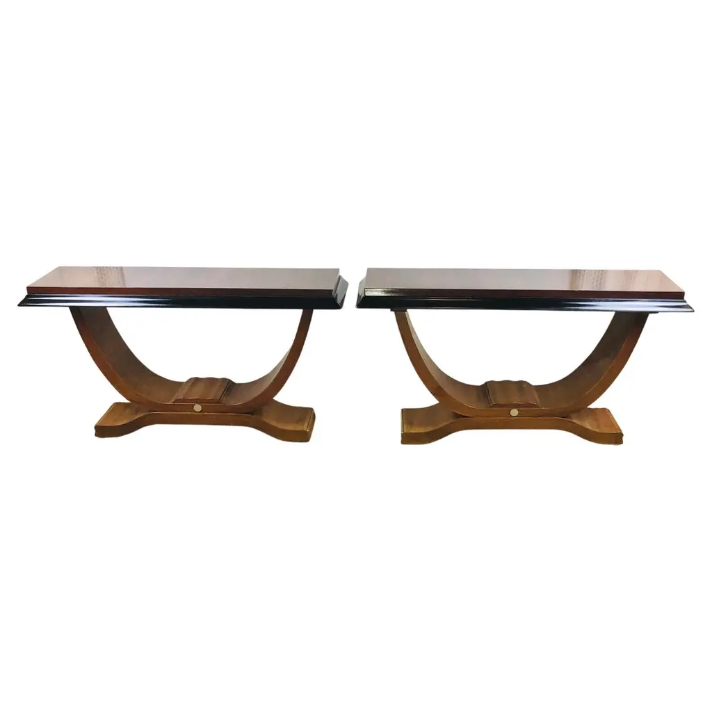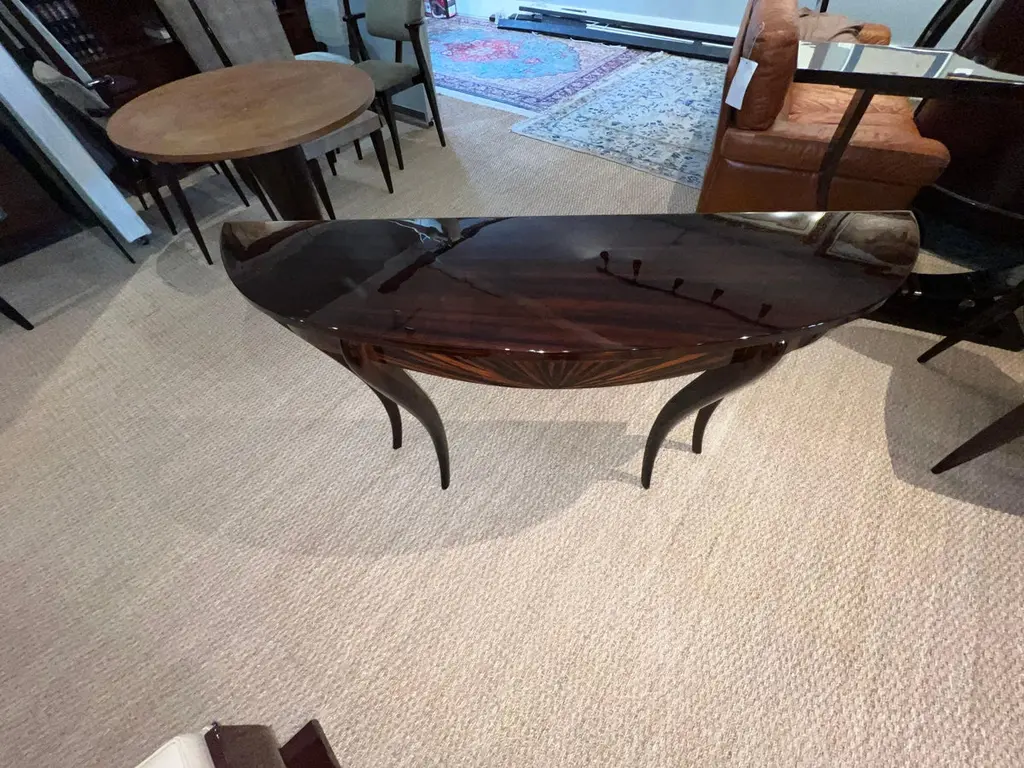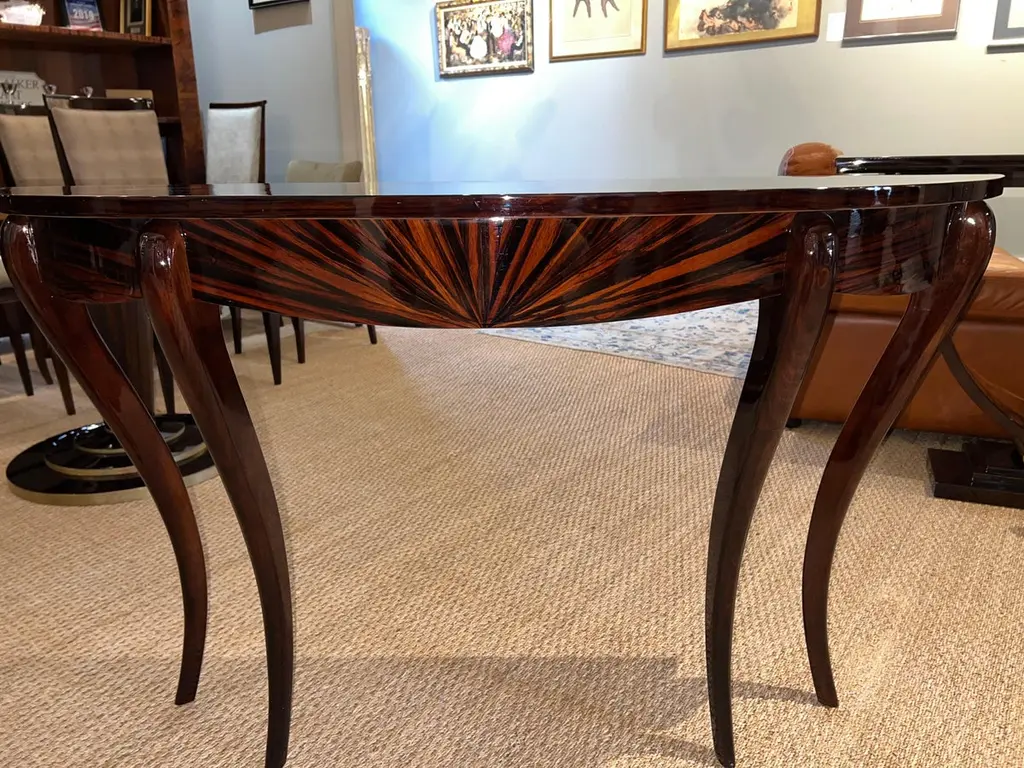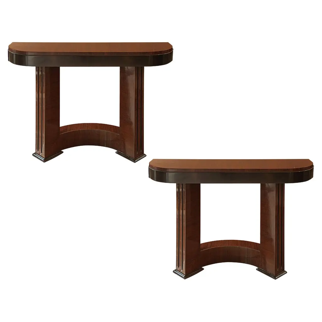 Elegant Art Deco French Consoles made of Macassar wood. The console top displays beautiful wood grain. It is supported by 4 thin curved legs. For better stability, the console needs to be attached to the wall. The condition is very good. Restored. France, c. 1930s53.5"w x 14.5"d x 31"h