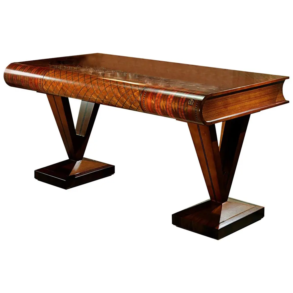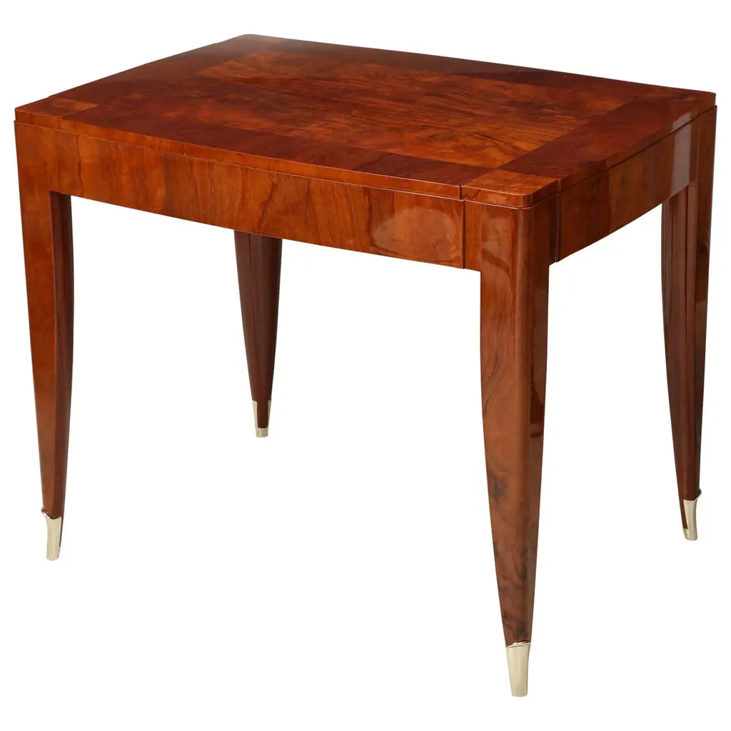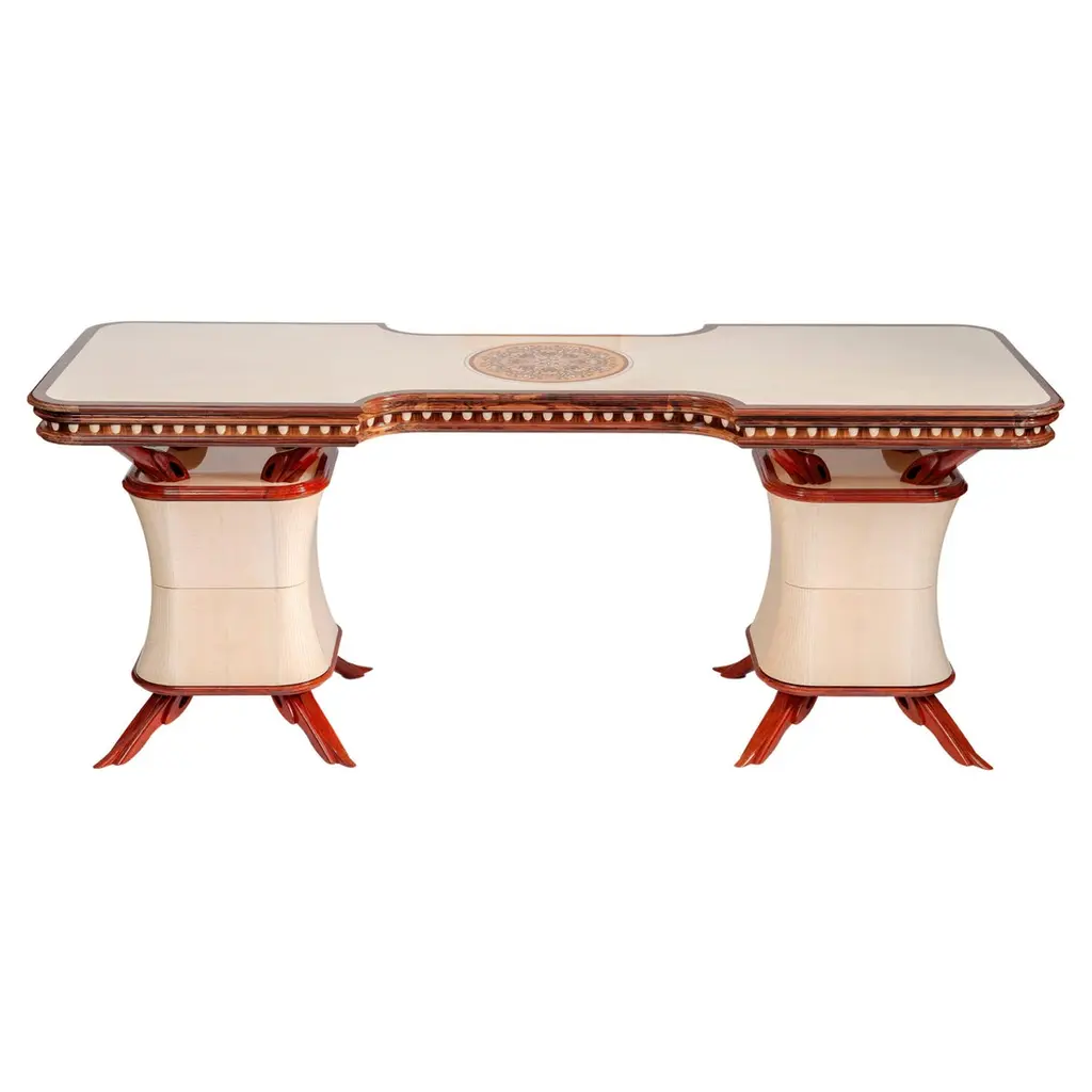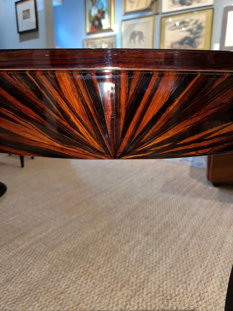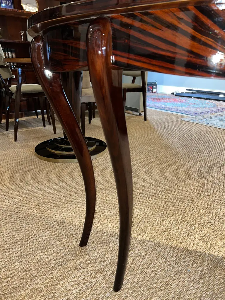 Elegant Art Deco French Consoles made of Macassar wood. The console top displays beautiful wood grain. It is supported by 4 thin curved legs. For better stability, the console needs to be attached to the wall. The condition is very good. Restored. France, c. 1930s53.5"w x 14.5"d x 31"h