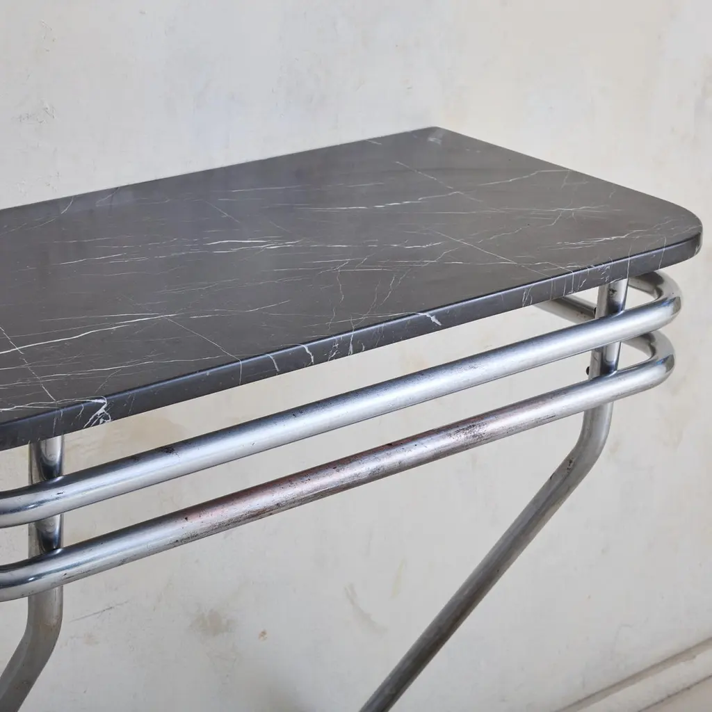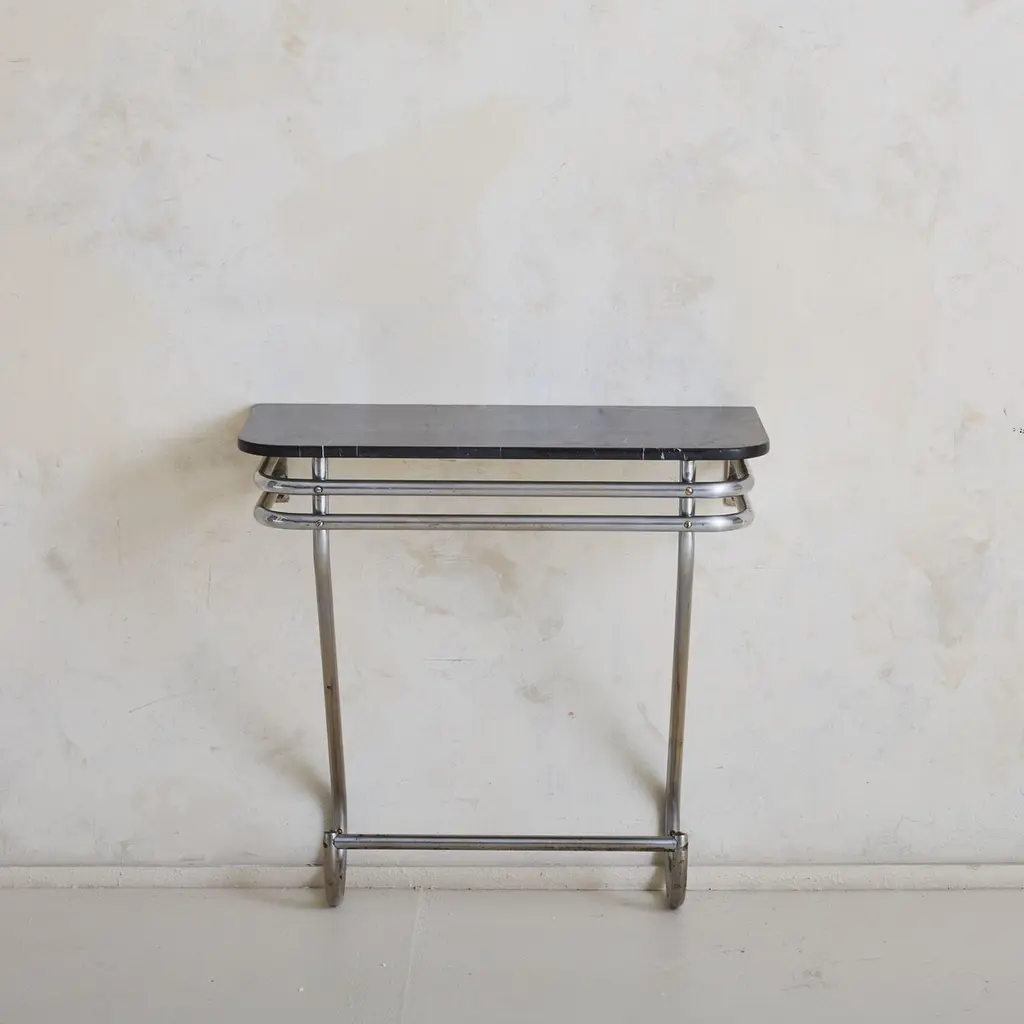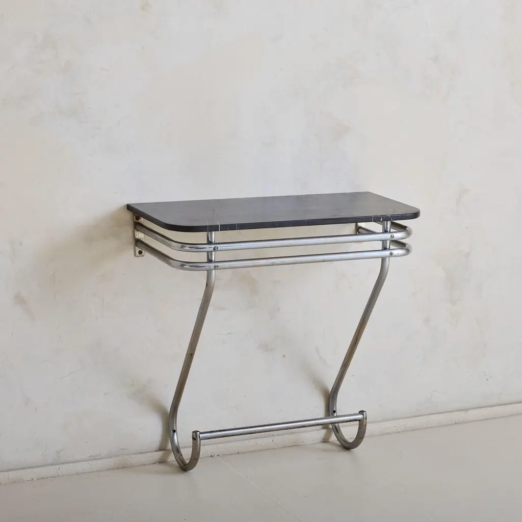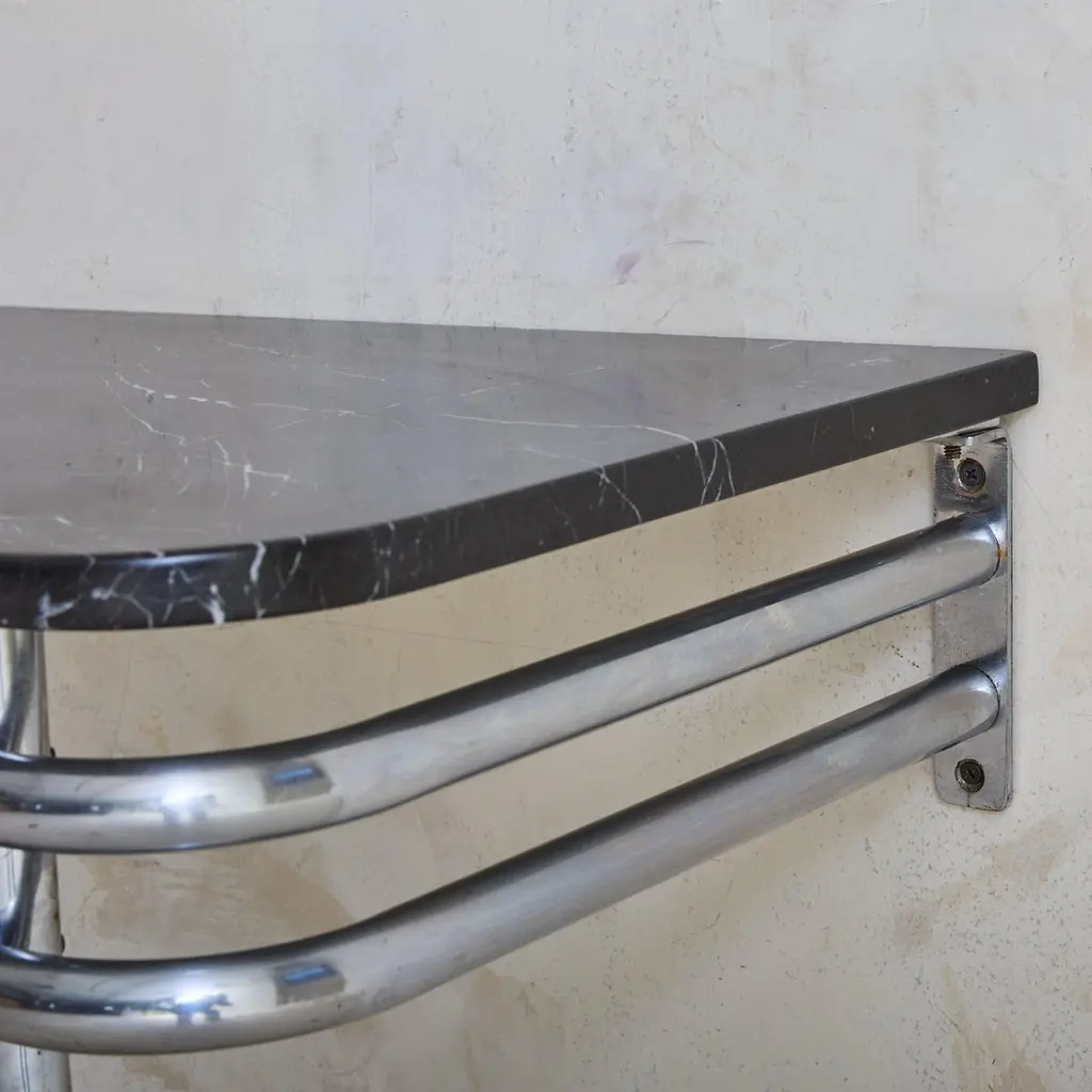 Sold and priced individually.This console table features a streamlined Art Deco design, characterized by its sleek, minimalist form and the use of high-quality material of marble. The design echoes the elegance and modernity of the mid 1940s, when Art Deco flourished, particularly celebrated for its geometric shapes and the combination of luxury materials with industrial ones.Condition: In good vintage condition, with oxidation throughout the chrome frame. The frame screws directly into the wall for mounting. The marble top has been carefully honed and refinished by our team of restorationists.