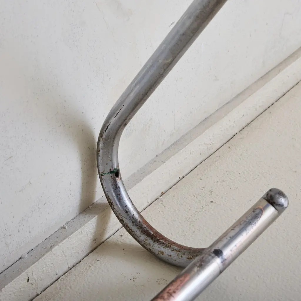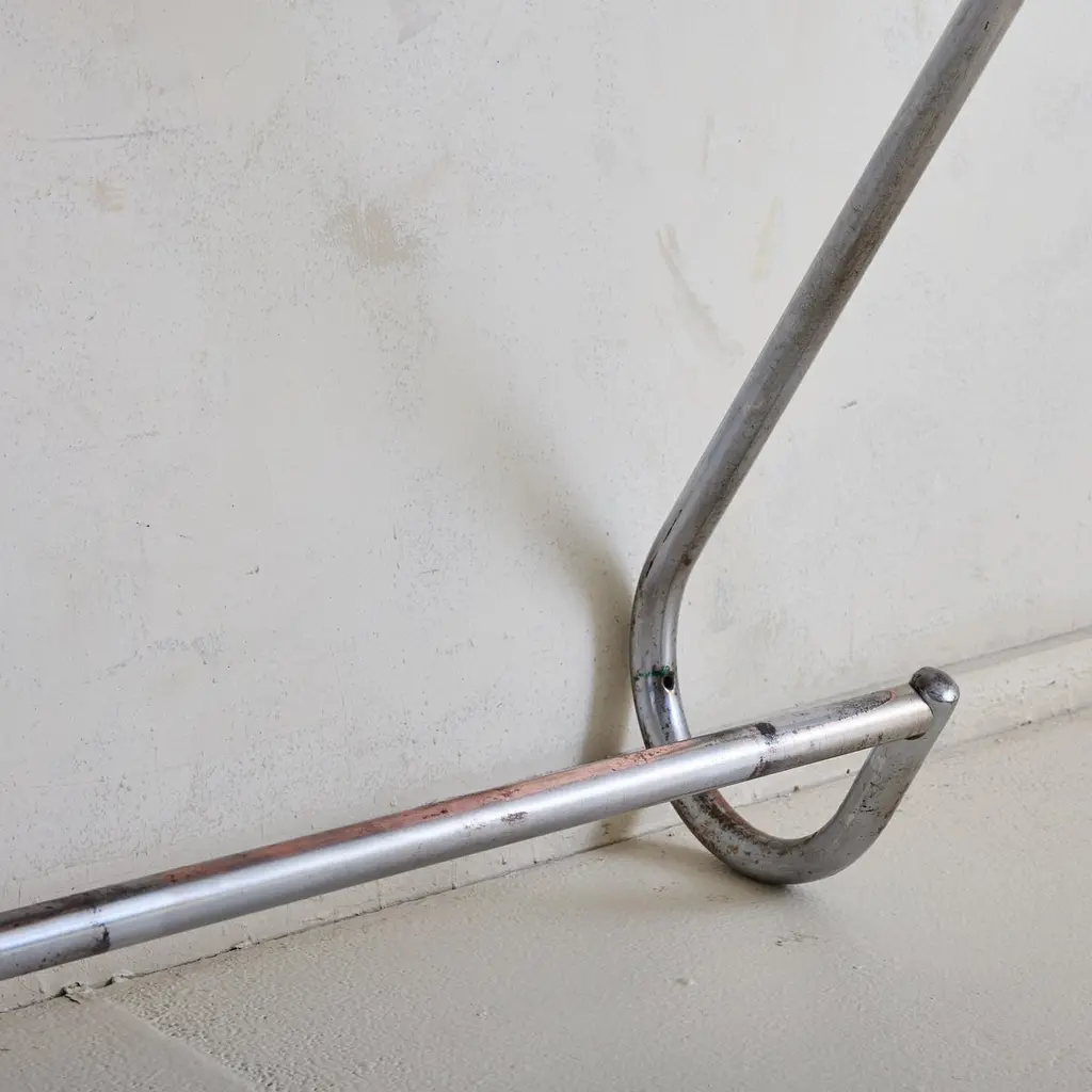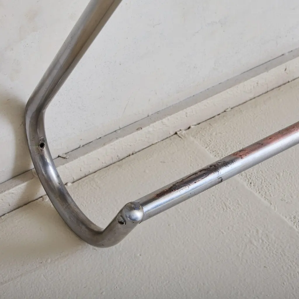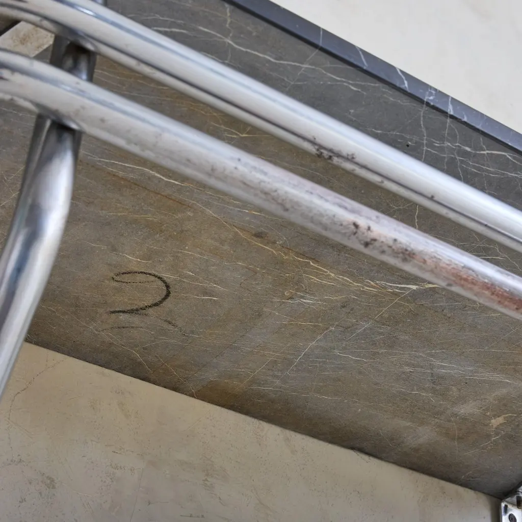 Sold and priced individually.This console table features a streamlined Art Deco design, characterized by its sleek, minimalist form and the use of high-quality material of marble. The design echoes the elegance and modernity of the mid 1940s, when Art Deco flourished, particularly celebrated for its geometric shapes and the combination of luxury materials with industrial ones.Condition: In good vintage condition, with oxidation throughout the chrome frame. The frame screws directly into the wall for mounting. The marble top has been carefully honed and refinished by our team of restorationists.