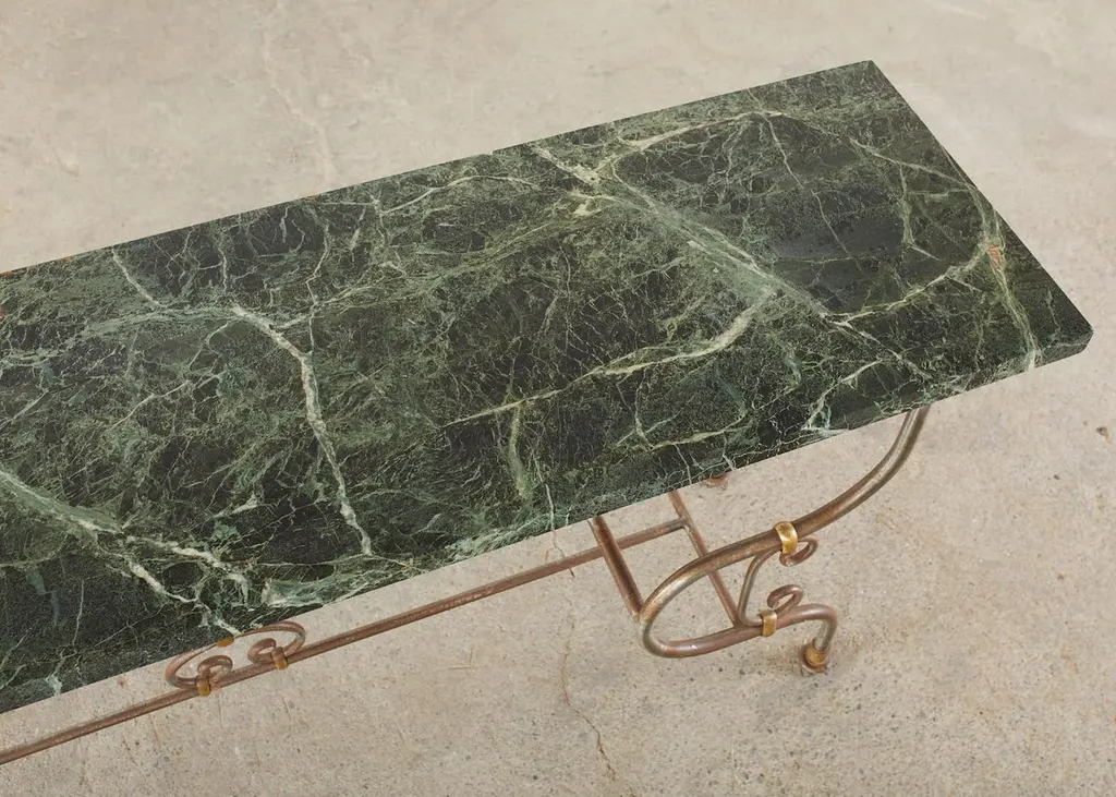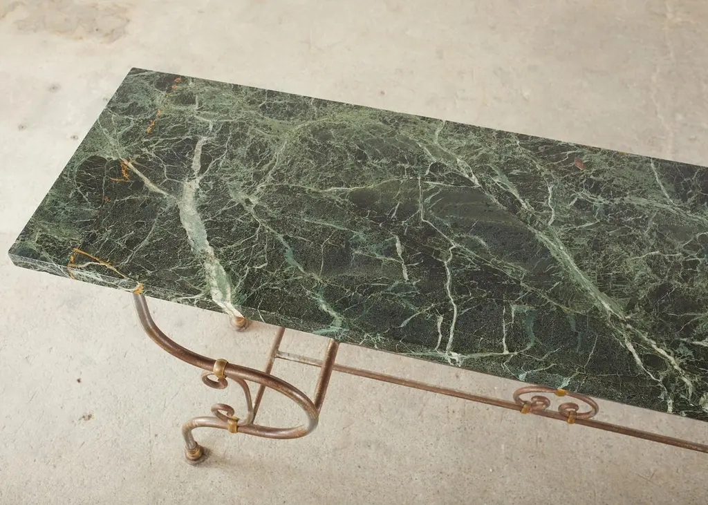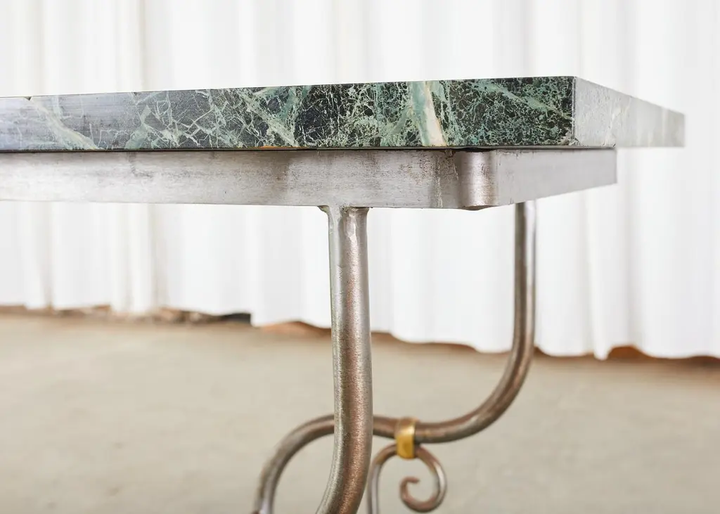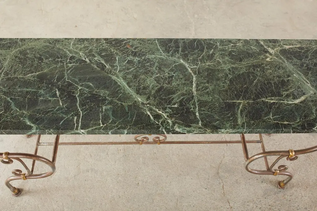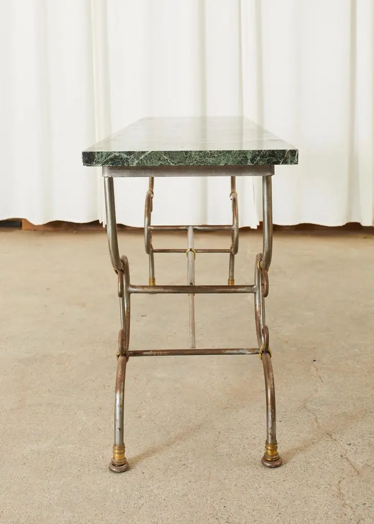 Fantastic French Art Nouveau pastry table or console table featuring a dark green marble slab top. The thick marble is supported by a bronze mounted steel decorative arts base with whimsical scroll work and a beautiful profile. The base measures 66 inches by 15 inches without marble. The marble is 1.25 inches thick with an aged patina. The table is finished on all sides and the marble is finished on 3 sides with an unpolished edge on the back. From an estate in Malibu, CA.