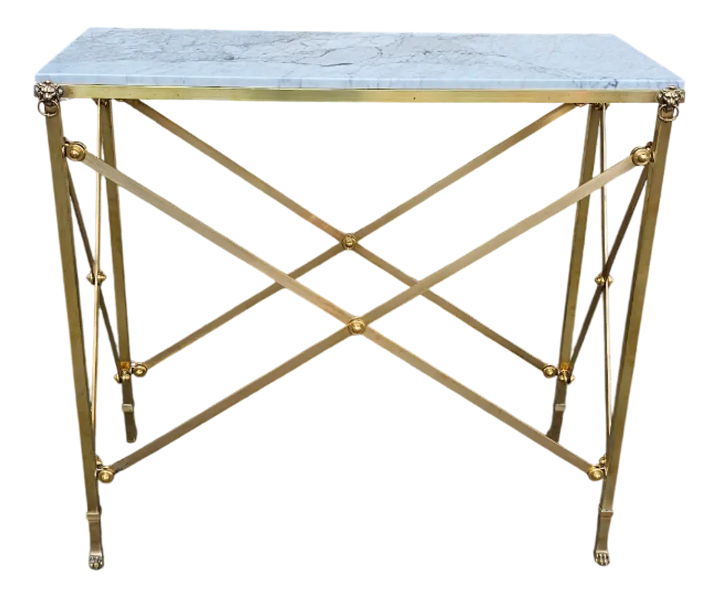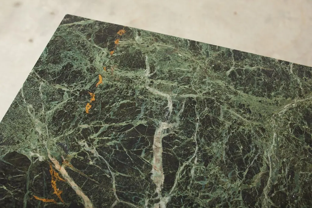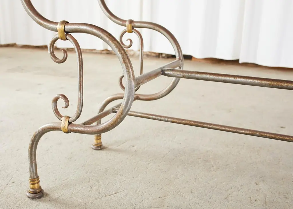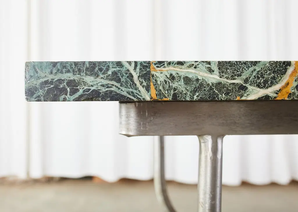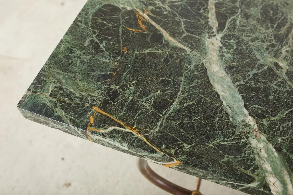 Fantastic French Art Nouveau pastry table or console table featuring a dark green marble slab top. The thick marble is supported by a bronze mounted steel decorative arts base with whimsical scroll work and a beautiful profile. The base measures 66 inches by 15 inches without marble. The marble is 1.25 inches thick with an aged patina. The table is finished on all sides and the marble is finished on 3 sides with an unpolished edge on the back. From an estate in Malibu, CA.