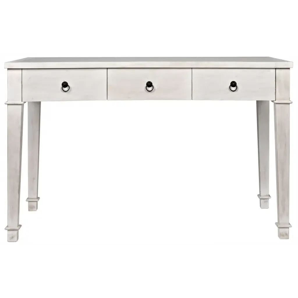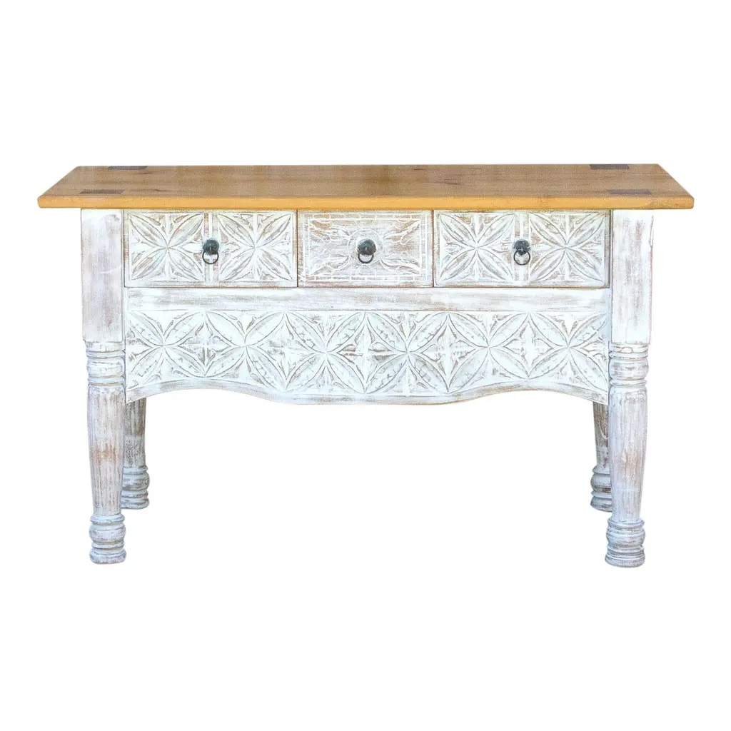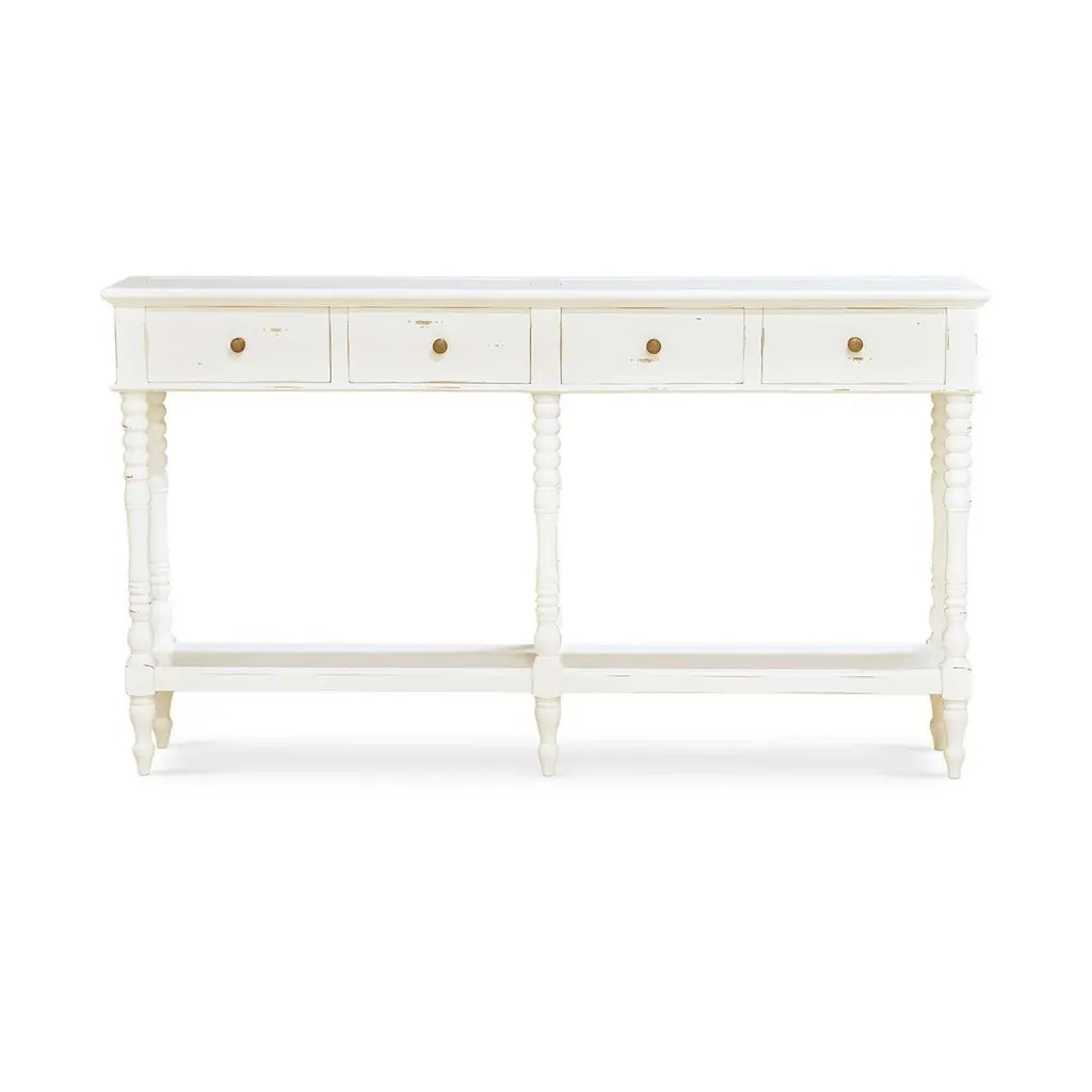 Designed to add sophistication and functionality, this table features beautifully turned legs and four frieze drawers, providing ample storage for your essentials. The lightly distressed white finish gives it a warm, vintage appeal, perfect for enhancing any room's decor.This console table's classic design and sturdy construction make it a versatile addition to your living room, hallway, or entryway. The lower shelf offers additional space for storage or display, allowing you to showcase your favorite decor items or keep everyday necessities within reach. Dimensions: 58" W x 11" D x 33" HLead time is 14 - 16 weeks.Custom finish options are also available. Contact us to learn more.