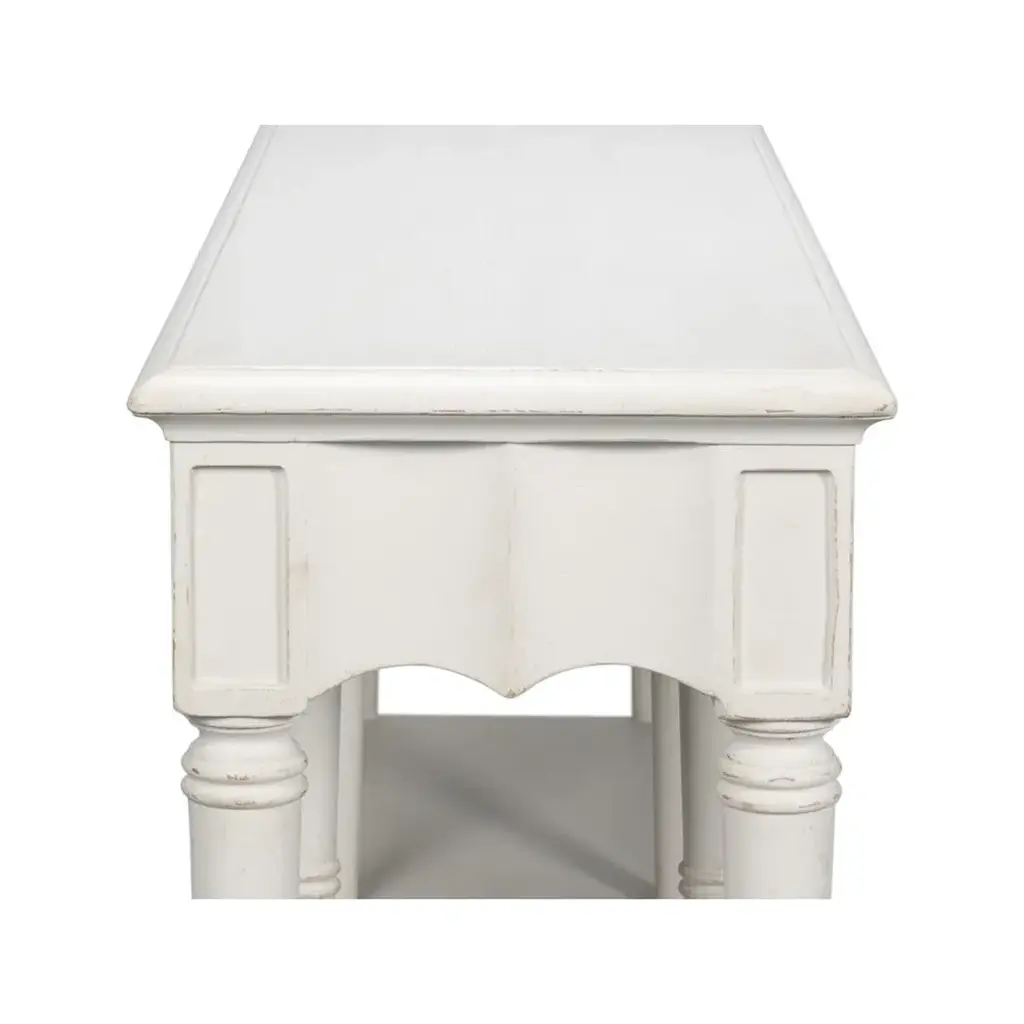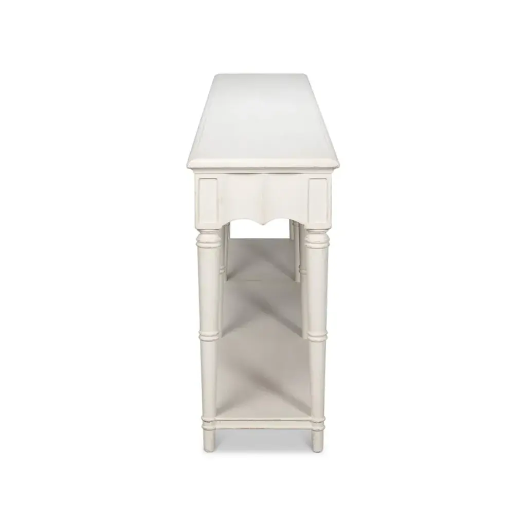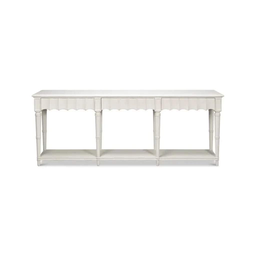 A Large Country console table in a hand-rubbed antique white finish. The front apron of this piece has a beautiful fluted design. It has three drawers, eight turned and tapered legs, and a shelf stretcher base. Dimensions: 93" W x 18" D x 36" H