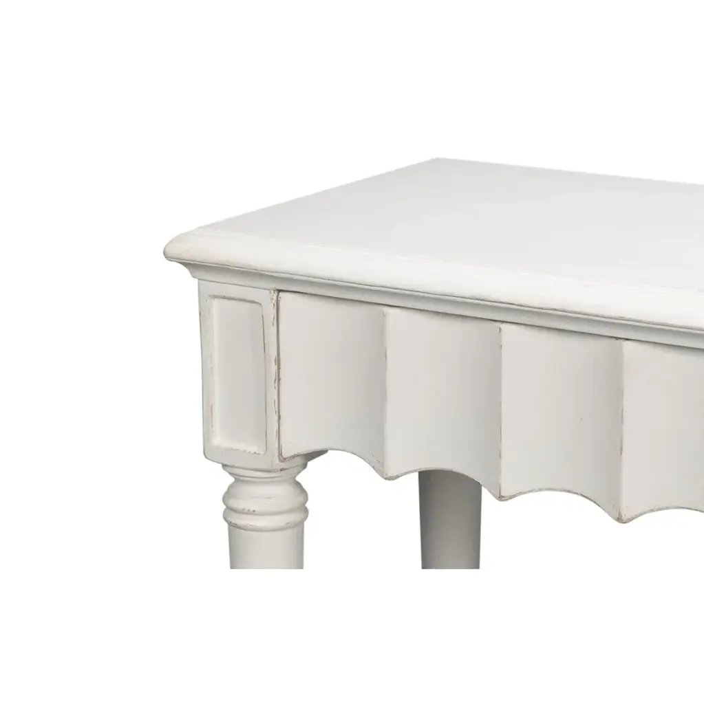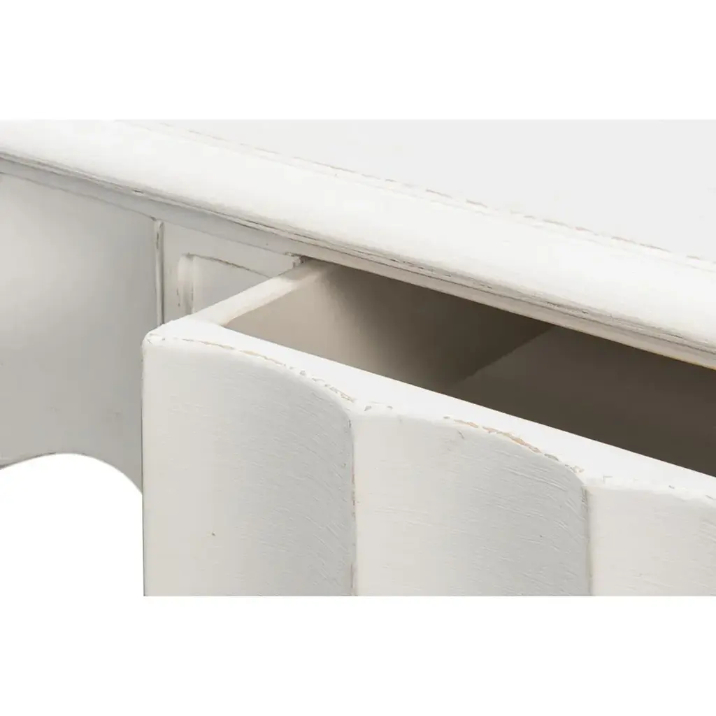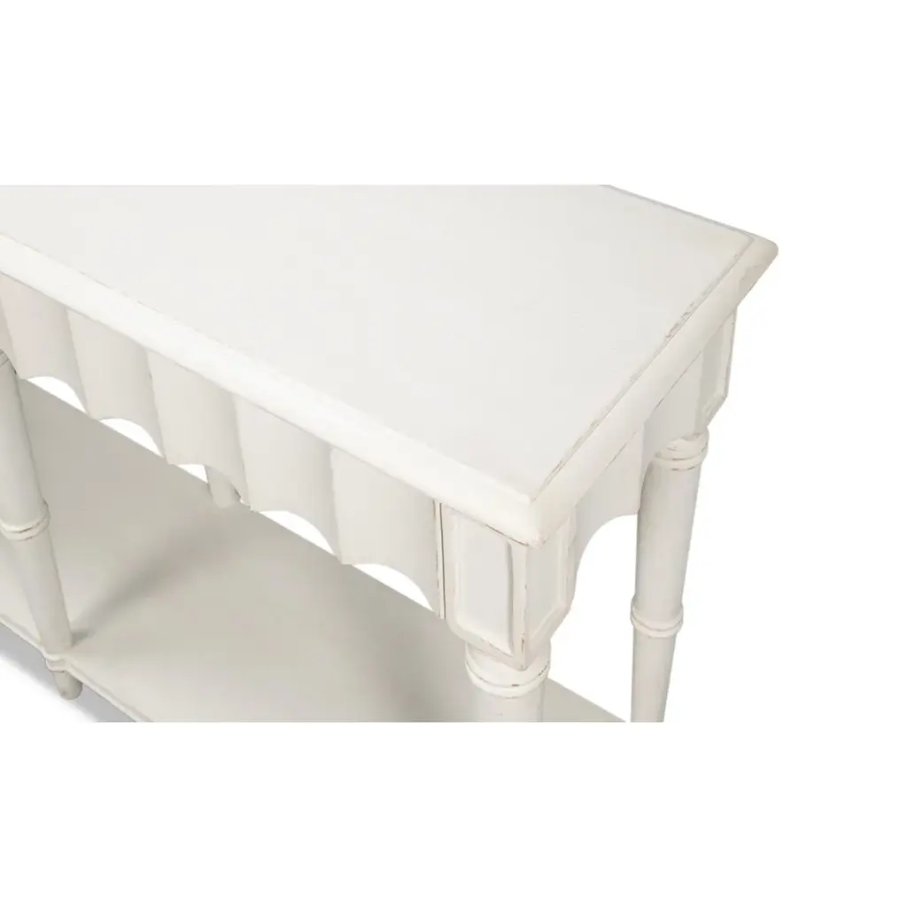 A Large Country console table in a hand-rubbed antique white finish. The front apron of this piece has a beautiful fluted design. It has three drawers, eight turned and tapered legs, and a shelf stretcher base. Dimensions: 93" W x 18" D x 36" H