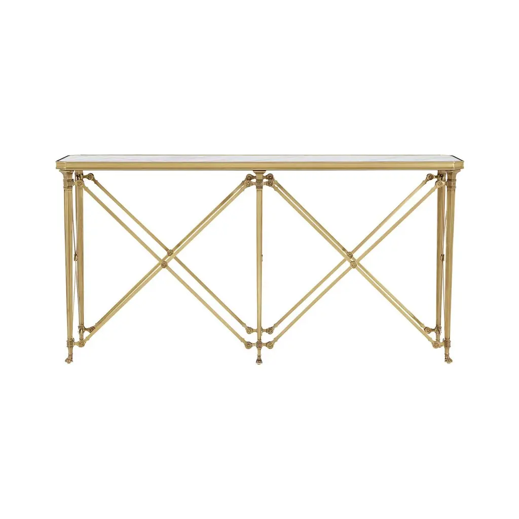 Early 19th-century French design anchored by a sleek quartz top with a refined moulded surround and elegant canted corners, this table blends architectural grace with timeless luxury. The cast brass frame features tapering legs ending in stylized paw feet—a definitive mark of Empire aesthetics—creating a commanding silhouette that elevates any hallway, entry way or living space.An X-frame stretcher system unites the base in perfect symmetry, adorned with roundel medallions for a classical flourish. Decorative yet highly functional, the table balances ornamental restraint and structural clarity. Ideal for traditional interiors with a taste for grandeur, this piece offers heirloom-quality craftsmanship with a regal sensibility.Dimensions: 64" W x 16" D x 32" H