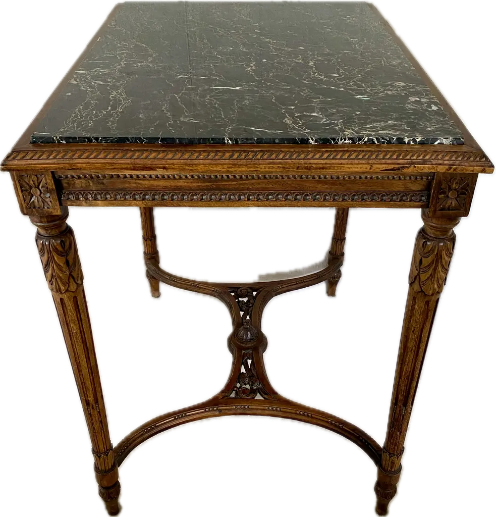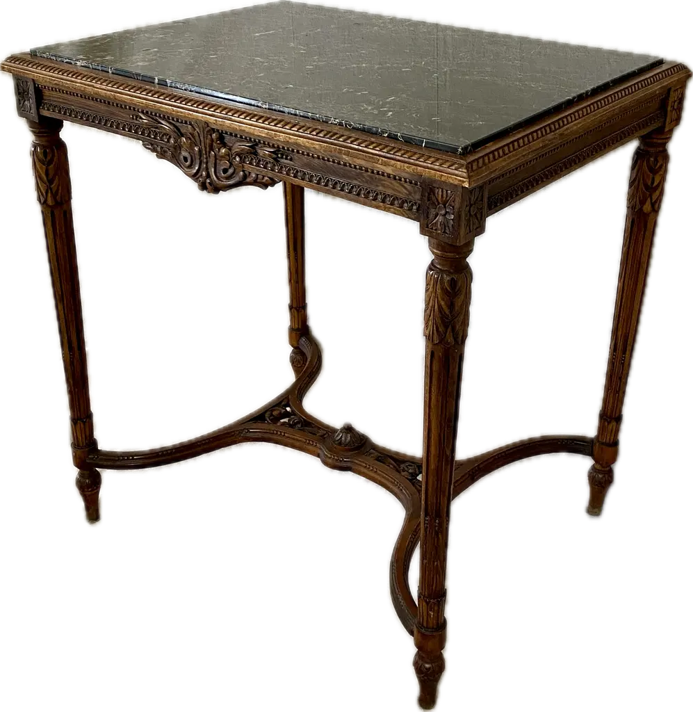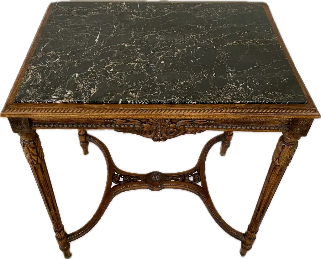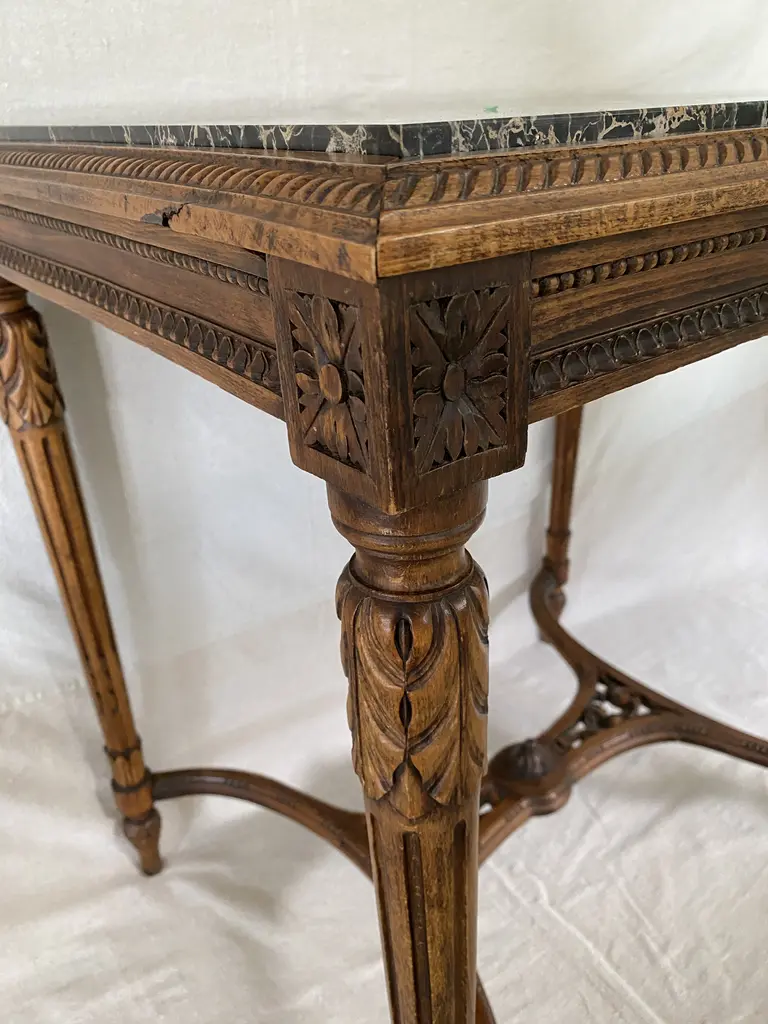 Stunning antique French oak console table with inset black marble top and very detailed carving and trim. Marble lifts out to facilitate moving. In remarkable antique condition with time earned patina.