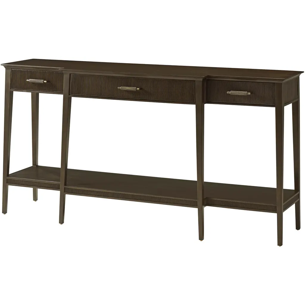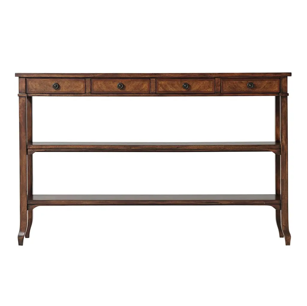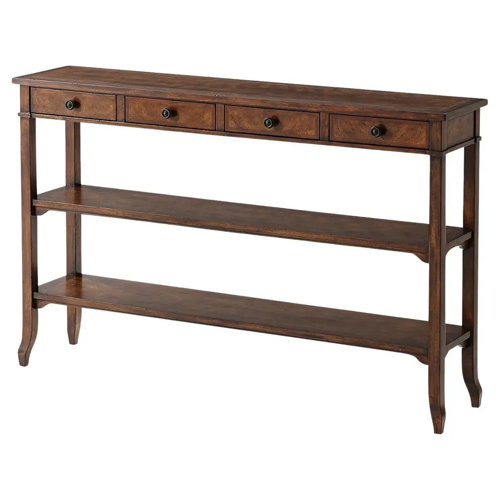 A NeoClassic style mahogany French Provincial Console table, the rectangular crossbanded top above four frieze drawers, on gently splayed legs joined by two under tiers. Dimensions: 54" W x 12.5" D x 34" H