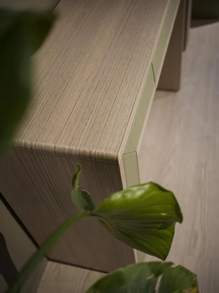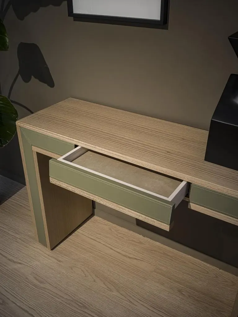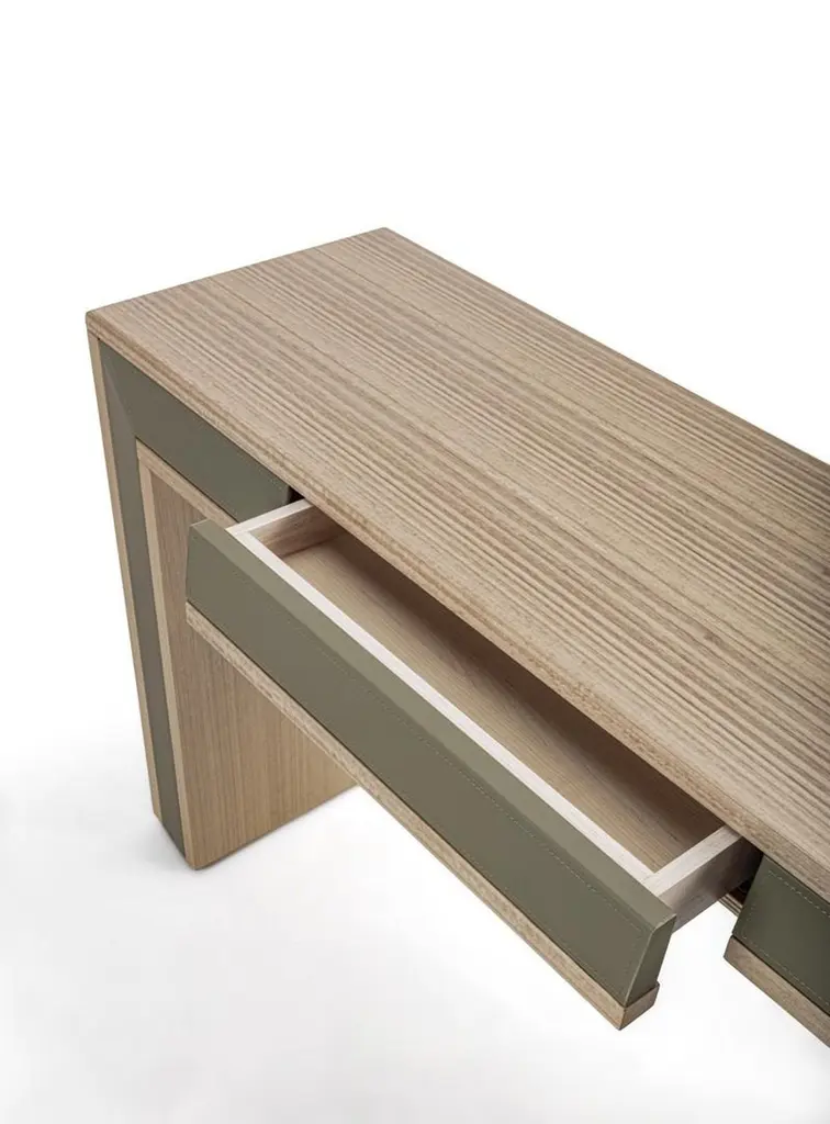 Console table with a light and linear design, characterized by the combination of natural tones of wood and leather. Presented in Eucalyptus rope F129, equipped with a front drawer with rallenty system. Also realizable in other wood finishes. Leather available in different colors.