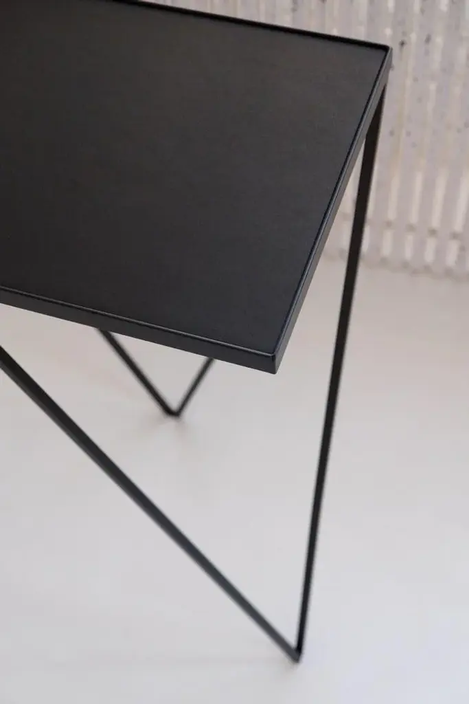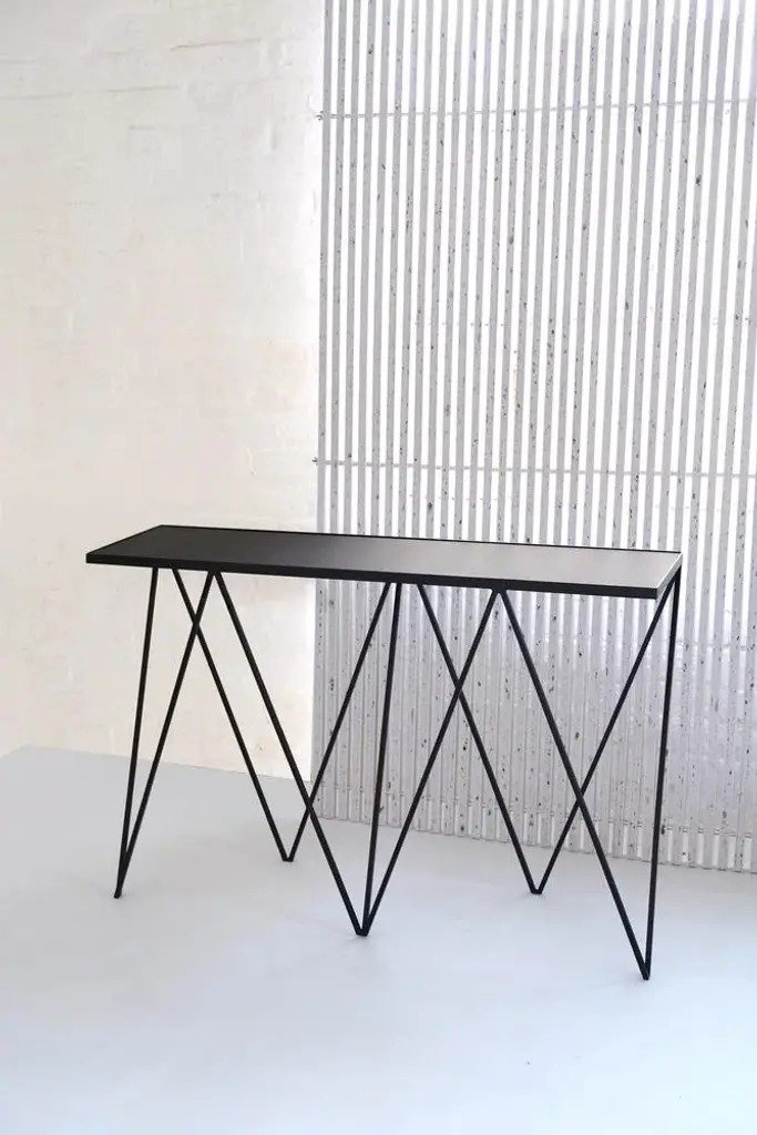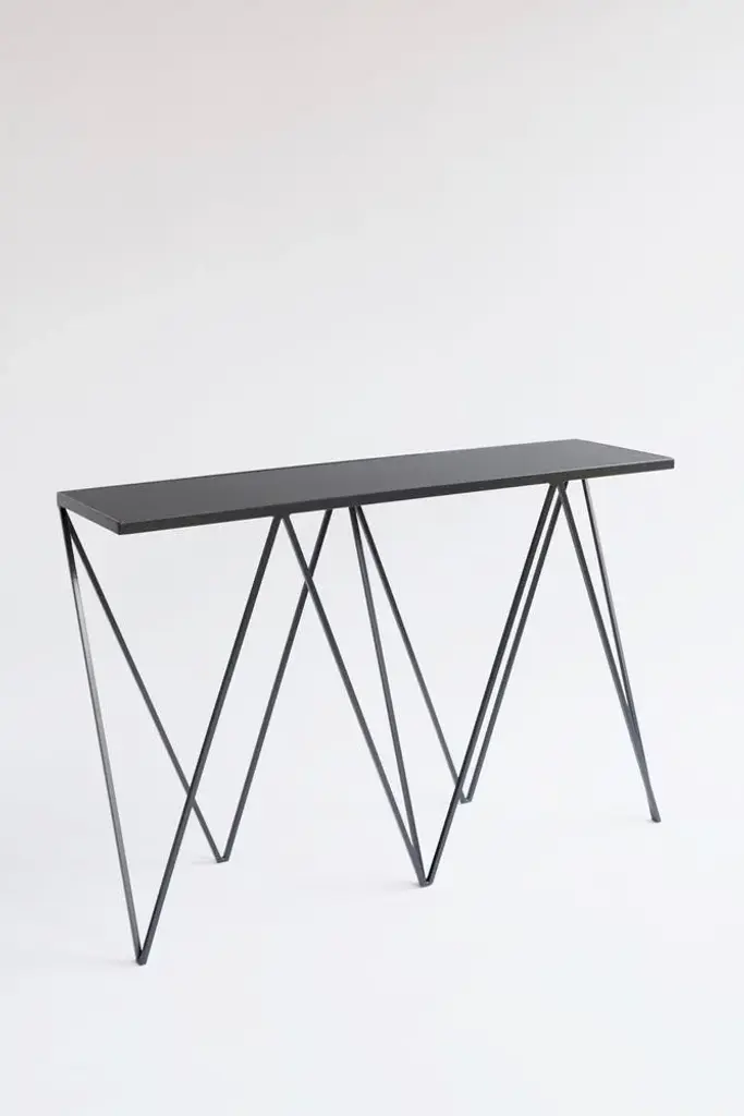 The Giraffe console table is a modern statement piece designed with a hallway in mind. The elegant proportions allow for the Giraffe console to fit well in both modern and period architecture. Made in solid steel with a natural linoleum top. The linoleum is made with linseed oil and wood flour, rosin, and limestone. The luxurious console is available in different colours, please ask. This console is charcoal black. The Giraffe Console Table holds the prestigious Design Guild Mark for its outstanding design and quality. All &New products are manufactured in Britain in small batches. They have plenty of character as every weld is different. The result is a collection of furniture that celebrates the handmade qualities that make objects beautiful. Labeled by Maker