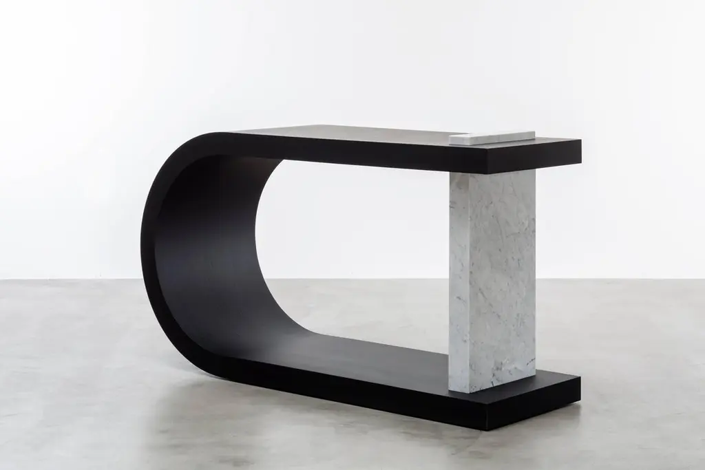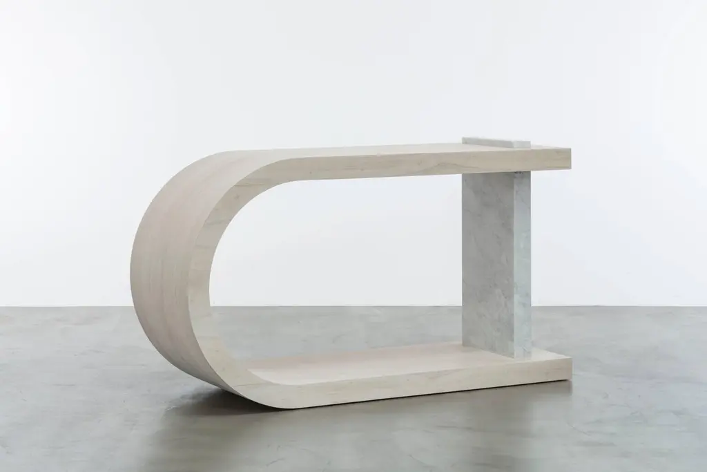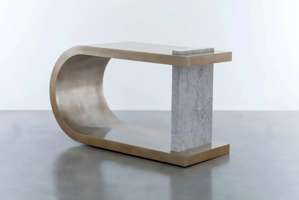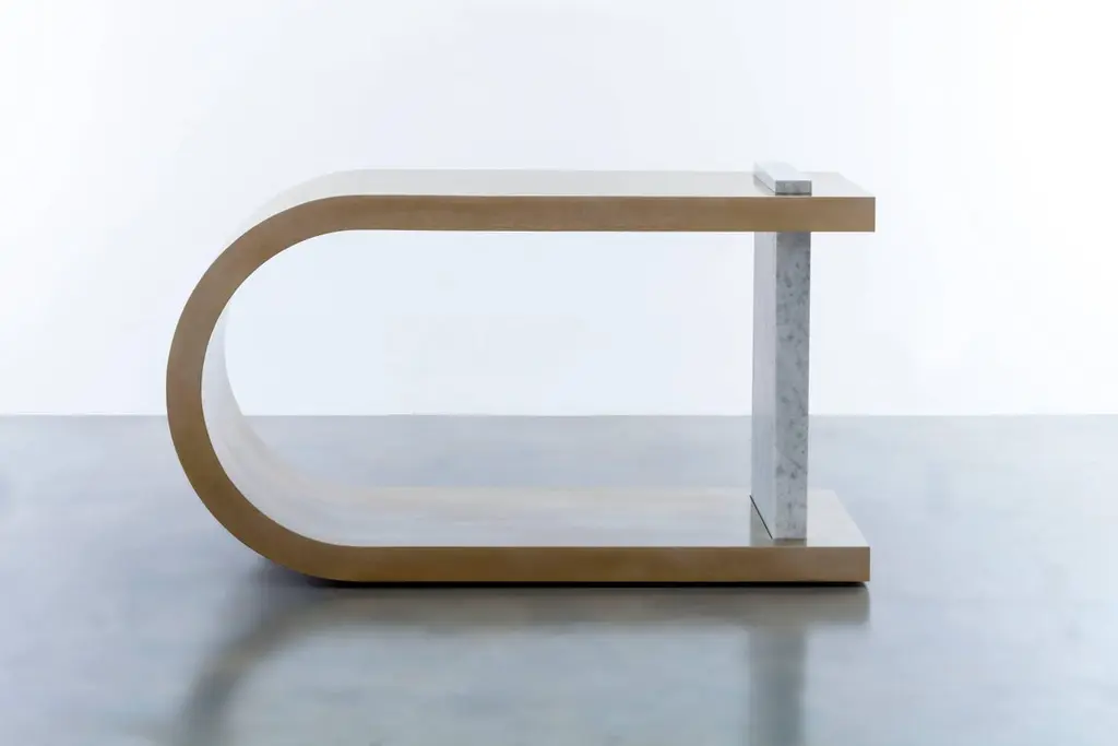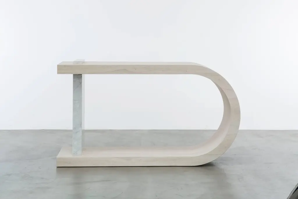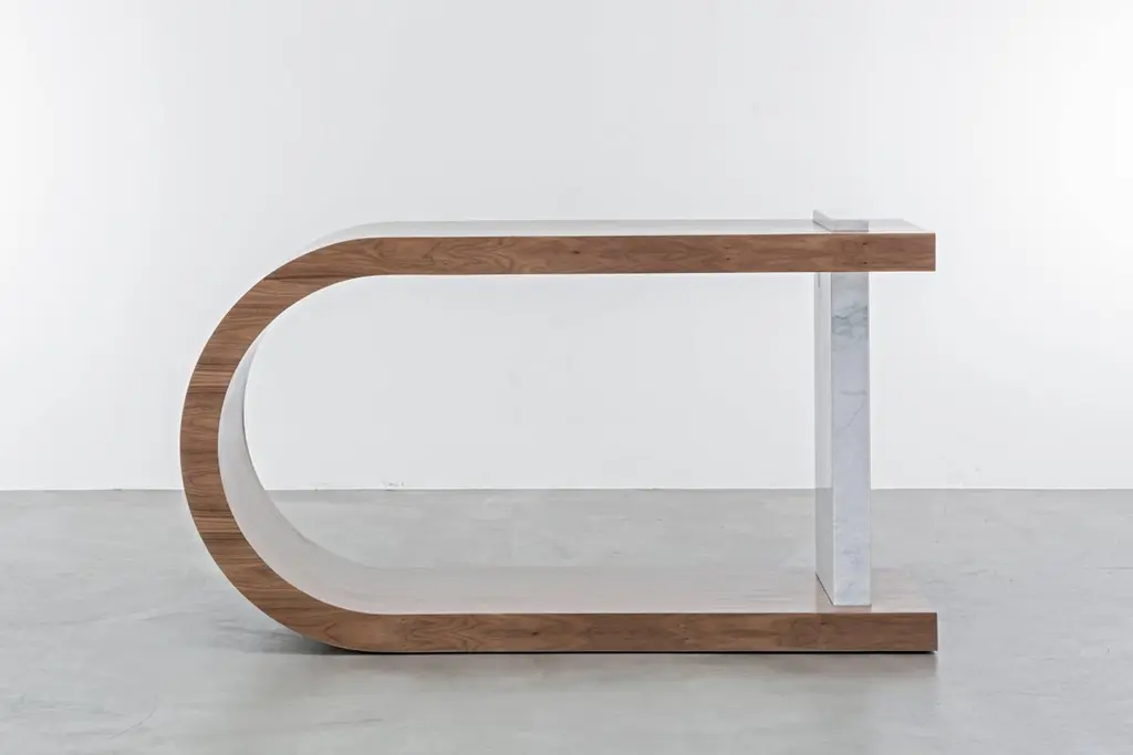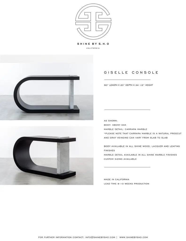 GISELE CONSOLE TABLE - Modern Table with Curved Walnut and Marble DetailThe Gisele console table is a modern and luxurious piece of furniture that combines style and function in a unique and beautiful way. This console table features a wood or leafed curved body and marble detail, giving it a sleek and modern design that will add a touch of elegance to any living space.This console table is fully customizable and made to order in California, allowing you to choose the perfect size and finish to match your decor. It is shown here in bleached white oak, with a starting price of $20,690, making it a high-end and luxurious piece of furniture. As shown $23,140.The Gisele Console Table is not only stylish but also functional, providing a spacious surface for displaying decorative items, books, or other items. Its wood or leafed curved body and marble detail add a touch of sophistication to any living space, making it a perfect addition to a modern or contemporary home.Overall, the Gisele Console table is a stunning work of art that combines modern design with luxurious materials. Its customizable options and functional design make it a perfect addition to any living space, adding a touch of elegance and sophistication to your home.