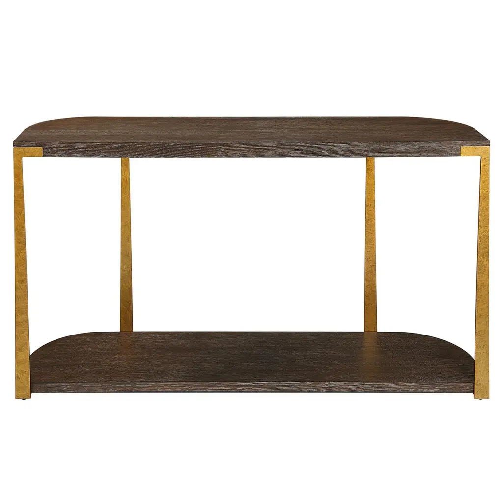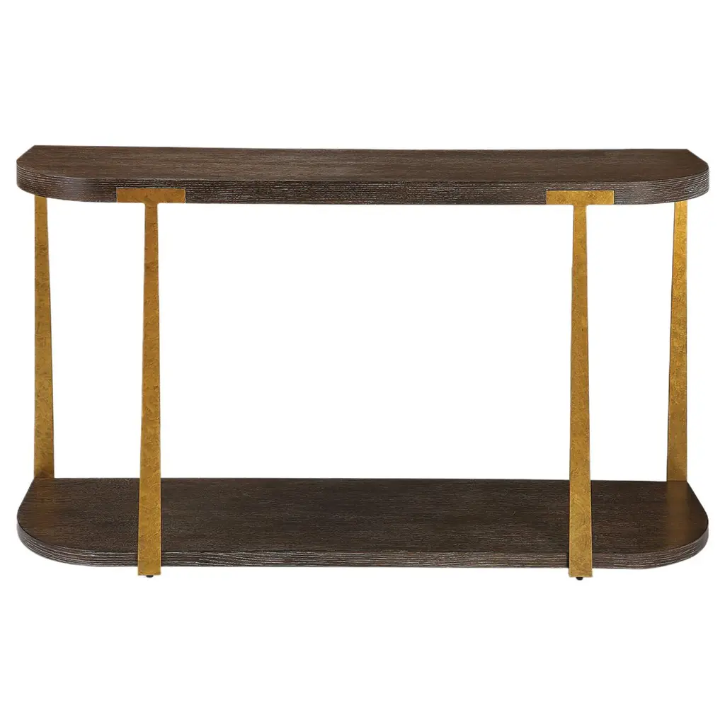 The Giulio Console Table is a masterpiece of elegance and sophistication, designed to captivate and enchant. Its rich oak veneer, reminiscent of a deep, aromatic coffee, exudes warmth and invites you to linger in its presence. The natural wood grain details tell a story of timeless beauty, each line and Carlo a testament to nature's artistry. Forged metal columns, with their mottled antique gold finish, stand as proud sentinels, adding a touch of regal charm to this exquisite piece. The Giulio Console Table is not just a piece of furniture; it is a celebration of craftsmanship and style, destined to become the heart of your home.