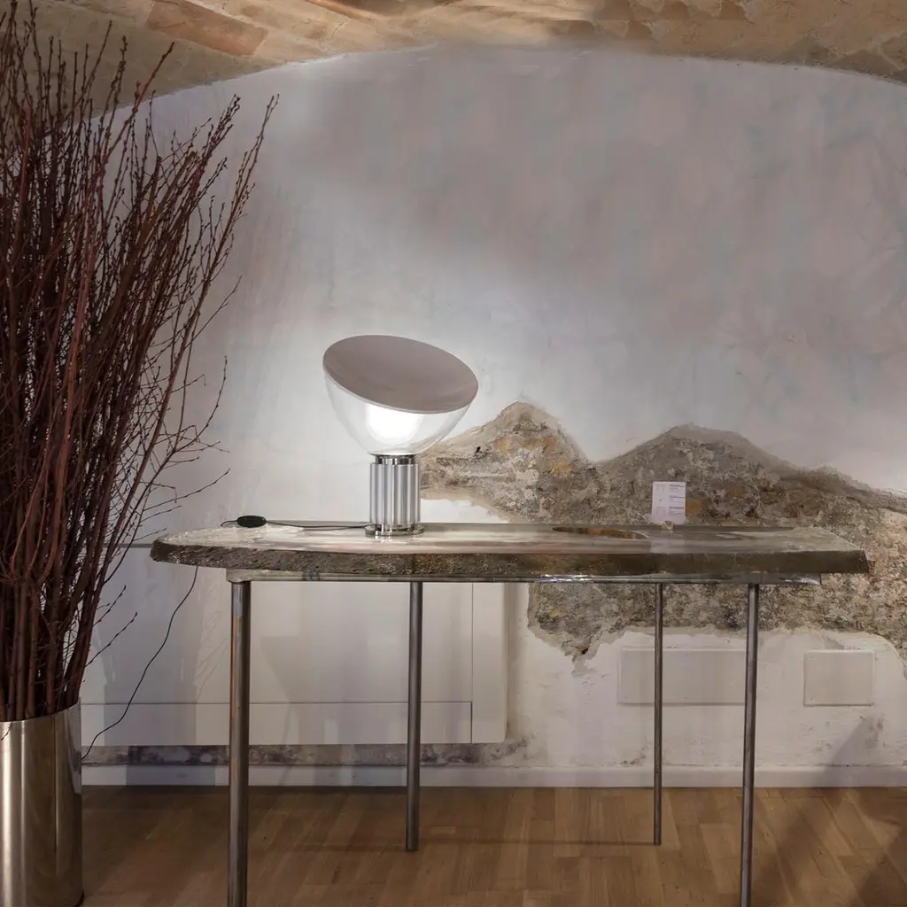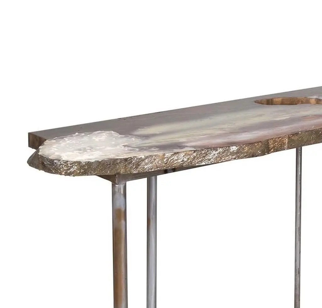 This exclusive sculpture-table is both decorative and functional and will be a statement addition to a contemporary interior. The top is made of solid paulownia and fir from salvaged trunks, that are treated with epoxy resins, acrylics, and stucco to enhance the distinct grains and natural imperfections of the wood. The surface alternates between opaque and glossy parts, rough and smooth areas without precise boundaries to create a deliberate unevenness. Raised on four tubular legs of brushed steel, the top features a resin-treated recess designed to be used as a vide-poche.