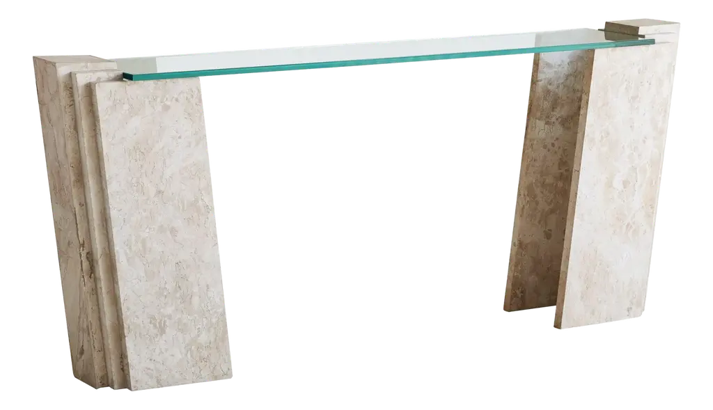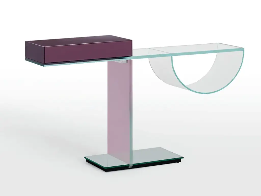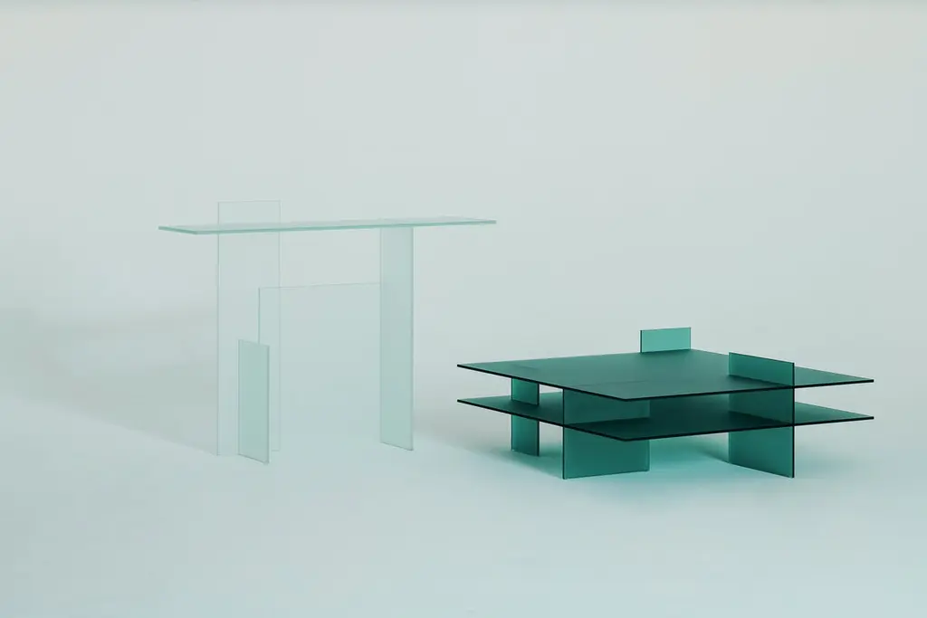 Collection of furniture consisting of shelves, console and low table, completely made of a special 10 mm tempered double-sided green acid-etched glass, or, in 6+6 mm laminated double-sided acidetched extralight glass. Each item is a composition of interlocked and overlapping glass sheets which, through a special UV bonding method, give shape to pure and refined sculptural furnishing elements characterized by a rigorous form. Available in different version:Finish: green glass, extralight glassDIMENSIONS:L 124 - P 33 - H 92Price refers to the extralight version.