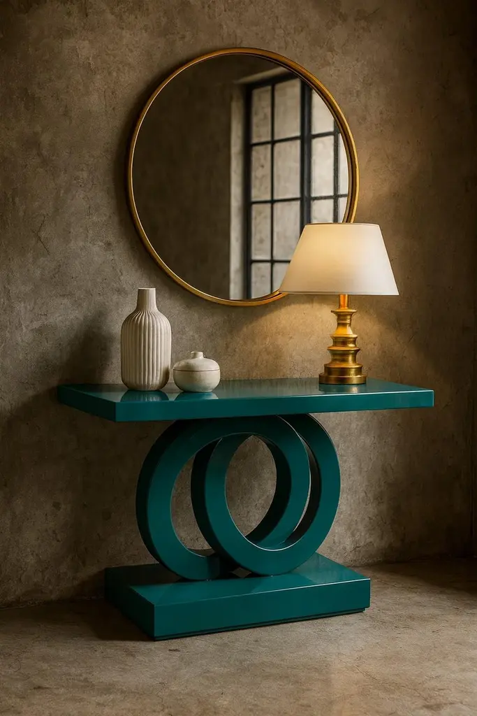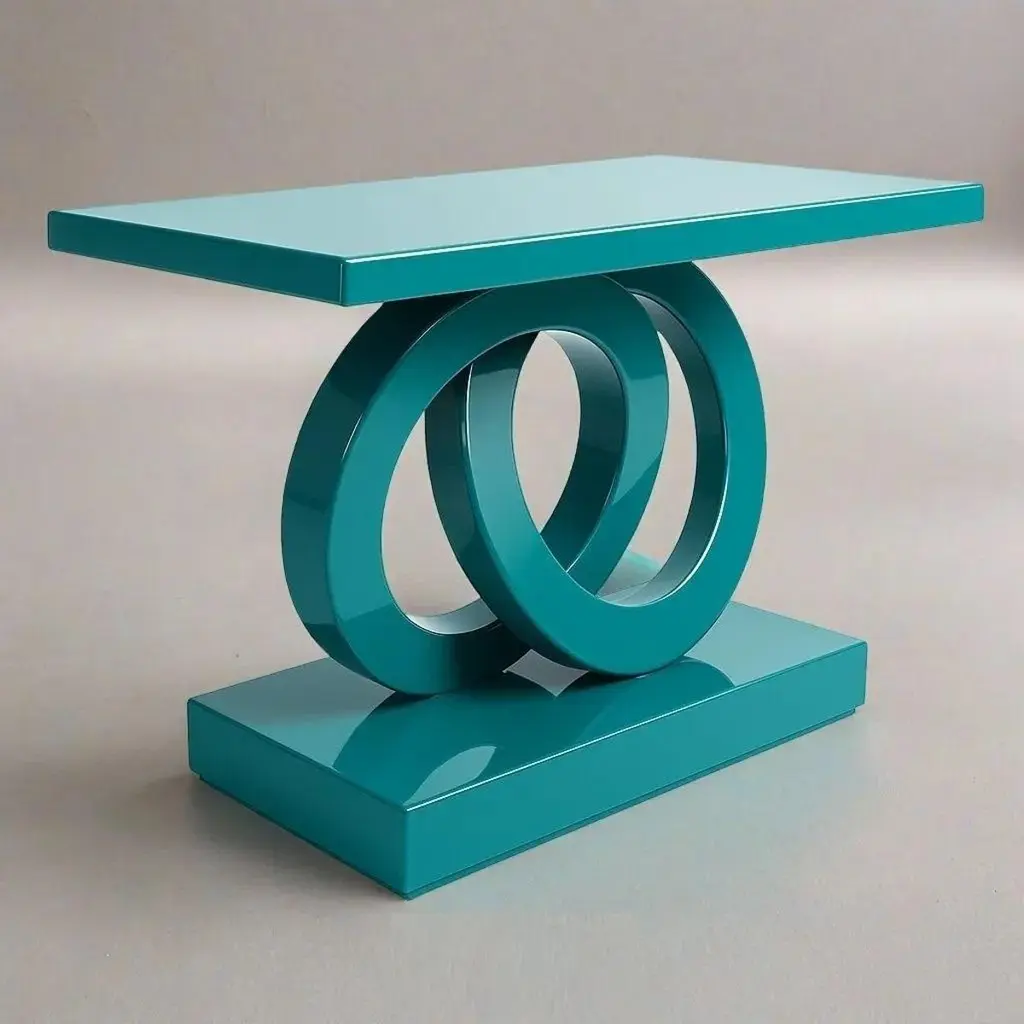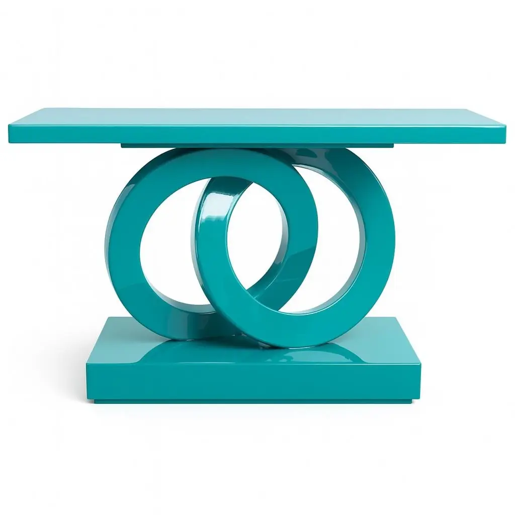This is a striking, modern console table featuring a vibrant, glossy teal lacquer finish. The tabletop is a sleek, rectangular slab with clean lines. Its most distinctive feature is the base, composed of two intertwining, sculptural circular forms that create a dynamic and visually interesting support. These circular elements rest on a solid, rectangular base that mirrors the color and glossy finish of the rest of the table. The overall design is minimalist yet bold, making it a statement piece suitable for a contemporary interior.Contact us for enquire about finish and size customizations.We do our best to expedite production and to ship and deliver product within the listed lead time, however current lead times might be longer due to global shipping backlog and delays. These delays are out of our control and cannot be a reason to cancel an order.