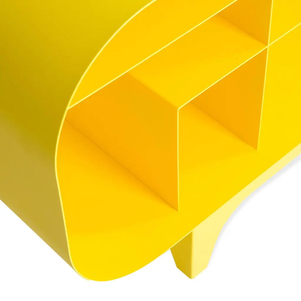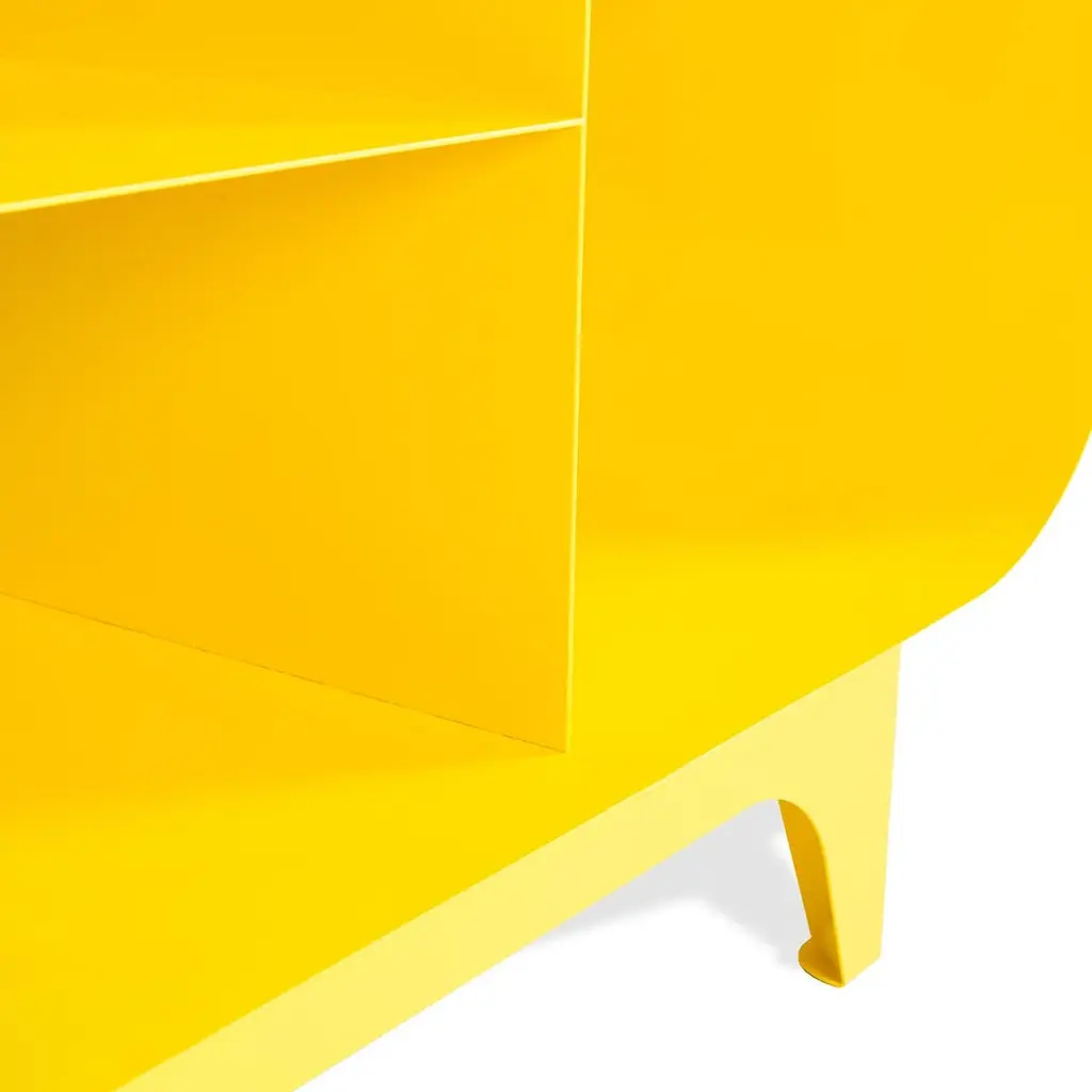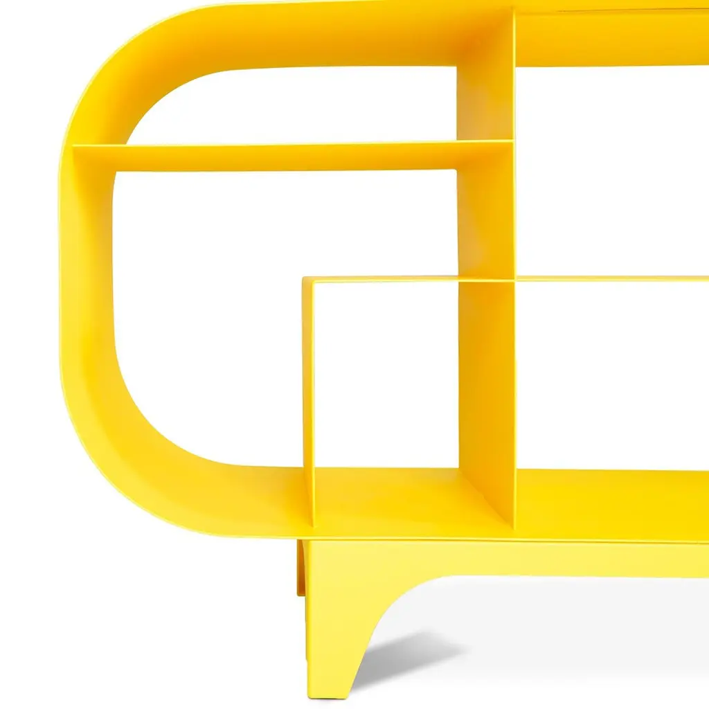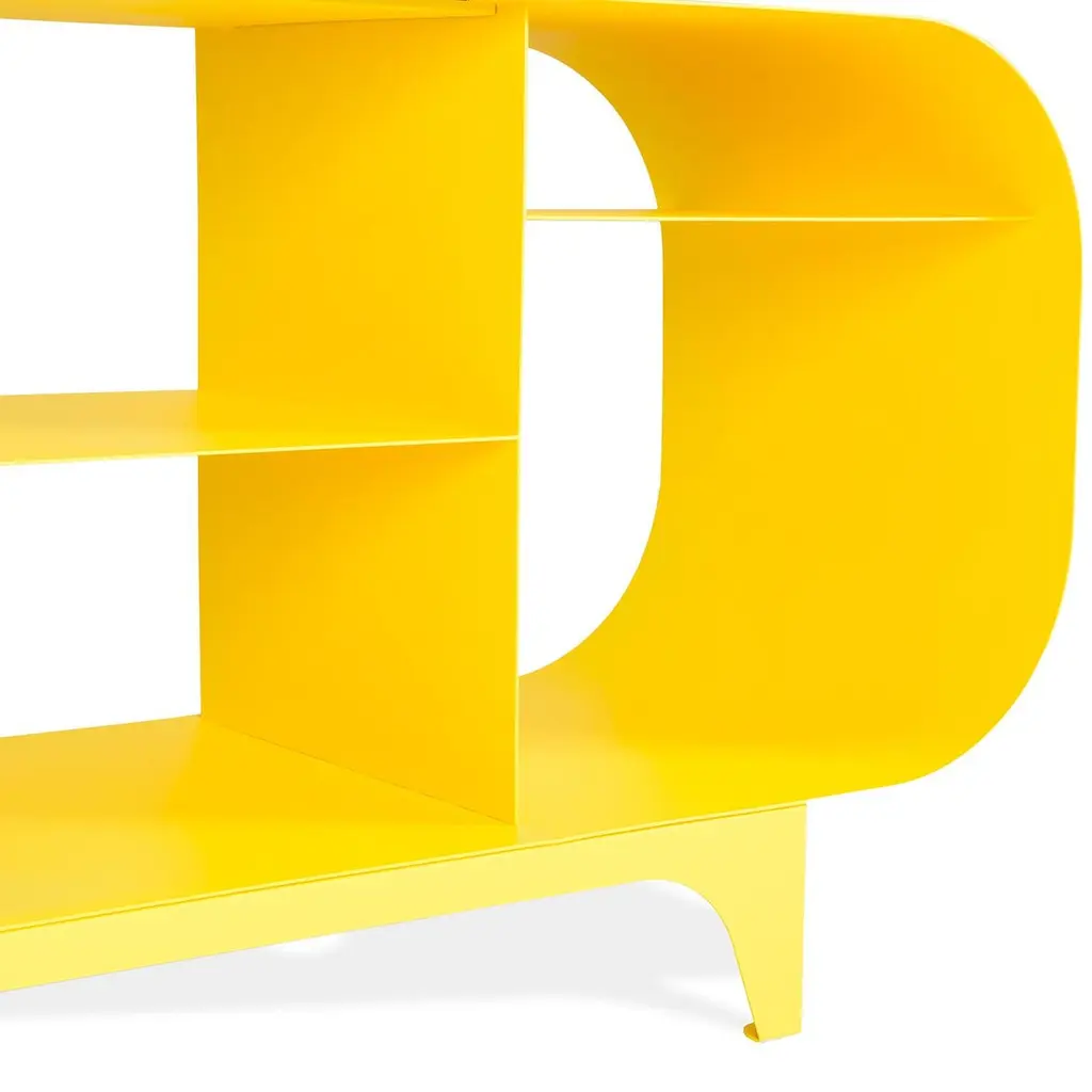 Defined by bold curves and smooth, geometric lines, this exceptional console is crafted of steel sheets in a vivid yellow color and boasts a minimalist design with an elongated oval frame and three shelves arranged at different heights. Combining traditional craftsmanship with modern laser-cutting technology, this 1950s-inspired design will infuse aesthetic lightness and elegance into any interior, where it can be used as a media cabinet or versatile bookshelf. It is available in other colors.