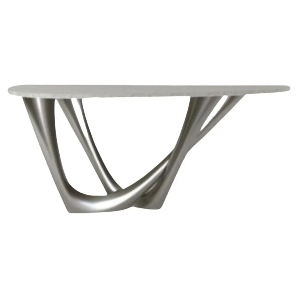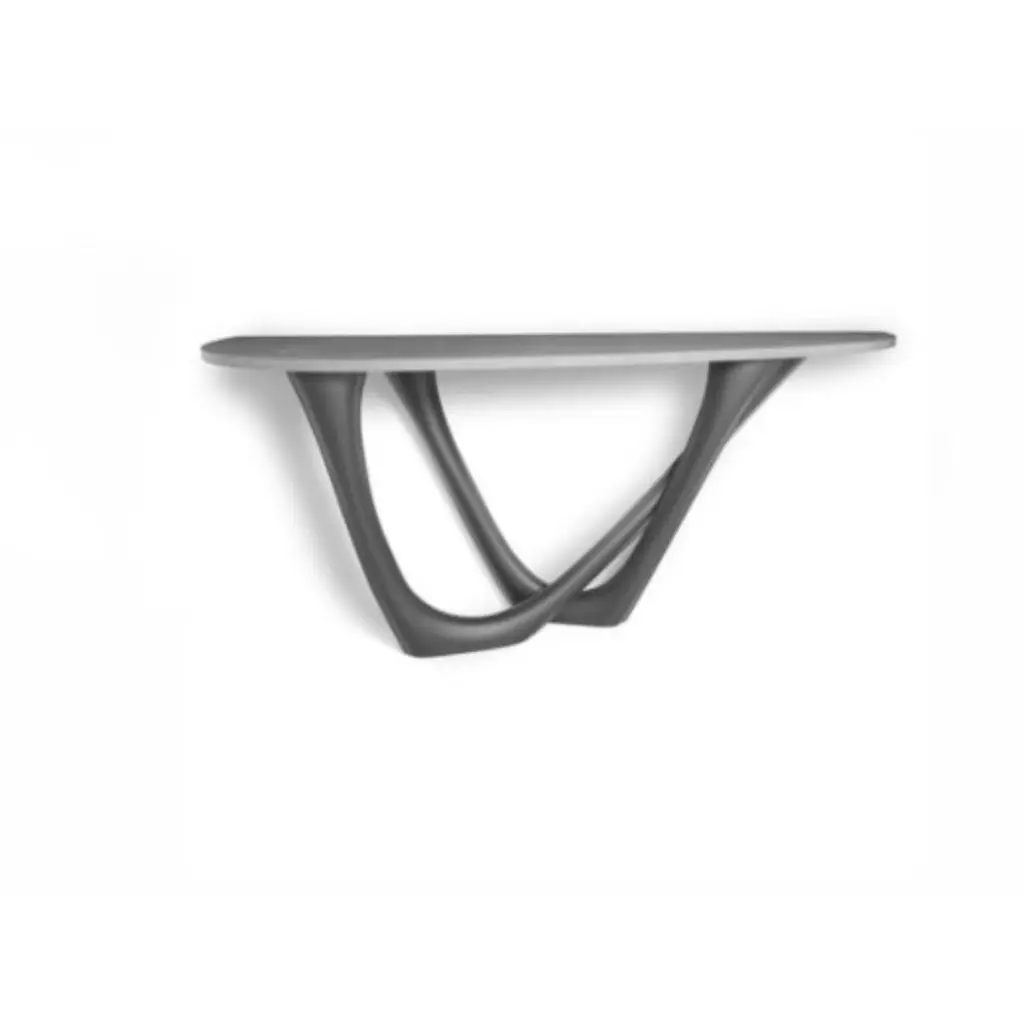 Graphite G-console duo concrete top and steel base by ZietaDimensions: D 56 x W 168 x H 75 cm Material: Carbon steel, concrete.Also available in different colors and dimensions.G-Console is another bionic object in our collection. Created for smaller spaces, it gives another possibility in interior planning and at the same time preserves the unique shape of the original G-Table. Both objects were made for enthusiasts of bionic forms. Made with FiDU technology, it reminds of vines or tree roots. Nature symbolizes a constant changeability and harmony that comes out of it. A diverse structure refers to both natural forms and processes. G-Console comes in two versions – Mono and Duo.About Zieta: Zietas main goal is to deliver uniqueness and customization in design and construction while keeping the production, transport, and warehousing innovatively efficient.This is how they imagine the future world: Light, durable structures of customized applications produced on demand out of one-of-a-kind parts, yet efficiently.They use a computer-controlled production process. Customized pattern, customized form, customized function, one-of-a-kind product, and outstanding precision are what they deliver.You will find all of this philosophy reflected in the products. They research, they discover new possibilities, they play with forms and they deliver a beautiful, innovative, surprising outcome to people who love the design and who care about design development.They believe their work is a valuable contribution to the world of design not only by the unique beauty of the forms but most of all by opening ultra-innovative opportunities of forming and new paths for the world of the future.