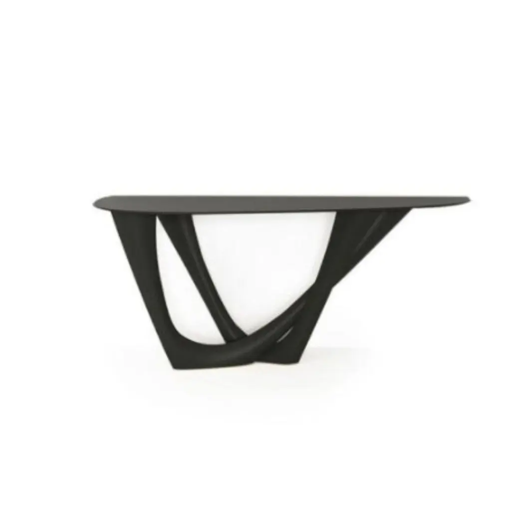 Graphite G-console duo steel base and top by ZietaDimensions: D 56 x W 168 x H 75 cm Material: Carbon SteelAlso available in different colors and dimensions.G-Console is another bionic object in our collection. Created for smaller spaces, it gives another possibility in interior planning and at the same time preserves the unique shape of the original G-Table. Both objects were made for enthusiasts of bionic forms. Made with FiDU technology, it reminds of vines or tree roots. Nature symbolizes a constant changeability and harmony that comes out of it. A diverse structure refers to both natural forms and processes. G-Console comes in two versions – Mono and Duo.About Zieta: Zietas main goal is to deliver uniqueness and customization in design and construction while keeping the production, transport, and warehousing innovatively efficient.This is how they imagine the future world: Light, durable structures of customized applications produced on demand out of one-of-a-kind parts, yet efficiently.They use a computer-controlled production process. Customized pattern, customized form, customized function, one-of-a-kind product, and outstanding precision are what they deliver.You will find all of this philosophy reflected in the products. They research, they discover new possibilities, they play with forms and they deliver a beautiful, innovative, surprising outcome to people who love the design and who care about design development.They believe their work is a valuable contribution to the world of design not only by the unique beauty of the forms but most of all by opening ultra-innovative opportunities of forming and new paths for the world of the future.