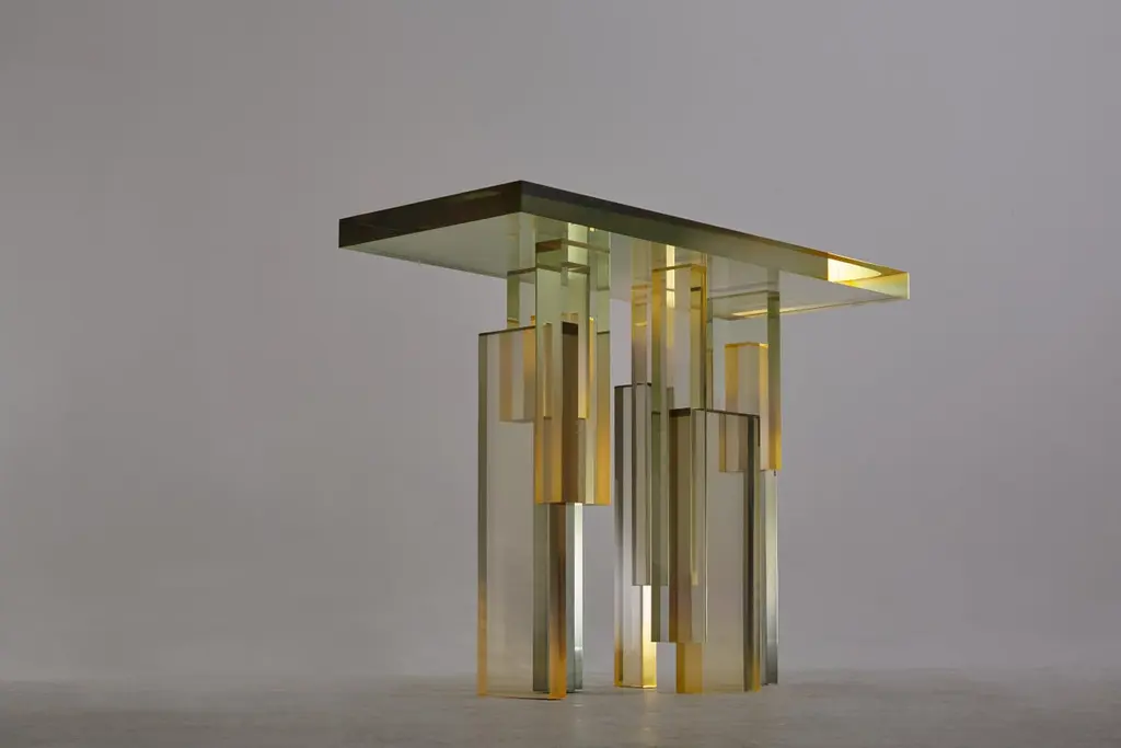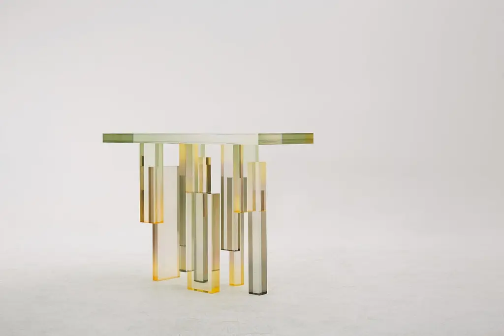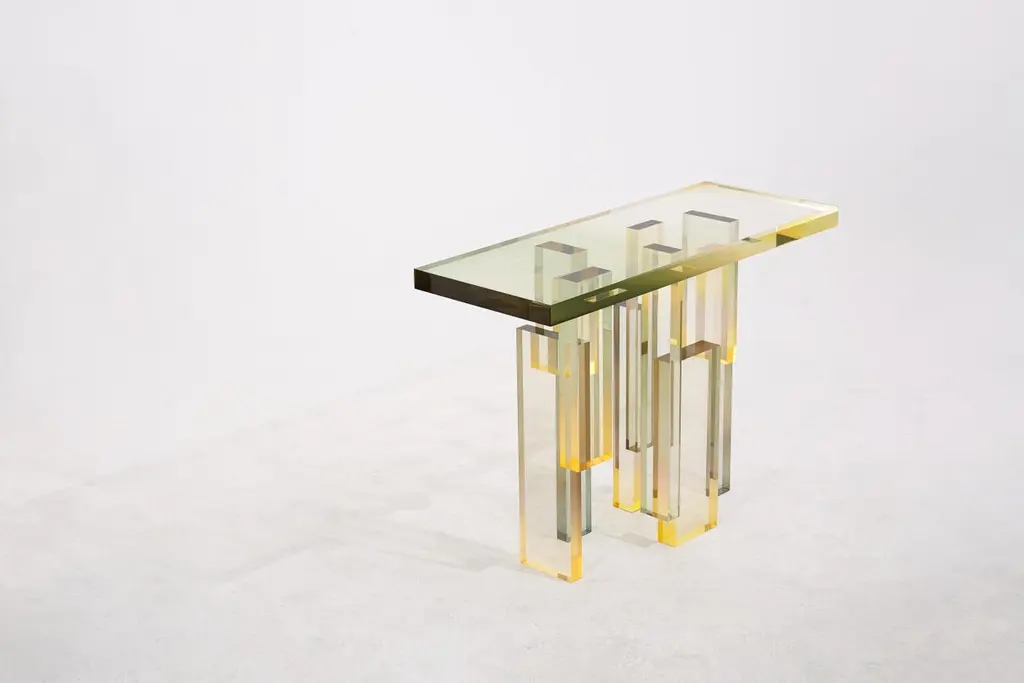 Console Table 02 by Saerom YoonLimited Edition No. 04 of 8 + 2APDimensions: D 43 x W 110 x H 80 cm.Materials: Acrylic.My oldest childhood memories go back to the time I spent in the Philippines with my parents. The green mountains, the emerald green ocean, and every scene of me playing on this small and beautiful island still reside in me. Among them, my favorite was the beach at sunset. The memory of sitting on the beach with my family while feeling the cool breeze as the hot midday sun sets is my most precious memory.This series [ A Piece of One Day ] and [ Crystal Series ] present the fragments of my memories, the emotions of looking at the afterglow on an exceptionally stunning day, and the moments of looking up at the sunlight and the leaves sparkling under the shade of hot summer sun. By sharing this series, I wish to show the perspective of seeing nature as the space and time surrounding us along with my own experiences.I intend to give the audience a strong visual impulse to share these experiences. With these extraordinary visual catalysts, I hope to share my memories with the audience, and the experience imprints in their hearts as a piece of one day.