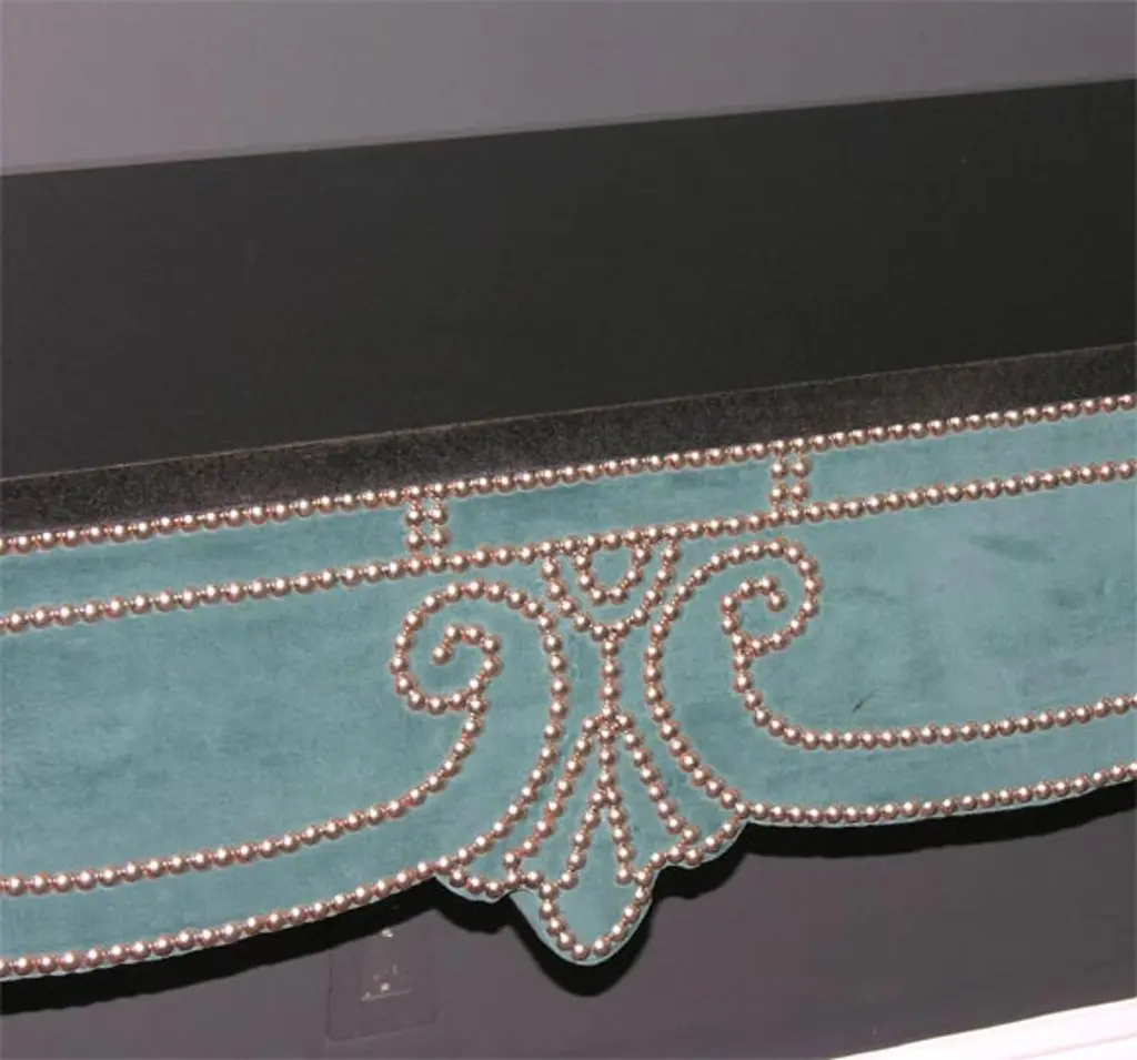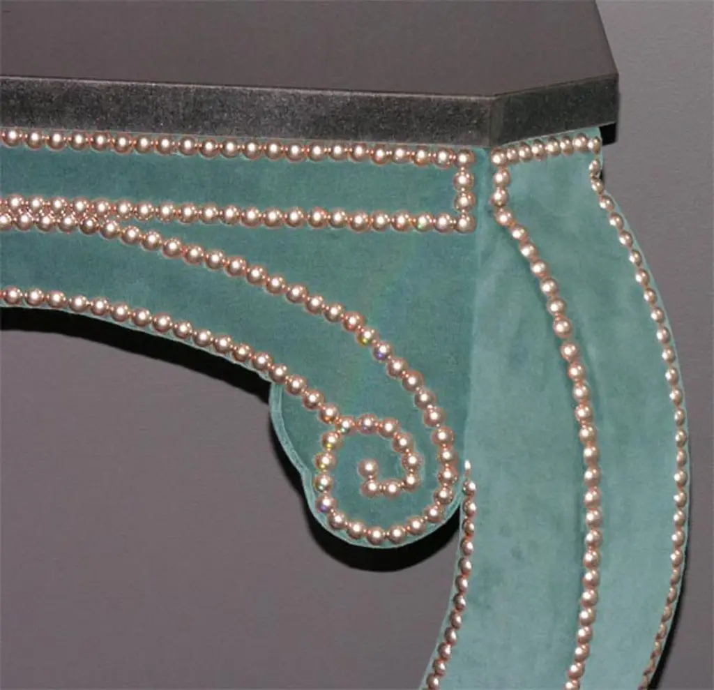 Green teal velvet wall mount console with black granite top. Customization is available in different sizes and fabrics (COM).