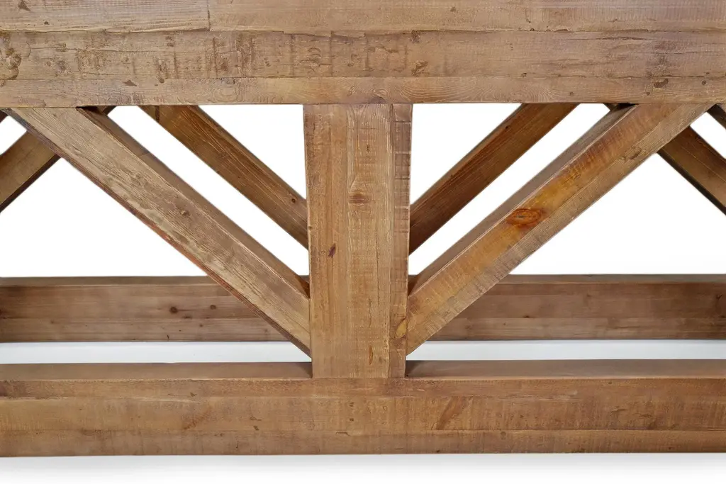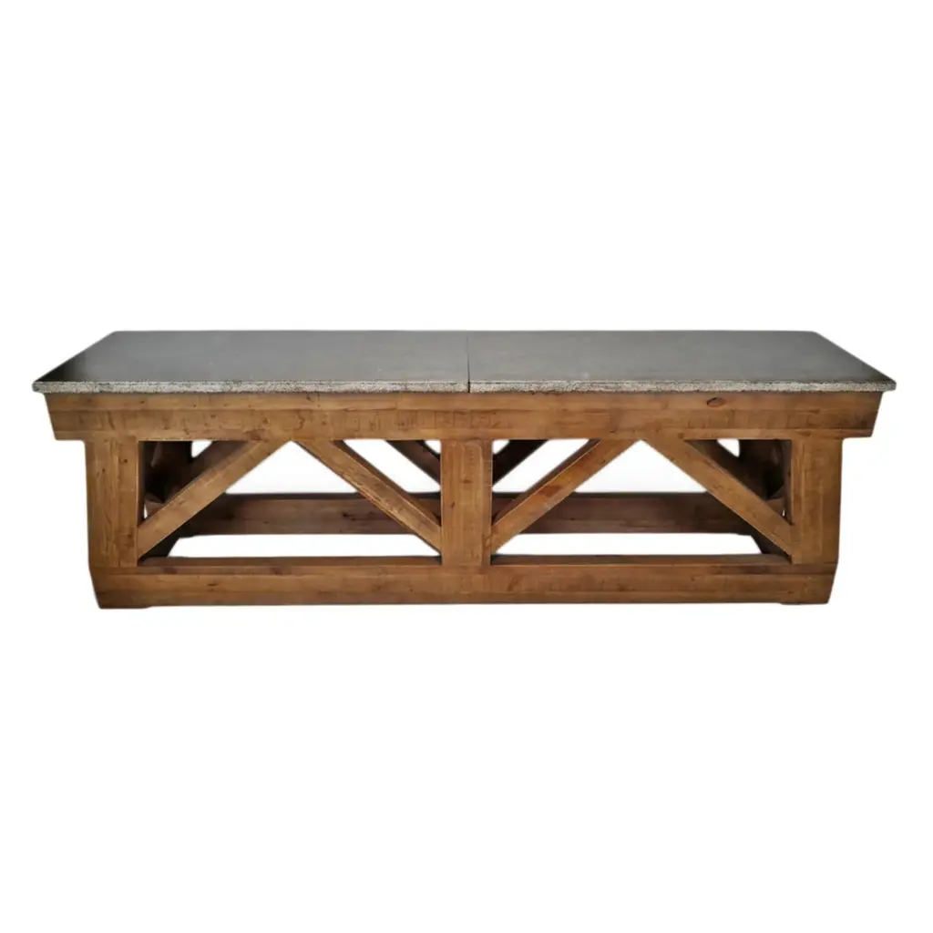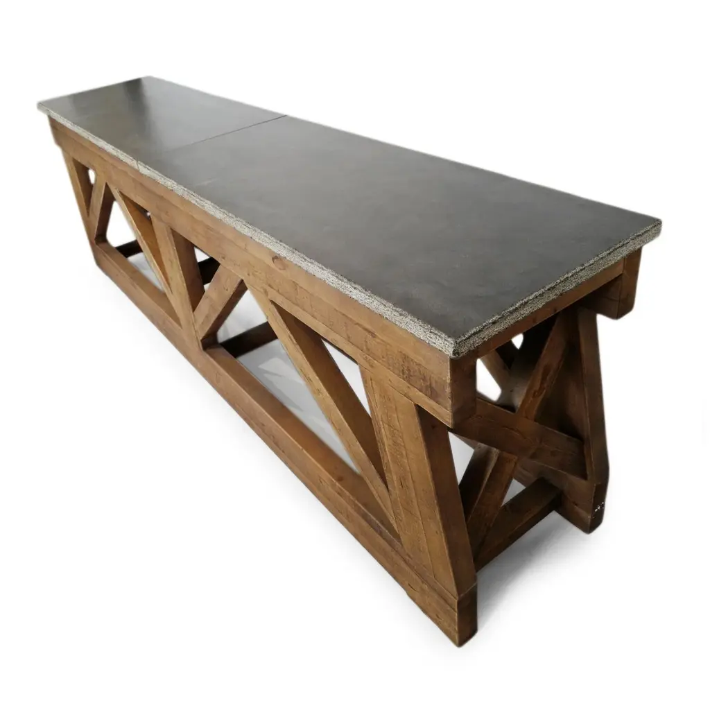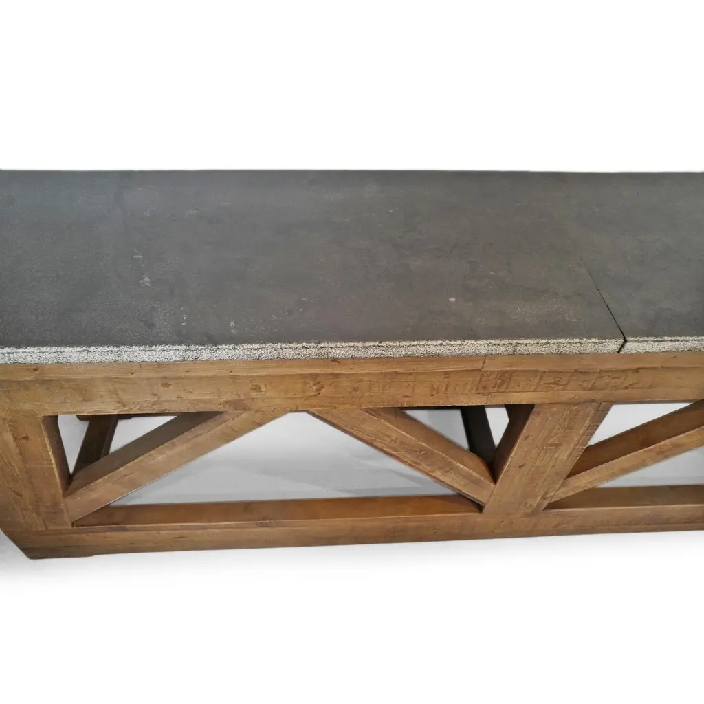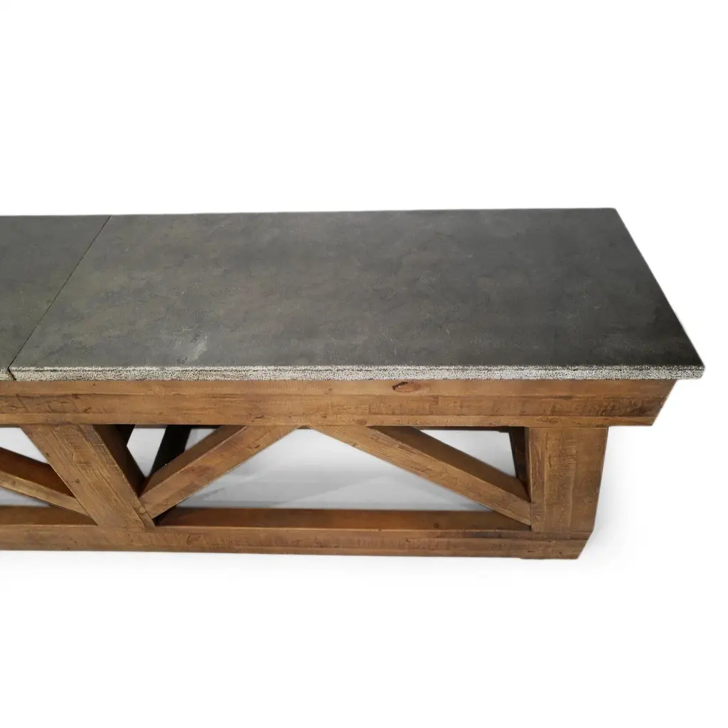 Stunning natural greystone slate matte polished top console table with sturdy reclaimed pine farm wood base. Hand distressed finish with natural varied wood grain. Each console will have natural variations which are inherent to the materials. Great pieces for many interior design styles used indoor or exterior undercover. This piece weighs approx. 480 lbs.