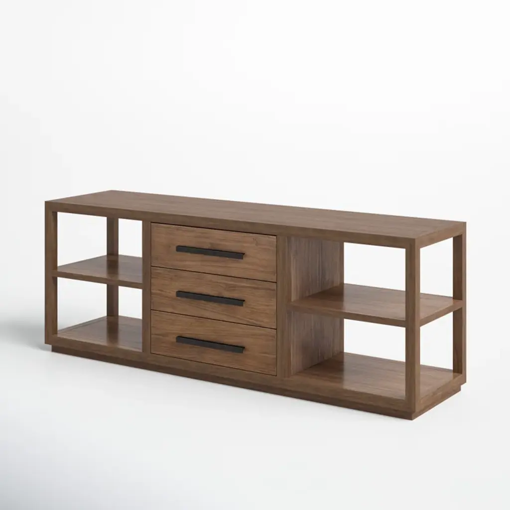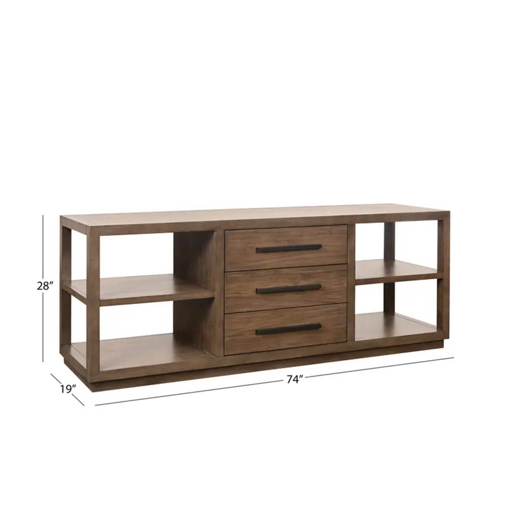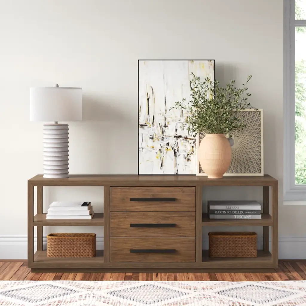 Hale’s solid acacia construction, natural blonde finish, and antique bronze hardware are designed to complement any space. With ample open space for curated vignettes and enclosed drawer storage, this media console strikes a perfect balance of form and function.