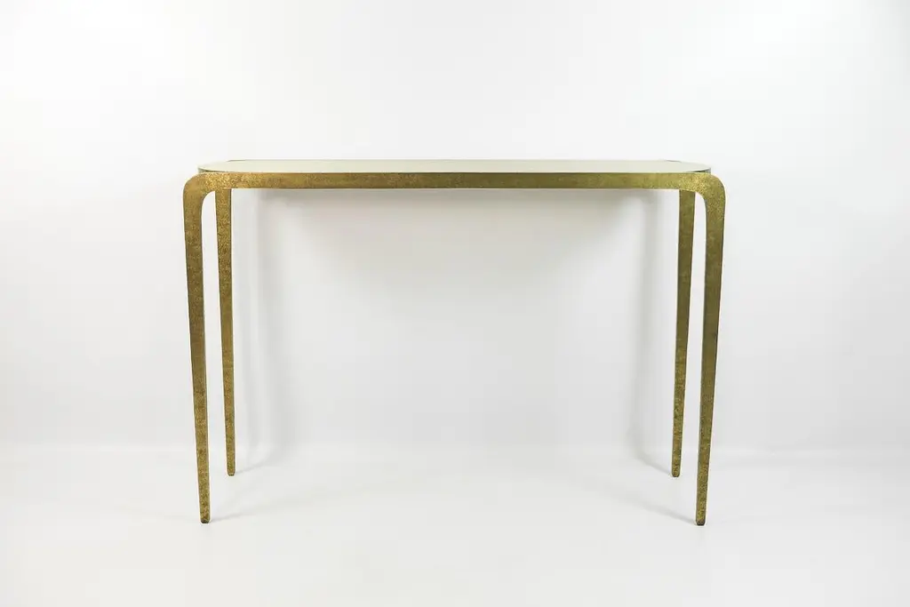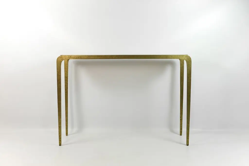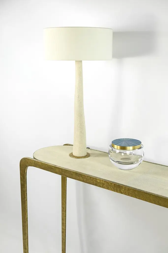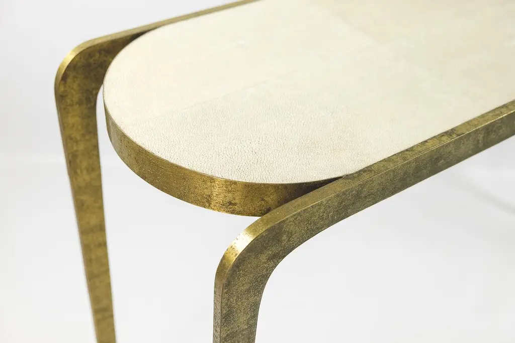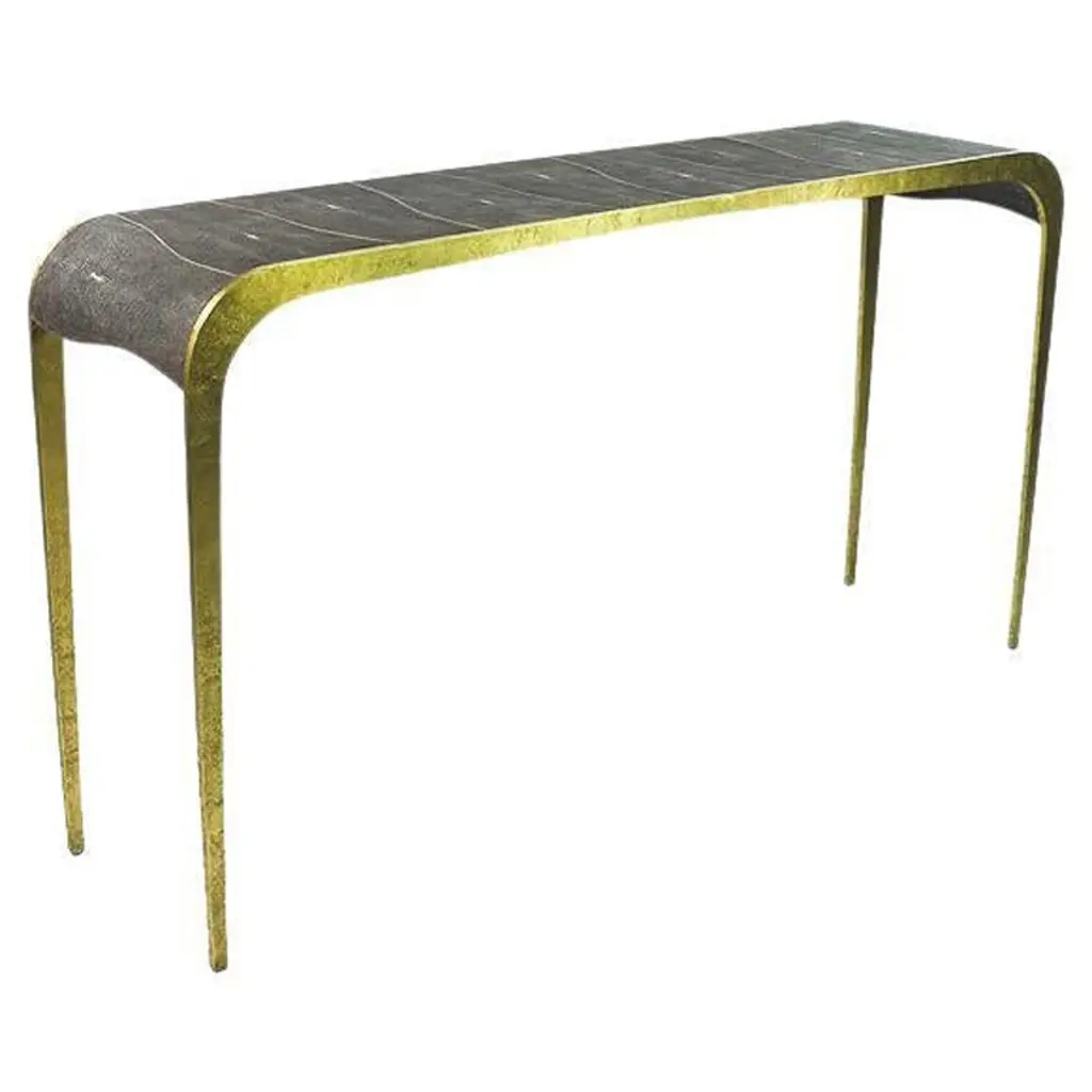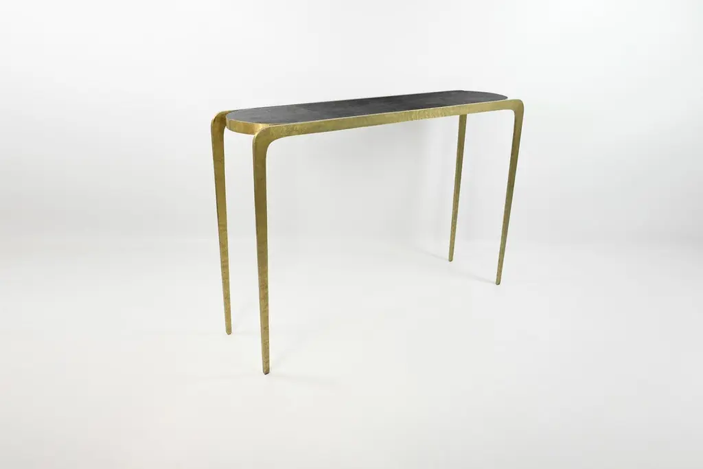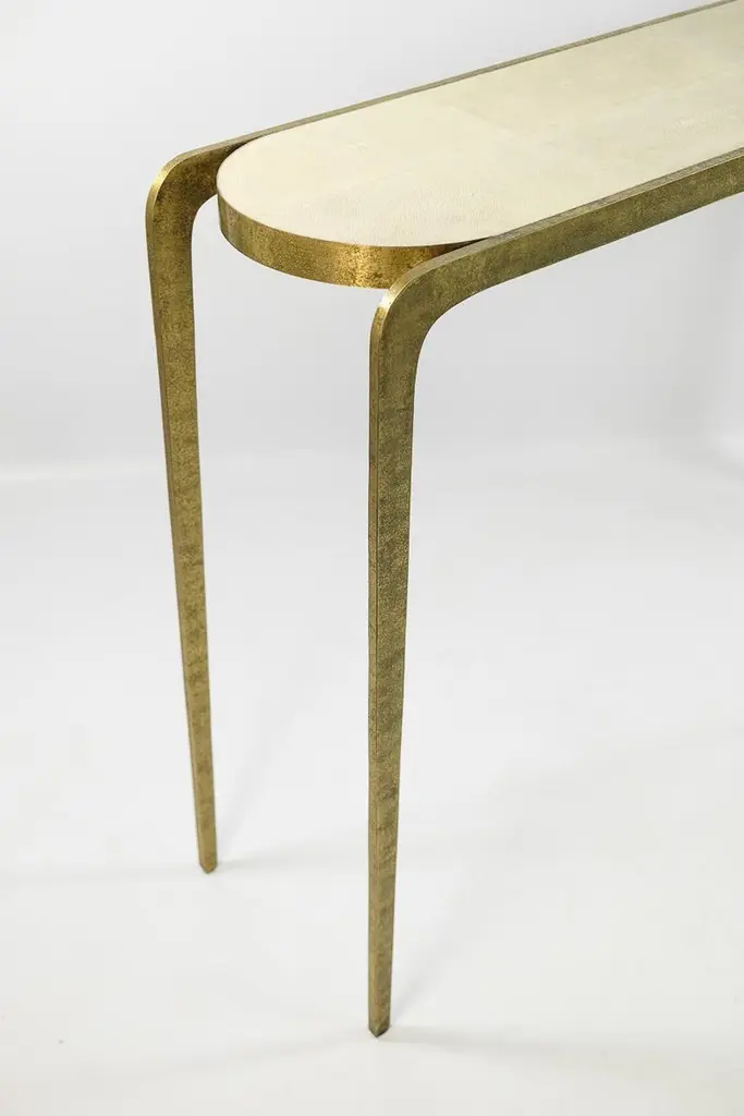 The console table "Visio" is made of a hammered brass structure.The top is covered with natural shagreen.An elegant console table with an aerial design. When less is more !A perfect piece for an entrance or a living room. The dimensions are 42.27" x 13.78" x H 31.5"We can customize the dimensions and the shagreen color.See various finishes in the last photos of the gallery. Care instructions:Keep the materials dry and protected from direct sunlight and heat surfacesTo clean, simply wipe with a dry clean clothDo not use any cleaning agent on the surfaceThis piece is 100% handmade by our talented master craftsmen.USA trade customers: This piece is made of shagreen and you will need to obtain a fish and wildlife licence to import it in the US (If you don't have one already).The cost is approximately 150$ and is delivered within 1 month.We can assist you with the procedure to obtain it.The private clients are not concerned about this FWS licence.