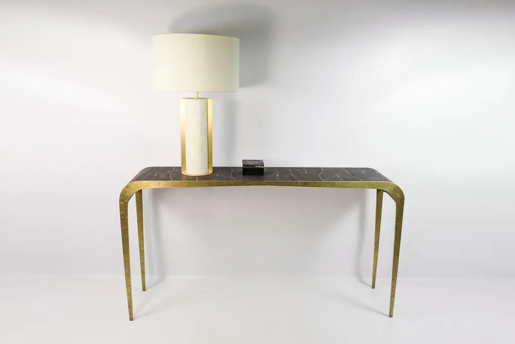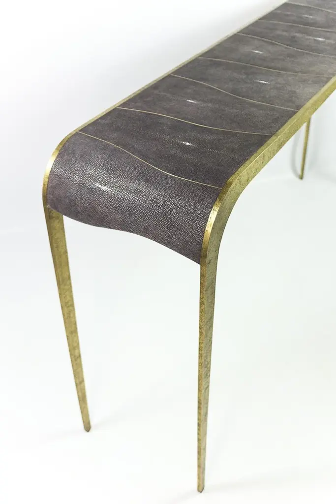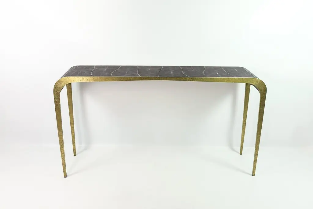 The console table "Fluctus" is made of a hammered brass structure.The top is covered with dark grey shagreen and brass trims.The revisited waterfall design makes this console classic and modern in a same time.A perfect piece for an entrance or a living room. The dimensions are 59" x 13.78" x H 31.5"We can customize the dimensions and the shagreen color.See various finishes in the last photos of the gallery. Care instructions:Keep the materials dry and protected from direct sunlight and heat surfacesTo clean, simply wipe with a dry clean clothDo not use any cleaning agent on the surfaceThis piece is 100% handmade by our talented master craftsmen.