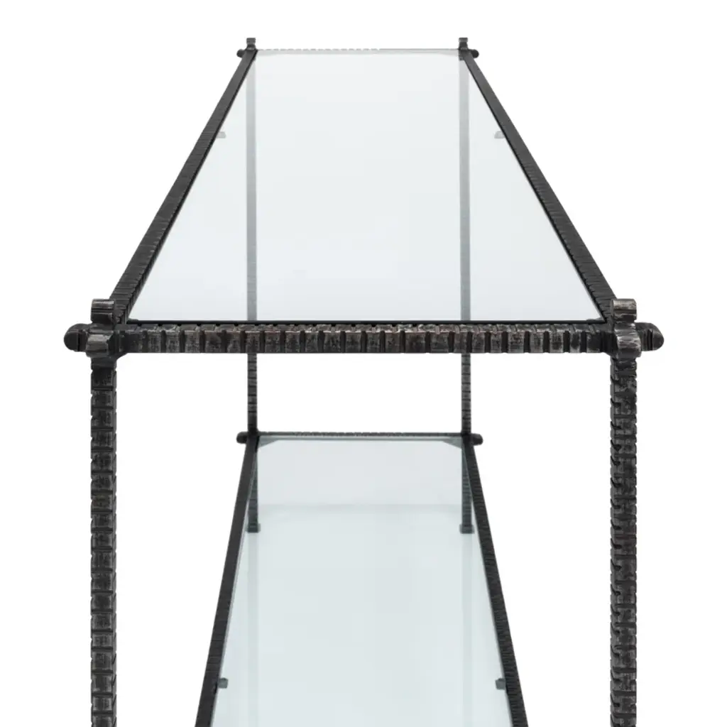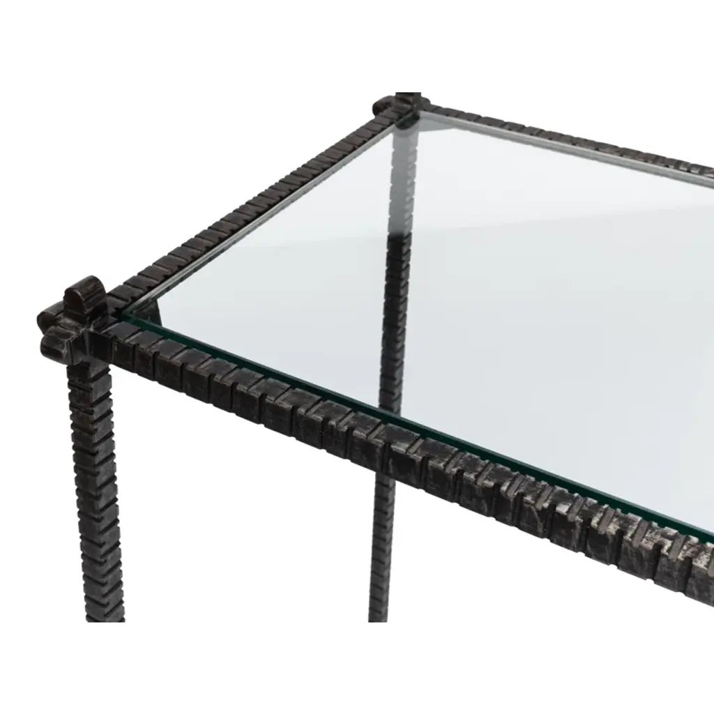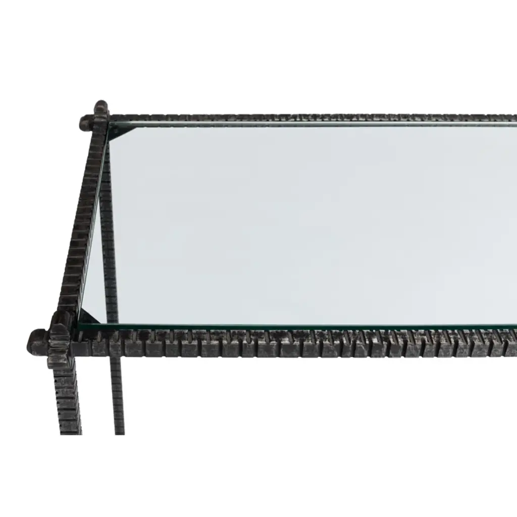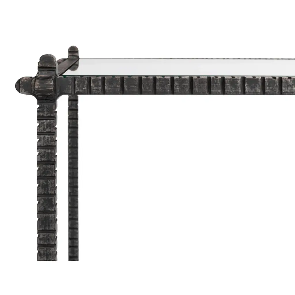 The frame of our Hand Chased Iron Console Table is solid iron bar stock that is hand wrought and incised with continuous ridges on all 4 sides. The 3 points corners are an amazing example of the craft of making wrought iron.