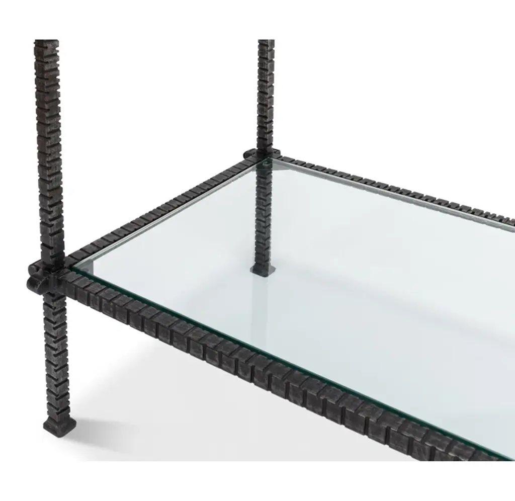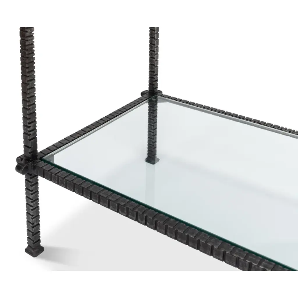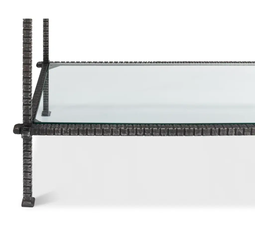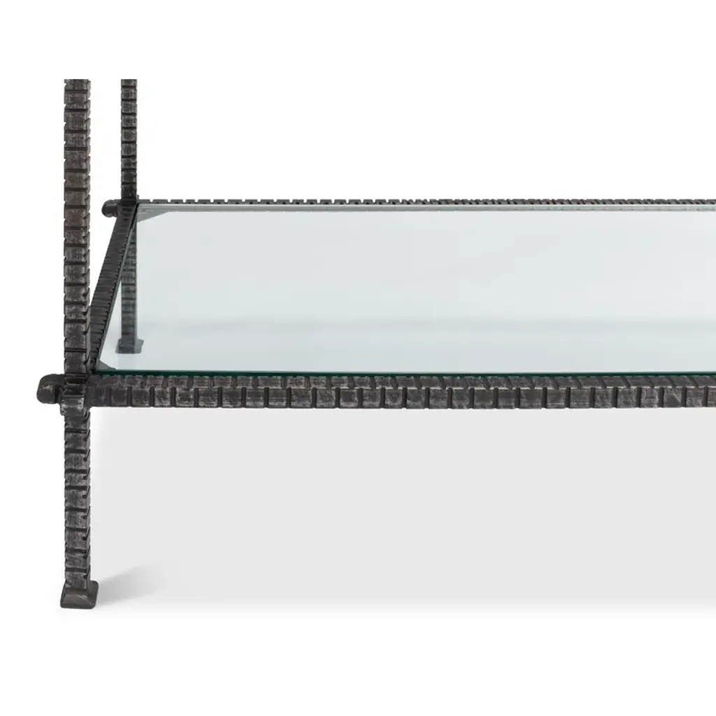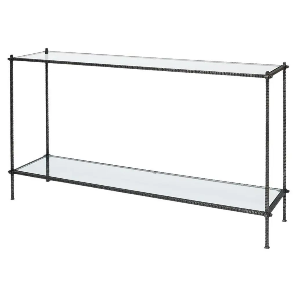 The frame of our Hand Chased Iron Console Table is solid iron bar stock that is hand wrought and incised with continuous ridges on all 4 sides. The 3 points corners are an amazing example of the craft of making wrought iron.