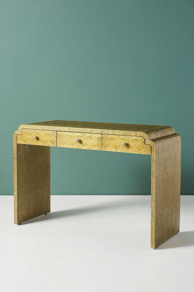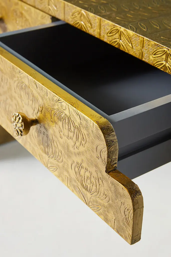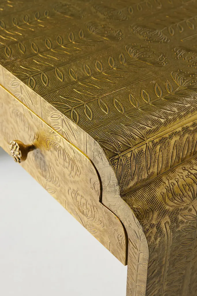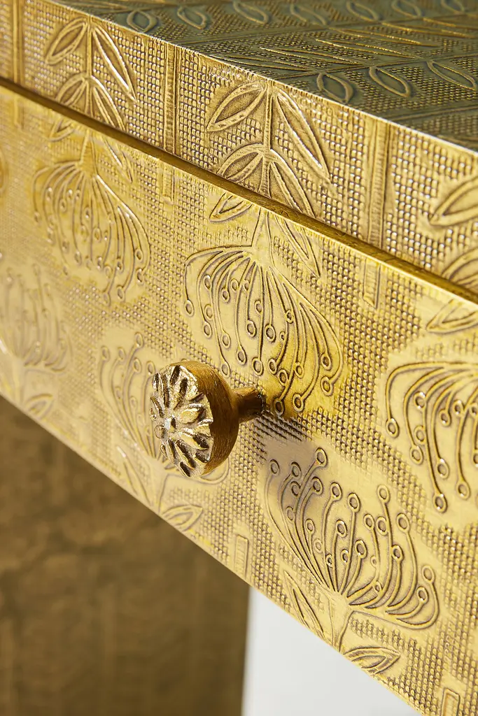 Intricate hand-embossed metal and a subtle finished shine give this eye-catching console a hint of antique luxury. For ordering assistance and more, please contact us. For aesthetic advice and tips to help decorate your space, enjoy our complimentary home styling services.