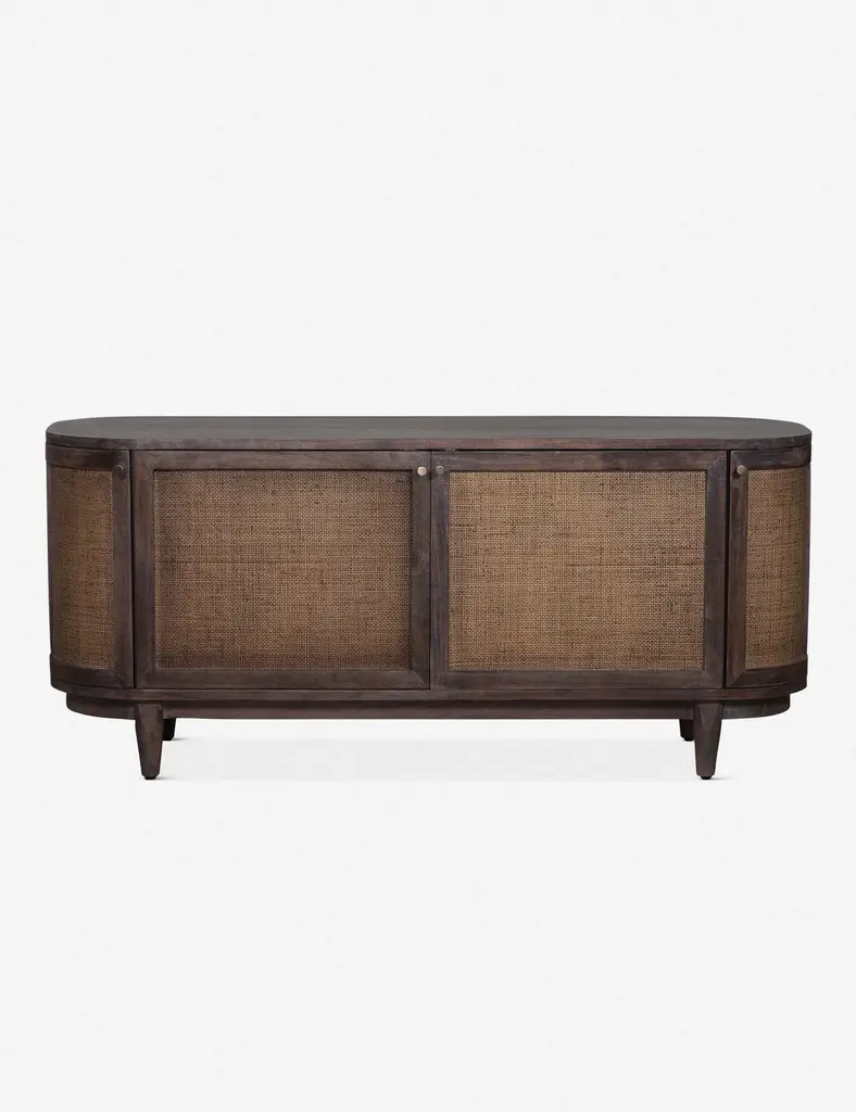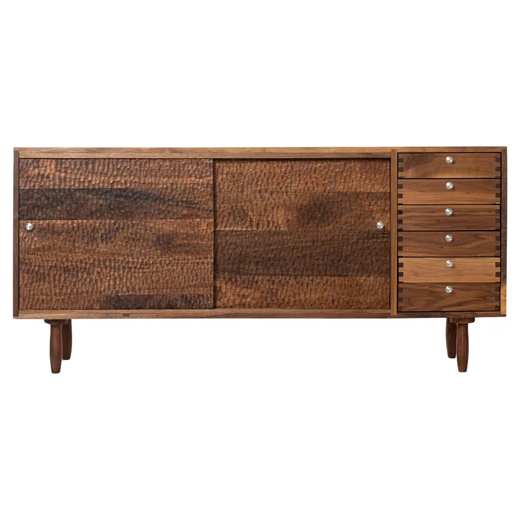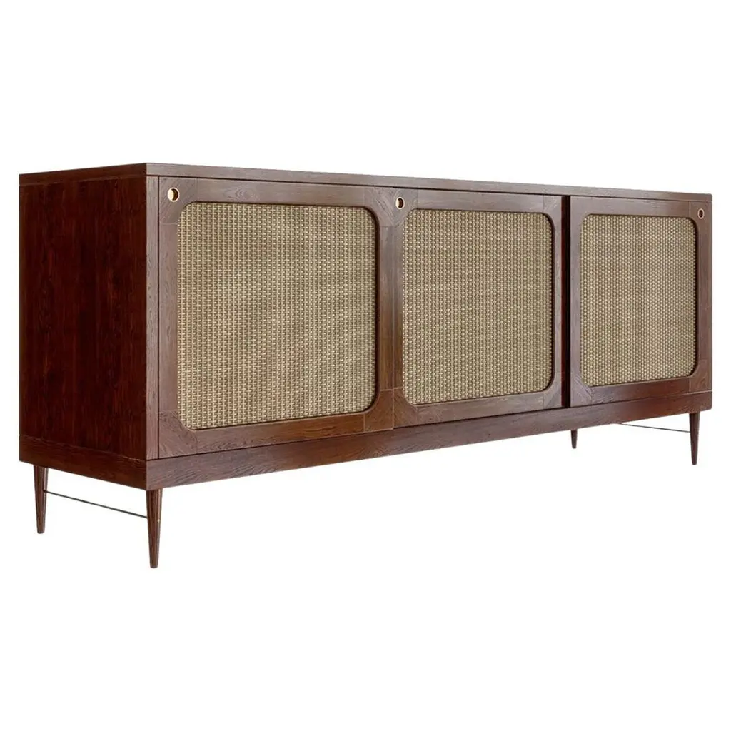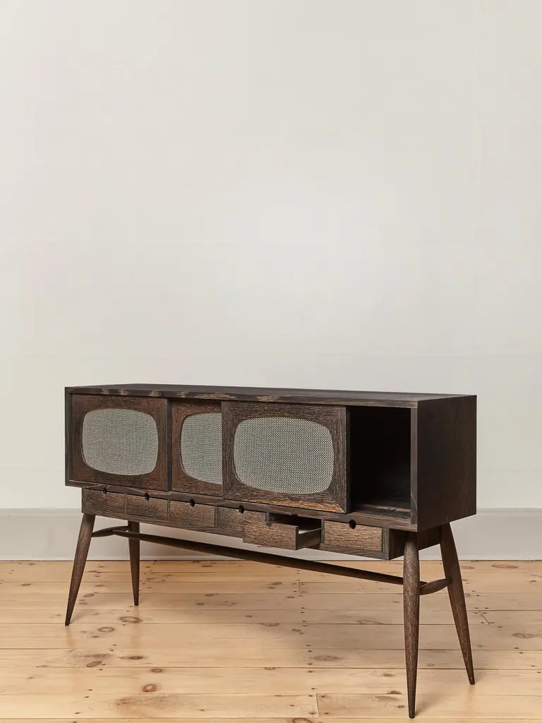 The Devon TV console is a modern take on mid-century storage. The naturally oxidized (blackened) oak console features slender turned legs and rails; genuine Marshall speaker grill cloth in its three sliding doors and 6 natural leather lined drawers. Natural oil finish.This piece can be customized upon request.