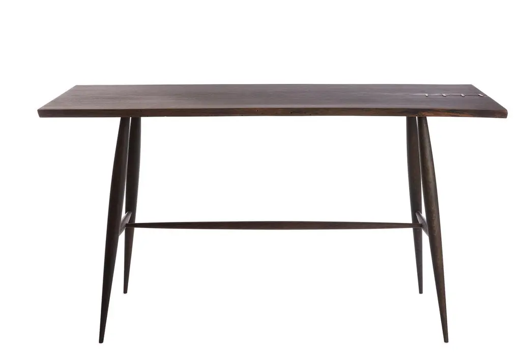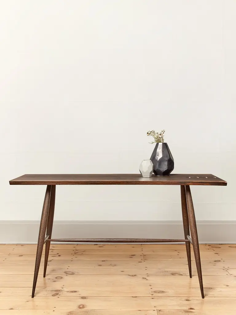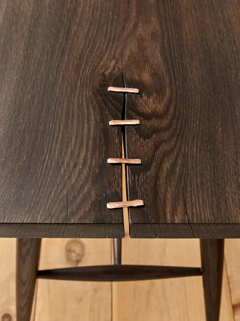 The Devon Mended console features a slender and subtle live edge slab top. Hand hammered copper staples secure the natural cracks in the wood. The slender turned legs and rails are carved to gentle tapers. Naturally oxidized (blackened). Natural oil finish. Designed by Daniel Oates in 2016.Customization available.