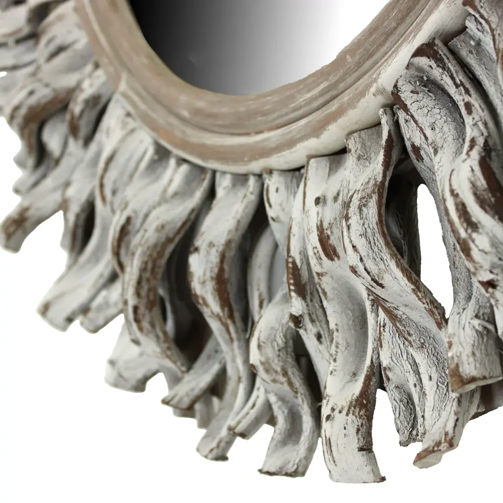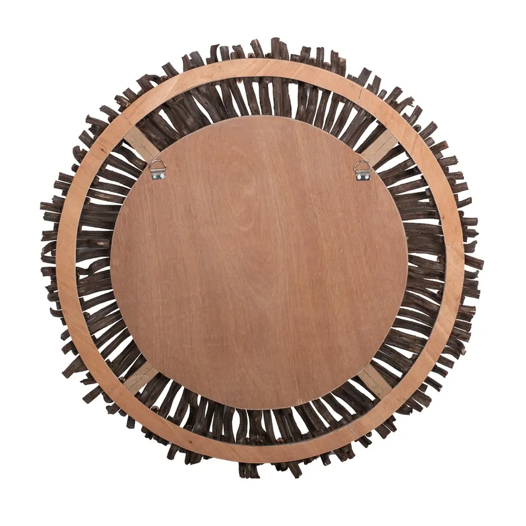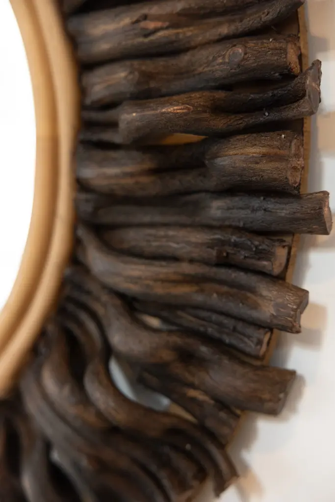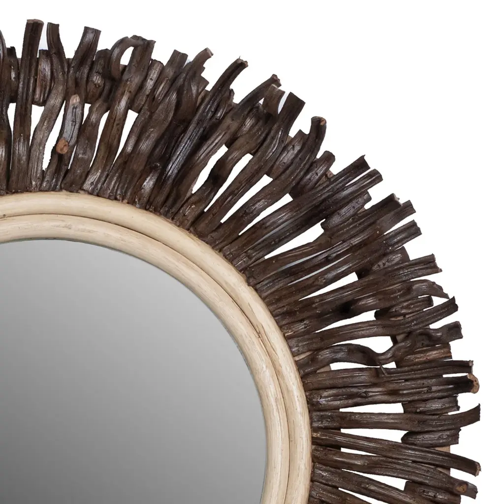 This round rattan starburst mirror is designed to make a bold statement. Constructed with a sustainable rattan frame and hanging root detail, the handpainted brown or whitewash finish highlights the raw beauty of the organic root. Hang it above a living room mantle, sideboard, console table, or dresser to bring drama and depth to your living space.