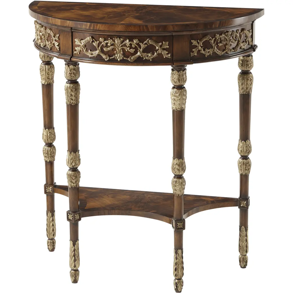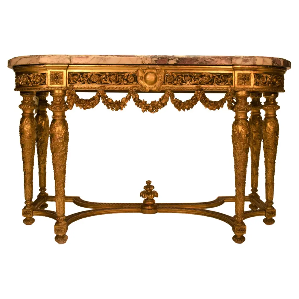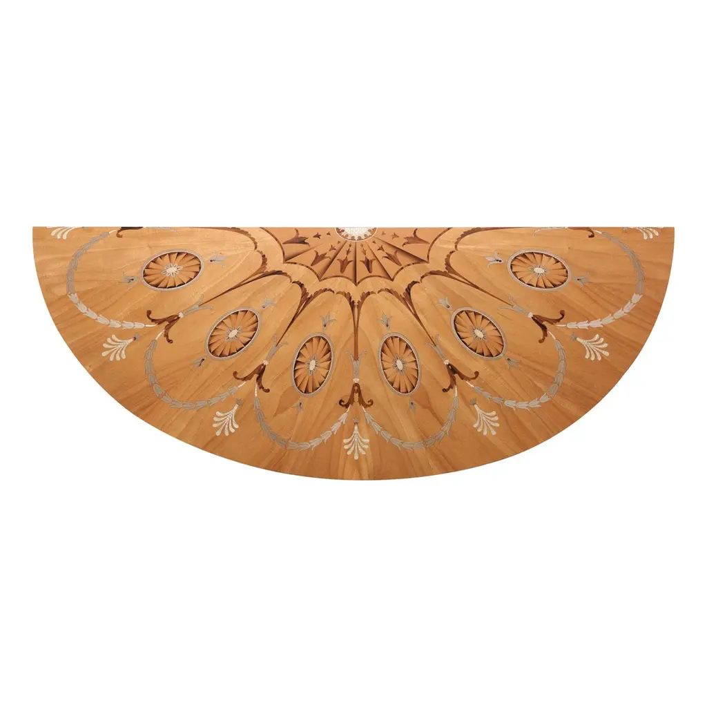 A fine Chippendale George III design fruitwood, tulipwood, marquetry and giltwood pier table. The semi-elliptical top centred to the rear edge by a sunflower and fan motif with six oval patera framed within bell-flower garlands and anthemia with a rosette and bell-flower border and tulipwood cross bandings. The carved giltwood frieze of rosettes on patera-headed blocks flanking stylised shells and foliate scrolled aprons on slender leaf and guilloche carved fluted tapering legs. The original table was made by Thomas Chippendale for Harewood House and is often considered to be the finest of its type.Bespoke sizing, design adaptations and finishing available.We are currently working to a 30-36 week lead time.