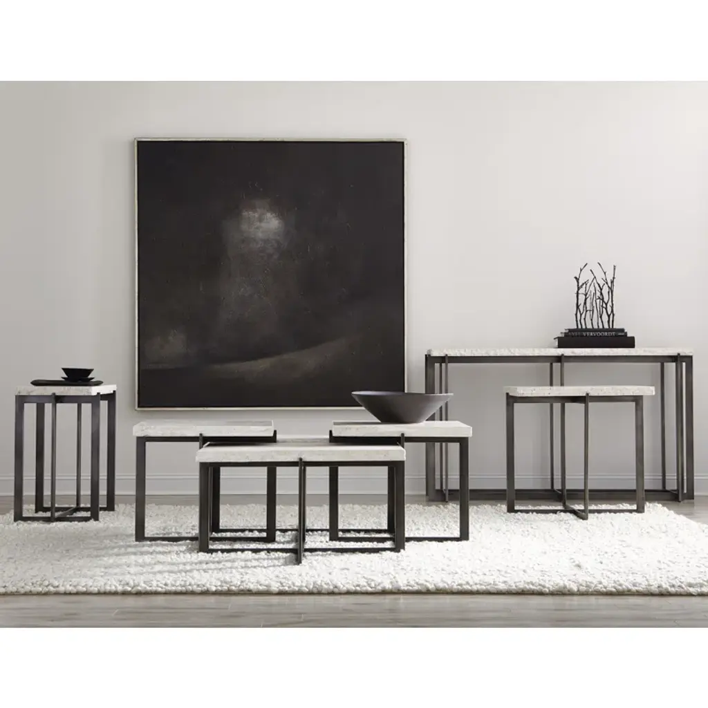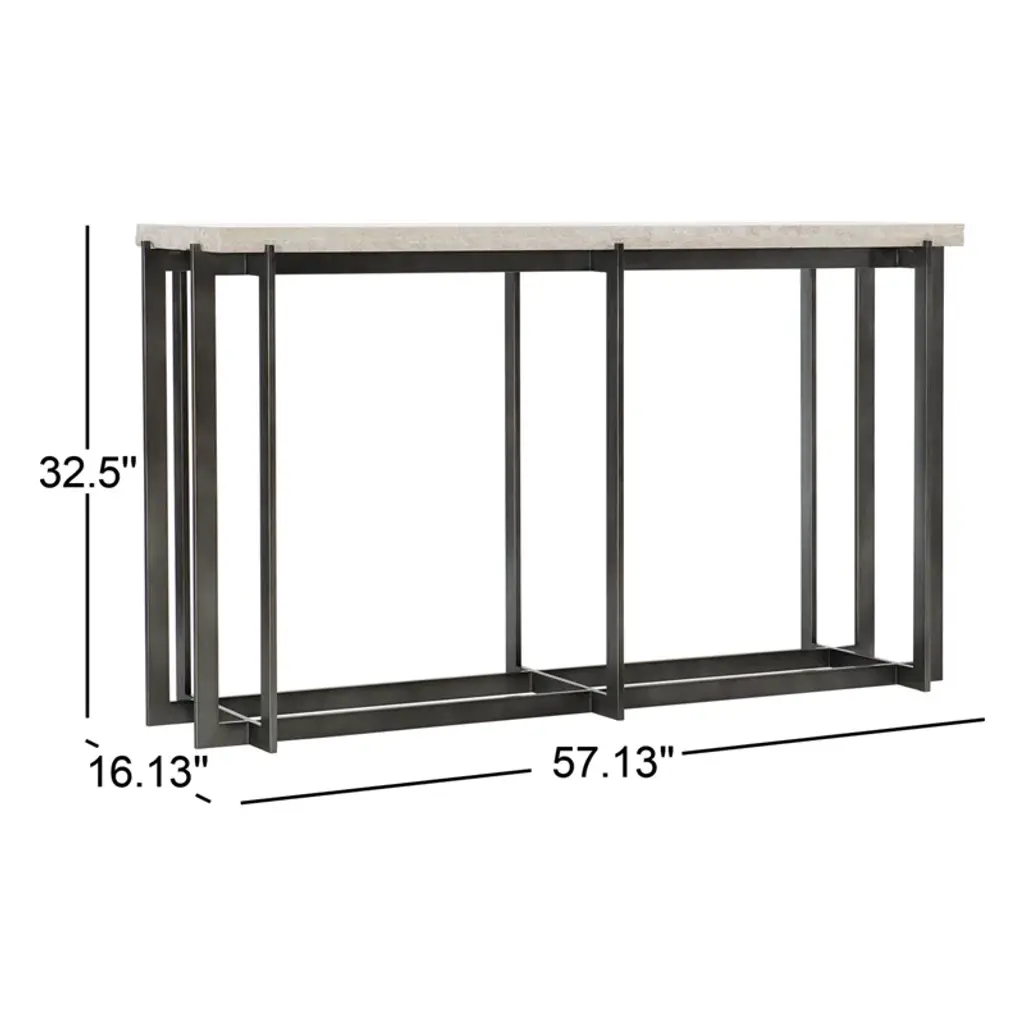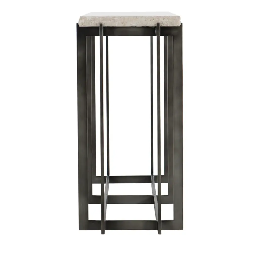 Bernhardt Occasional offers upscale designs for luxe living spaces. The Hathaway console table presents contemporary style with geometric leanings. With origins in mid-century design, the sleek tubular steel base provides structural stability and clean, bold lines. An oil-rubbed bronze finish on the base creates an engaging contrast with the white travertine stone top, which features a chiseled edge.